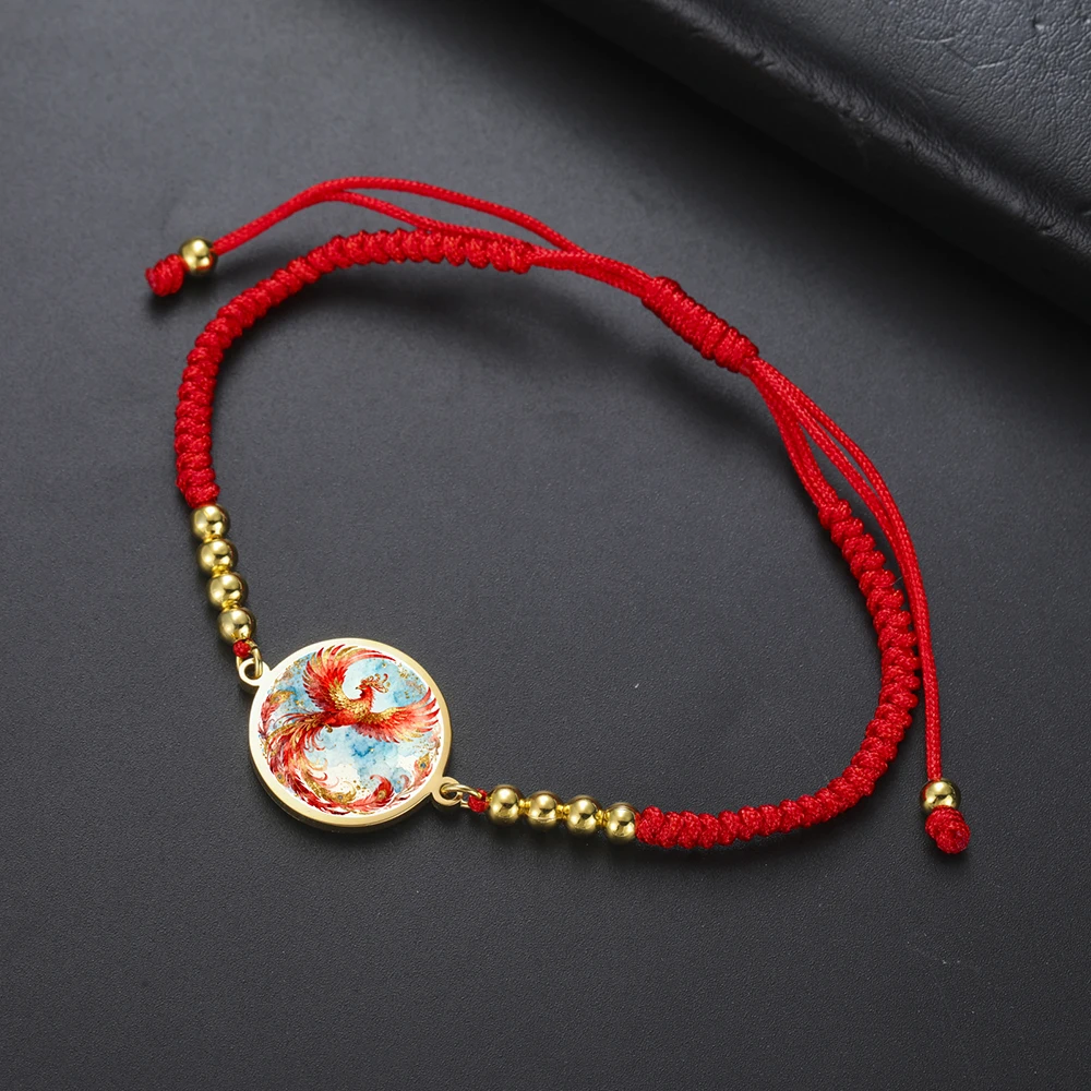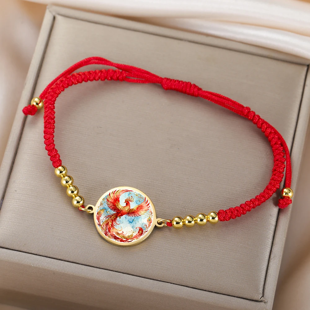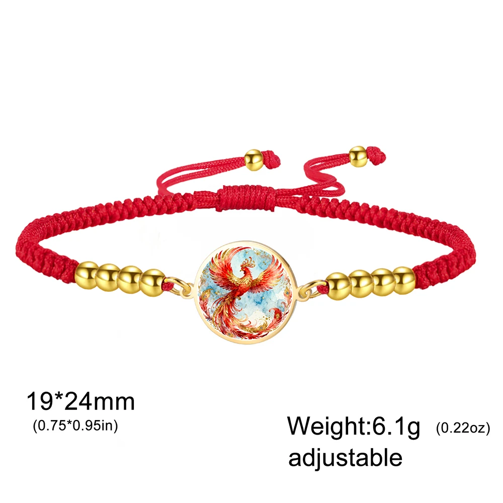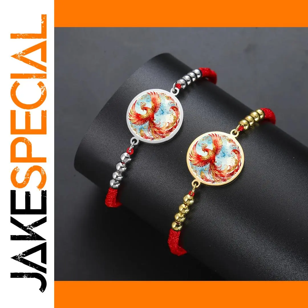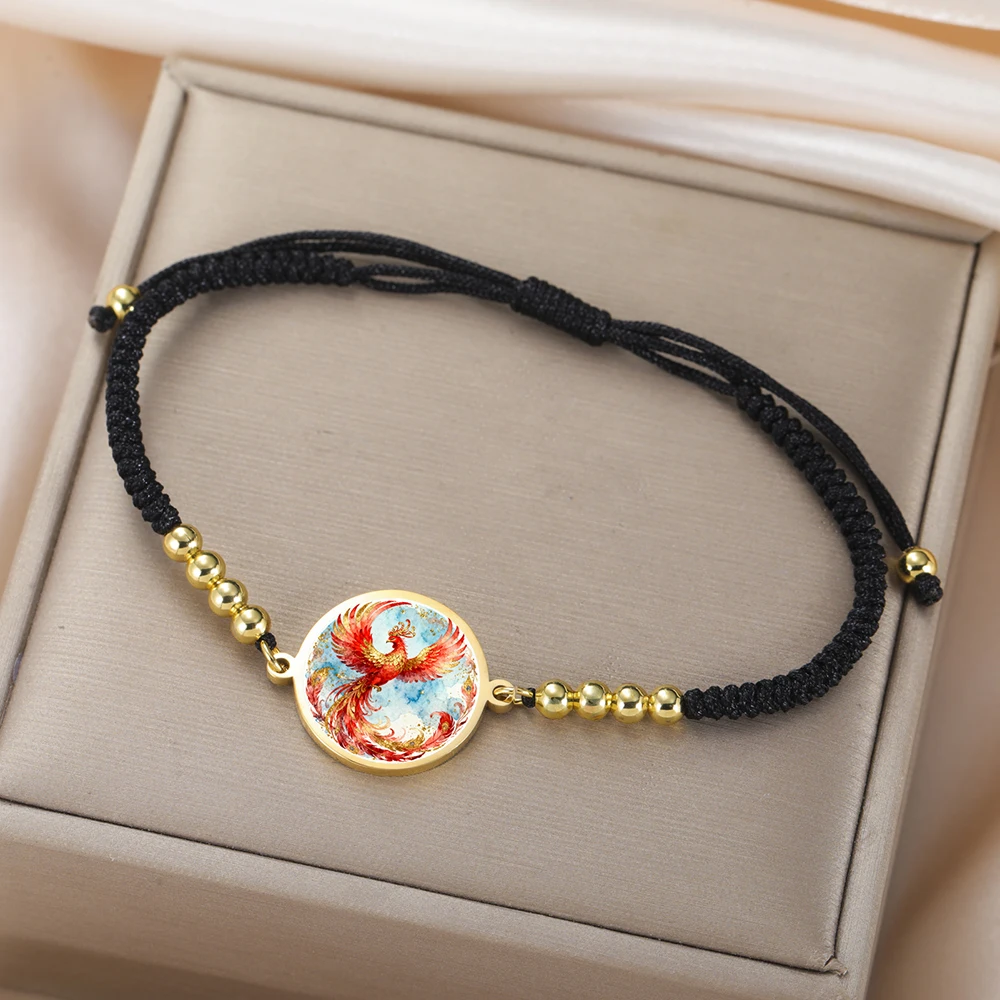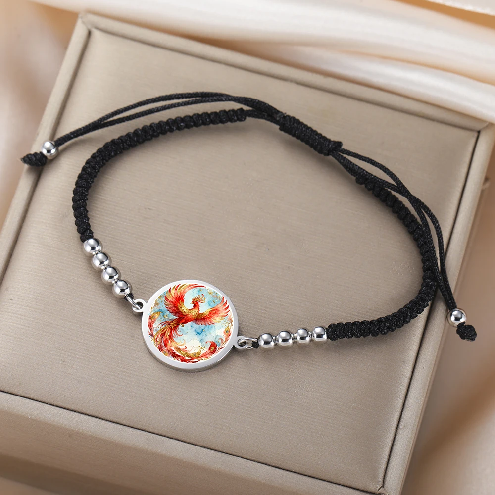 Experience the elegance and powerful symbolism of this beautifully crafted phoenix bracelet. Designed with vibrant, mythical-inspired artwork, it showcases a round central pendant featuring a dynamic phoenix motif in fiery shades of red, orange, and gold. The swirling background of blue and white evokes clouds and flames, symbolizing resilience and renewal. Made of durable stainless steel, the bracelet combines a braided rope chain in vivid red or sleek black with metallic beads matching the pendant’s colors for an eye-catching look. The adjustable toggle clasp ensures a perfect fit for any wrist size, making it a versatile accessory suitable for men, women, and couples. Whether for daily wear or special occasions, this bracelet makes a meaningful statement that resonates personally and stylishly.