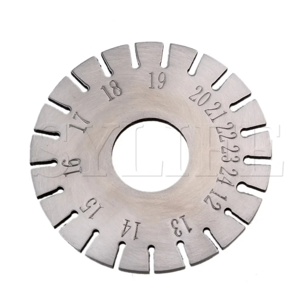 - Designed to measure steel music wire from size No. 12 to No. 24, with clear engraved markings around the outer edge and decimal equivalents on the reverse side for quick reference during tuning sessions.