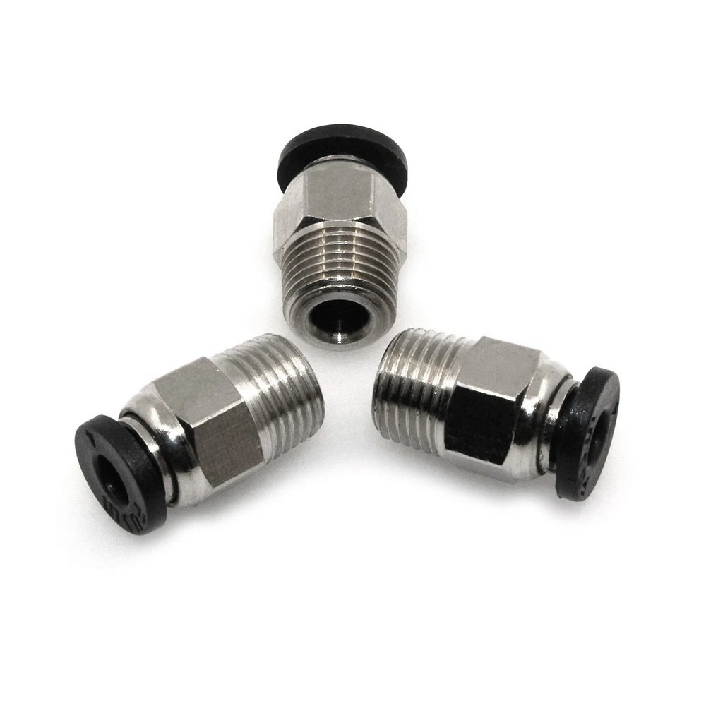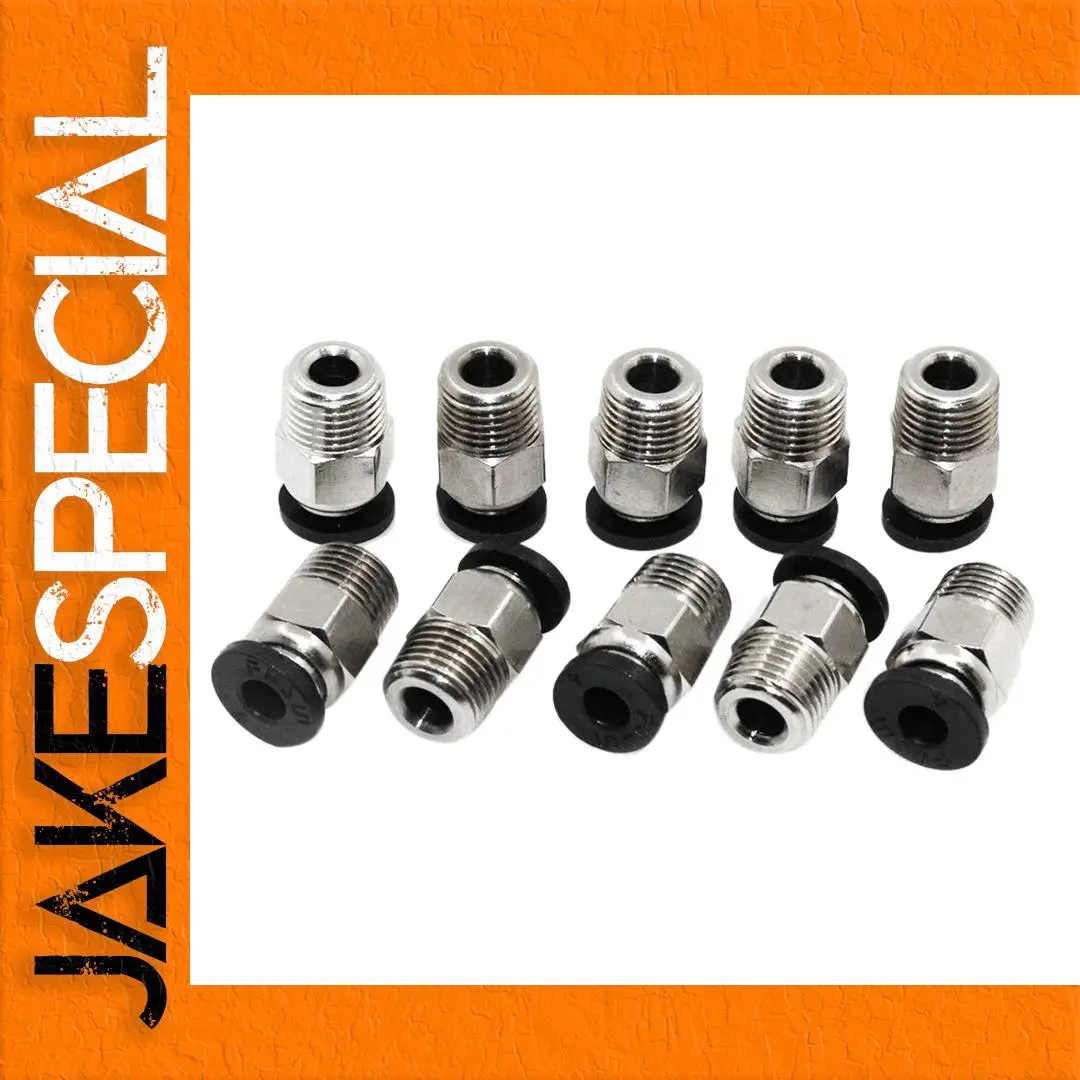This pack of 10 stainless steel male straight pneumatic connectors features a 4 mm tube connection diameter and an M10 threaded end with a 9.6 mm pitch, designed for use with PTFE tubing. Featuring a push-to-lock mechanism, these self-locking fittings allow for quick and secure connections and easy disconnections, making them ideal for Bowden extruders in 3D printers. Crafted from oxidation and rust-resistant stainless steel, they ensure durability, corrosion resistance, and long-lasting performance. Perfect for enhancing your 3D printing setup, these connectors combine precision engineering with a sleek metallic aesthetic, providing a reliable and professional solution for your pneumatic connection needs.