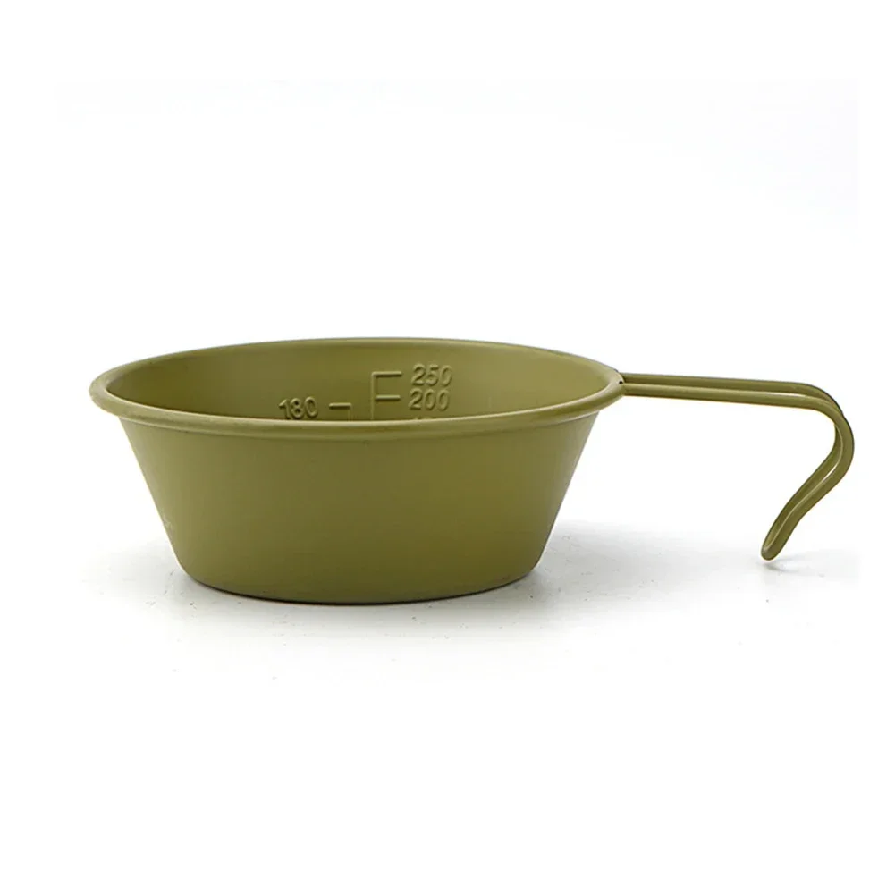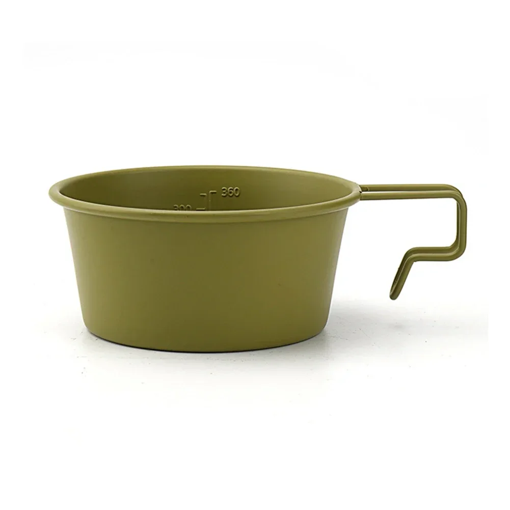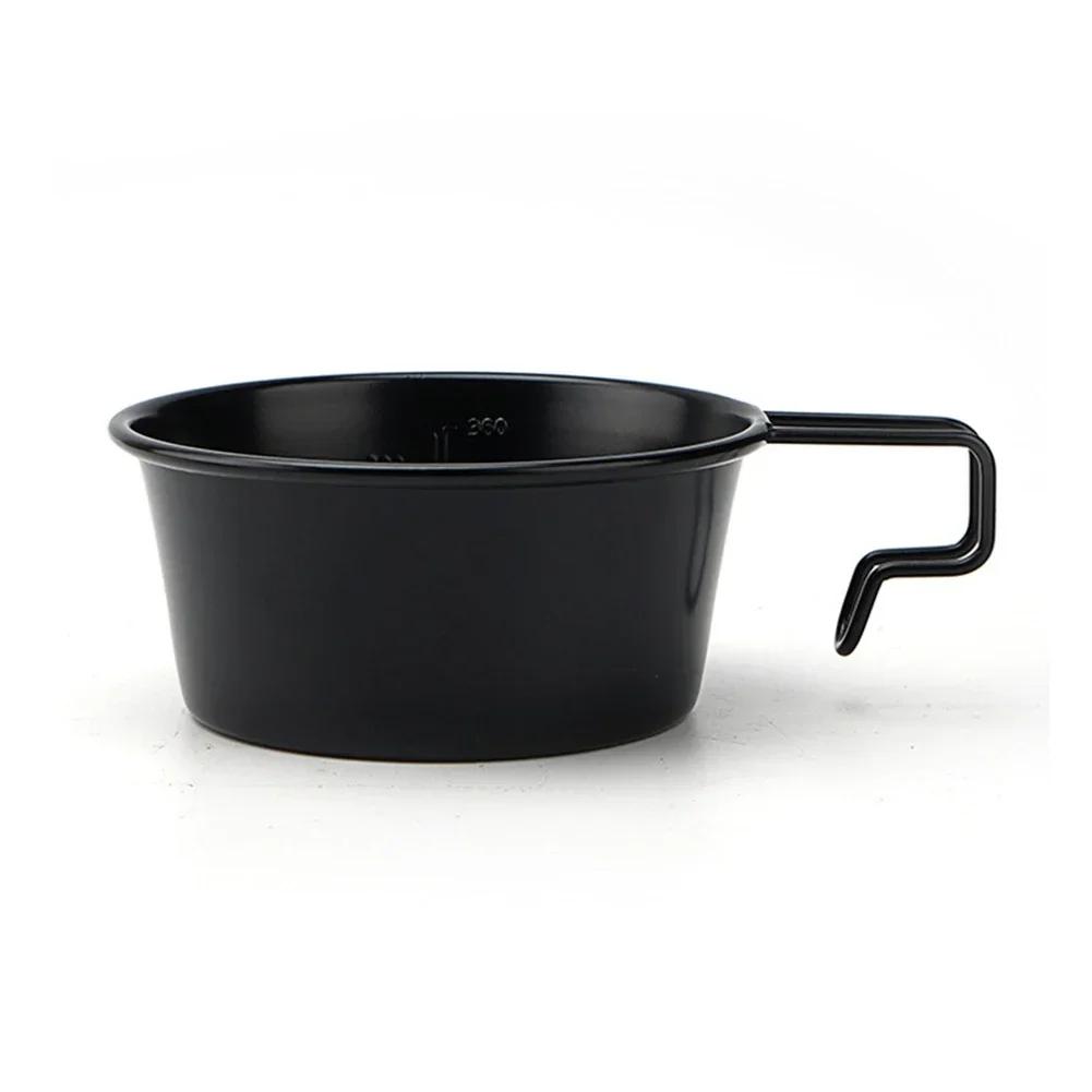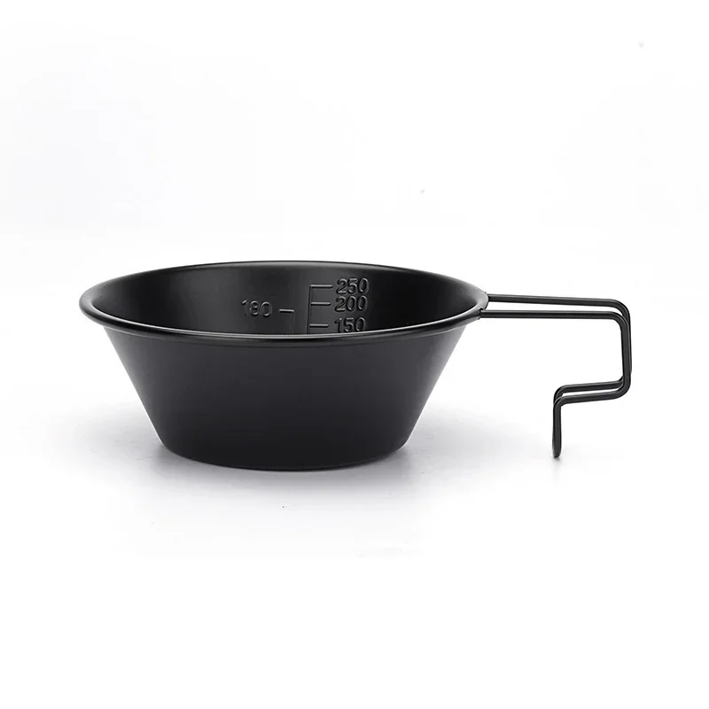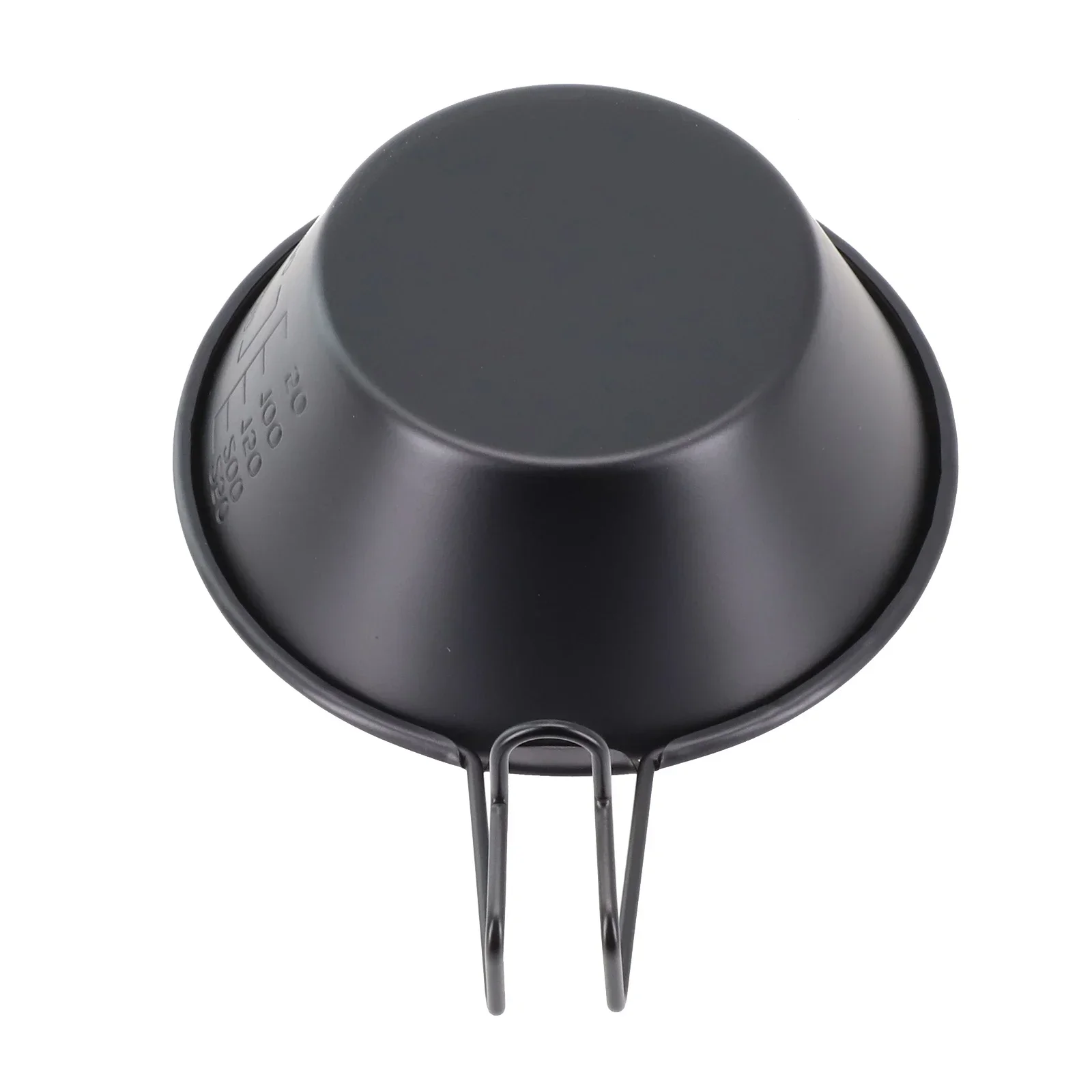 Experience the convenience and durability of this this portable camping bowl, expertly crafted from high-quality 304 stainless steel with a 0.5mm thick wall. Its sleek matte finish and minimalist design make it both stylish and practical for outdoor cooking, camping, or even home use. The bowl features vibrant color options like deep black or muted green, adding a touch of style to your outdoor gear. Its rounded, slightly conical shape with a smooth, curved rim ensures comfortable handling and pouring. The ergonomic handle, matching the bowl's color, extends outward and bends downward into a hook, making storage effortless. Inside, measurement scales allow precise ingredient or liquid measurement, perfect for cooking and outdoor activities. Its lightweight and compact design ensure portability and easy cleaning, ready to accompany your next adventure.