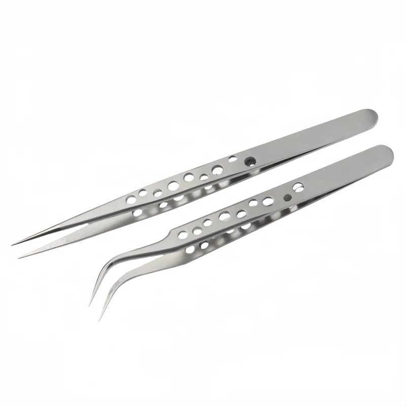 Experience the ultimate in precision and craftsmanship with this high-quality stainless steel tweezers set. Designed for detailed electronics and mobile phone repairs, these tools offer superior grip and control. The set includes two tweezers: one with a curved tip for versatile gripping angles and another with a straight, flat tip for pinpoint accuracy. Crafted from durable, corrosion-resistant stainless steel, they feature a polished, shiny finish that reflects their quality. The slender, ergonomic design, along with evenly spaced circular holes along the shafts, ensures a comfortable grip and light weight. Perfect for delicate tasks, these tweezers bring a professional touch to your repair toolkit, making intricate work more manageable and precise.