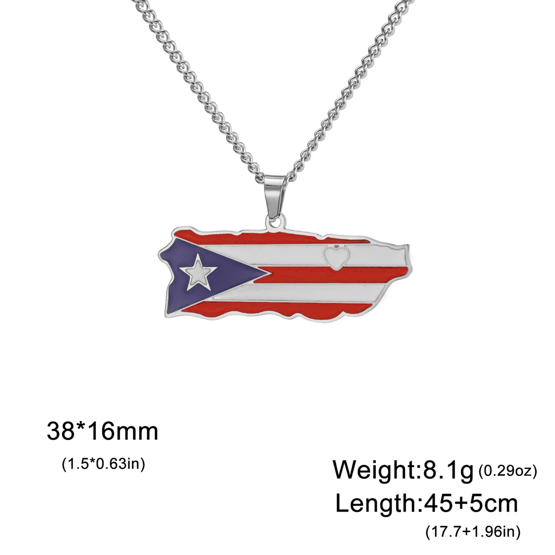 - The pendant, approximately 38 x 16 mm, features a drip oil style Puerto Rico map with detailed patriotic flag pattern, adding vibrancy and uniqueness.