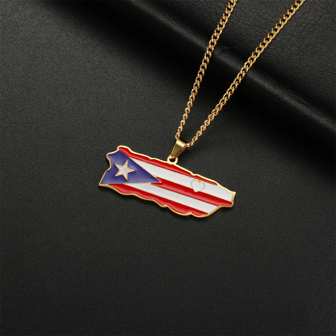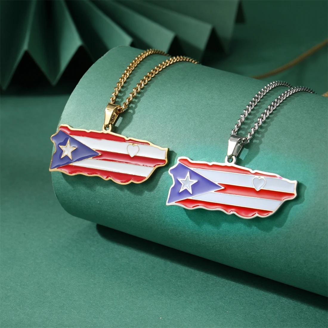 Elevate your accessory game with this stunning stainless steel necklace featuring a chic Puerto Rico map pendant. Its sleek, polished chain offers resistant durability against rust, corrosion, and fading, ensuring long-lasting shine. The pendant, crafted in a modern drip oil style, highlights intricate details of the Puerto Rico map with textures that resemble spilled oil or liquid droplets. Decorated with a patriotic flag pattern, including red and white stripes, a blue triangle, and a white star, it makes a bold yet elegant statement. Available in both silver and gold finishes, this unisex piece suits casual, formal, or celebratory occasions, making it perfect for gifting or personal style.
