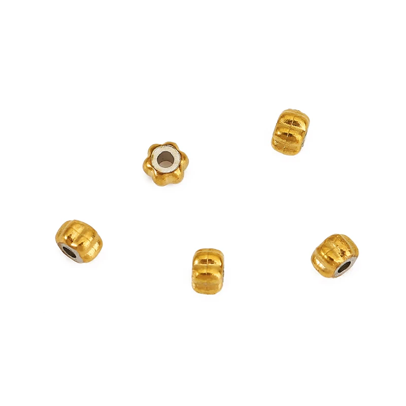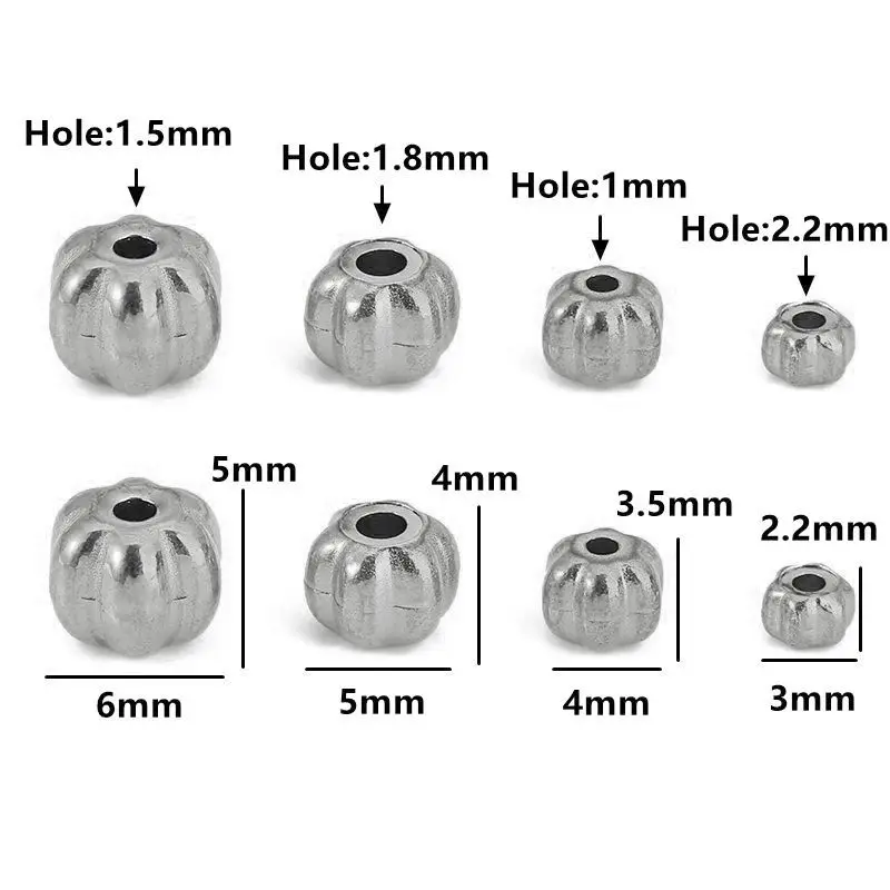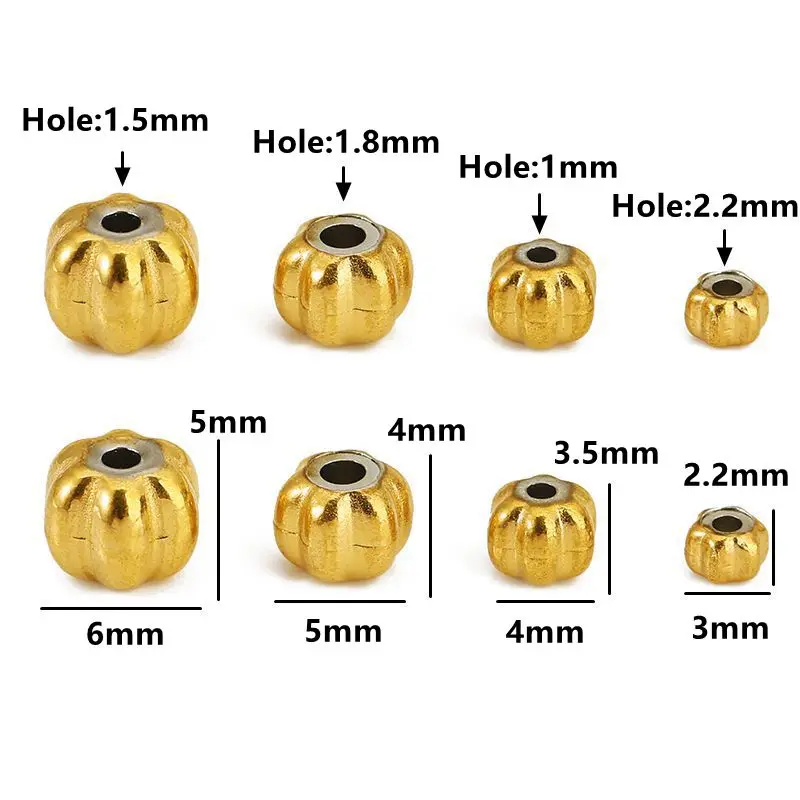 Imagine your jewelry creations coming to life with these elegant pumpkin-shaped spacer beads. Crafted from high-quality stainless steel with a sleek PVD finish, they add a touch of whimsical sophistication. Available in stunning gold or cool steel tones, these beads reflect light beautifully, giving your designs a polished, professional look. Their rounded, ridged shape resembles tiny pumpkins, perfect for adding festive charm to bracelets, necklaces, or DIY charms. With precise sizes ranging from 3mm to 6mm, these versatile beads fit common jewelry findings effortlessly. Their lightweight design makes for comfortable wear, while the durable metallic finish ensures longevity. Elevate your jewelry projects and bring your creative ideas to fruition with these eye-catching, high-quality spacer beads.