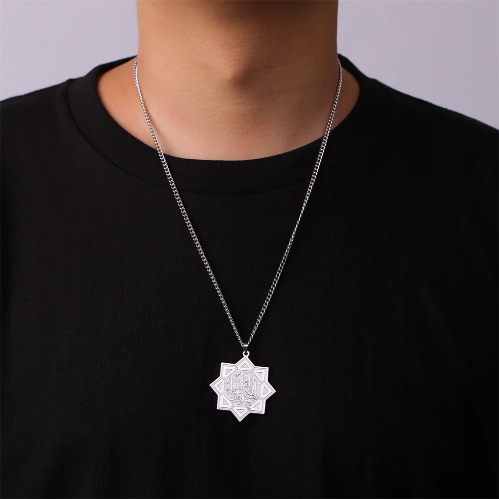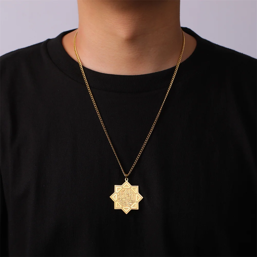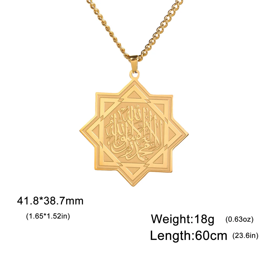 This stainless steel unisex Islamic star pendant necklace features a 41.8 x 38.7 mm intricately designed Arabic calligraphy, symbolizing faith and artistry. Complemented by a 60 cm classic link chain available in silver and gold tones, the durable, rust-resistant, hypoallergenic, and non-fading stainless steel ensures long-lasting beauty. Its fashionable, vintage-inspired style makes it suitable for various occasions such as parties, weddings, and gifts, offering a meaningful blend of religious symbolism and elegant design. Perfect for those seeking a high-quality, stylish expression of faith that combines durability with sophisticated aesthetics.