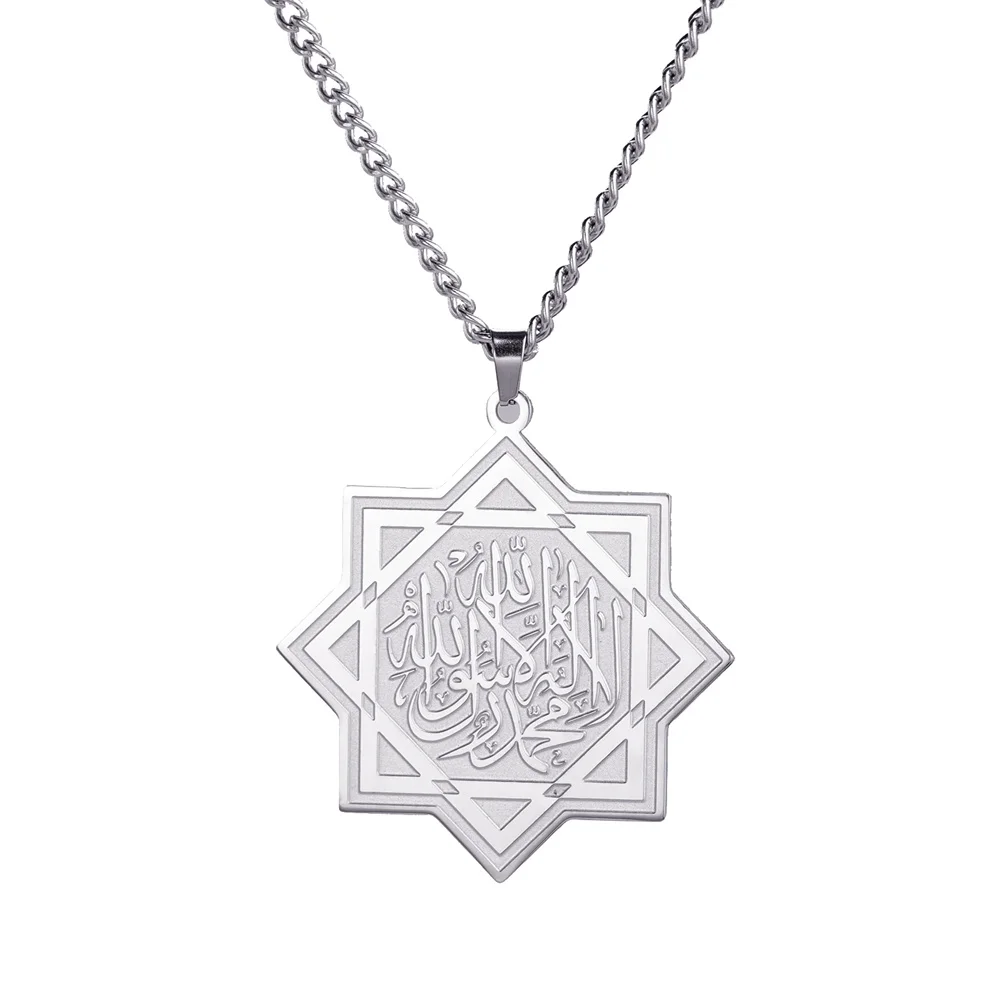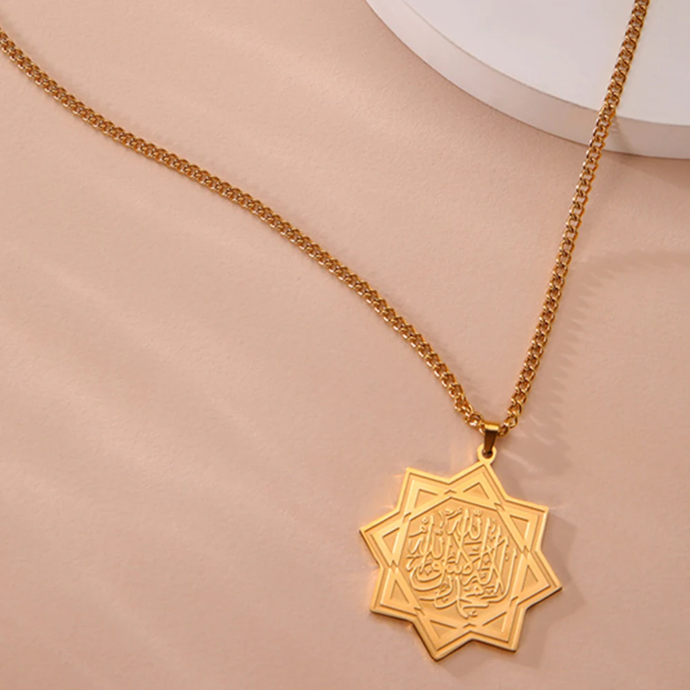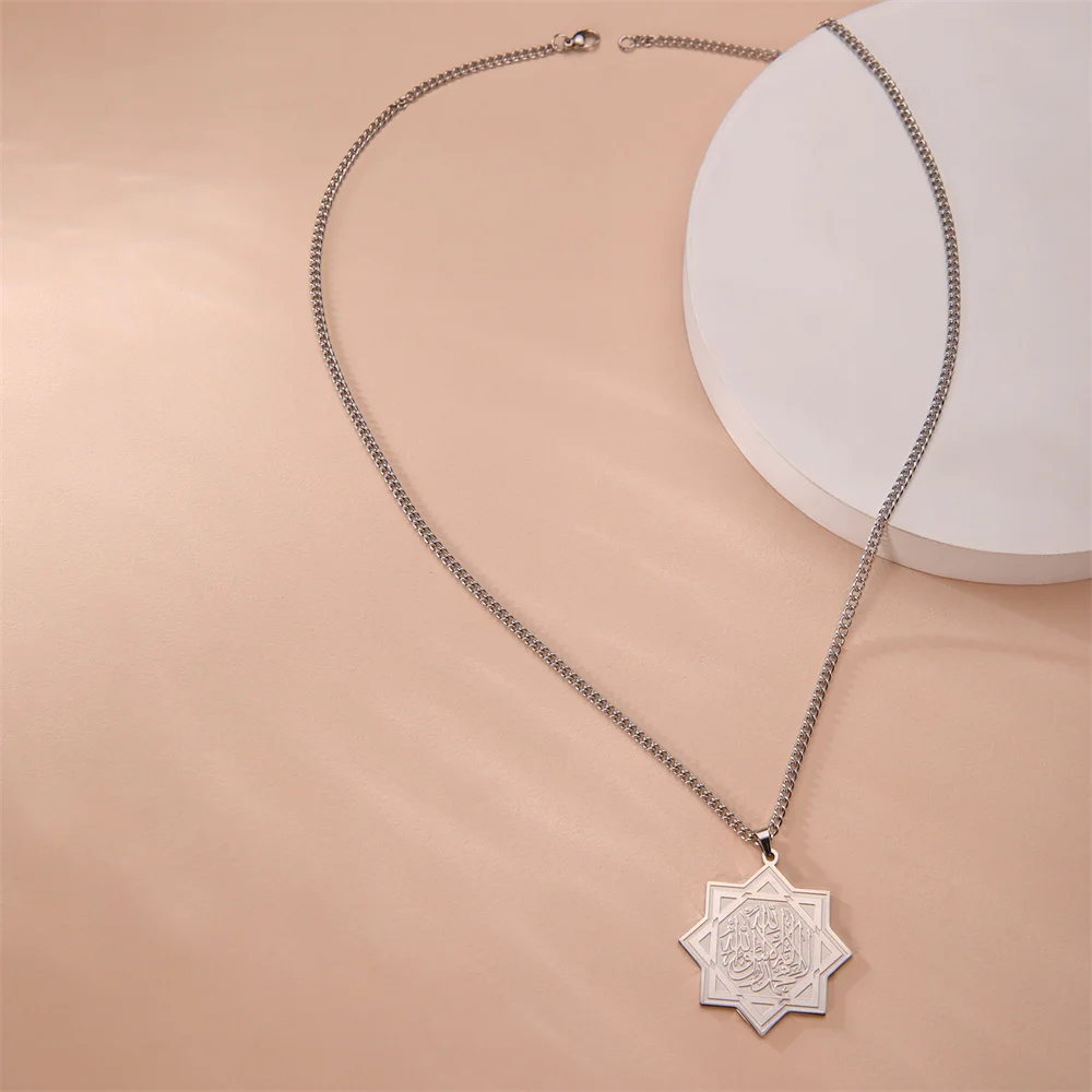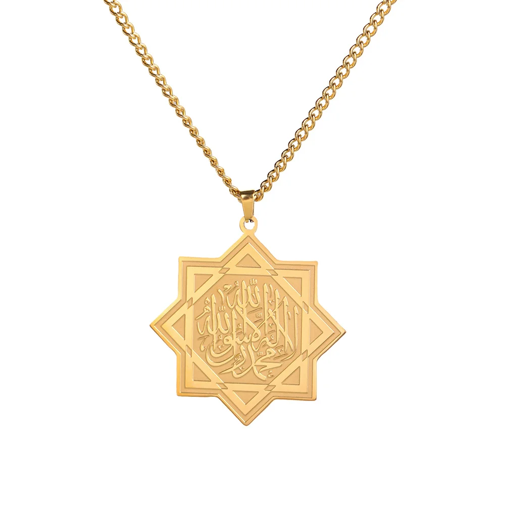 This stainless steel unisex Islamic star pendant necklace features a 41.8 x 38.7 mm intricately designed Arabic calligraphy, symbolizing faith and artistry. Complemented by a 60 cm classic link chain available in silver and gold tones, the durable, rust-resistant, hypoallergenic, and non-fading stainless steel ensures long-lasting beauty. Its fashionable, vintage-inspired style makes it suitable for various occasions such as parties, weddings, and gifts, offering a meaningful blend of religious symbolism and elegant design. Perfect for those seeking a high-quality, stylish expression of faith that combines durability with sophisticated aesthetics.