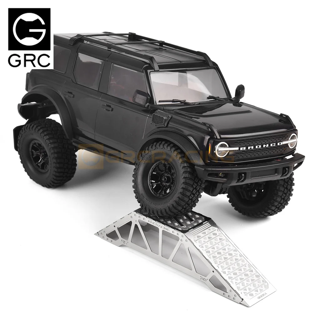 Imagine elevating your remote control vehicle scene with this sleek obstacle ramp, crafted from durable stainless steel. Its modern industrial aesthetic, featuring textured crosshatch surfaces for traction, seamlessly blends rugged functionality with contemporary design. The ramp's simple bending structure allows you to create different slopes on each side, adding versatility and challenge to your vehicle’s obstacle course. With its lightweight open-frame design, adorned with angular triangular cut-outs, it offers both strength and ease of use. The engraved branding adds a touch of authenticity. Foldable for convenient storage, this ramp is perfect for enthusiasts looking to enhance their RC adventures with a refined, professional-looking obstacle element that fits multiple scale models.