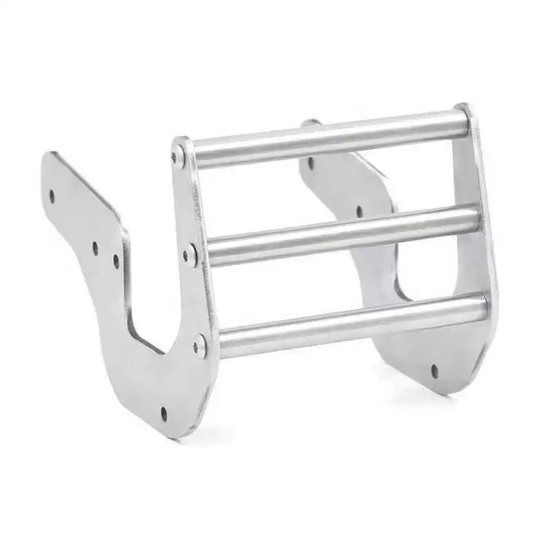 - Features a sleek, polished silver finish with a curved U-shaped design, enhancing both visual appeal and impact protection.