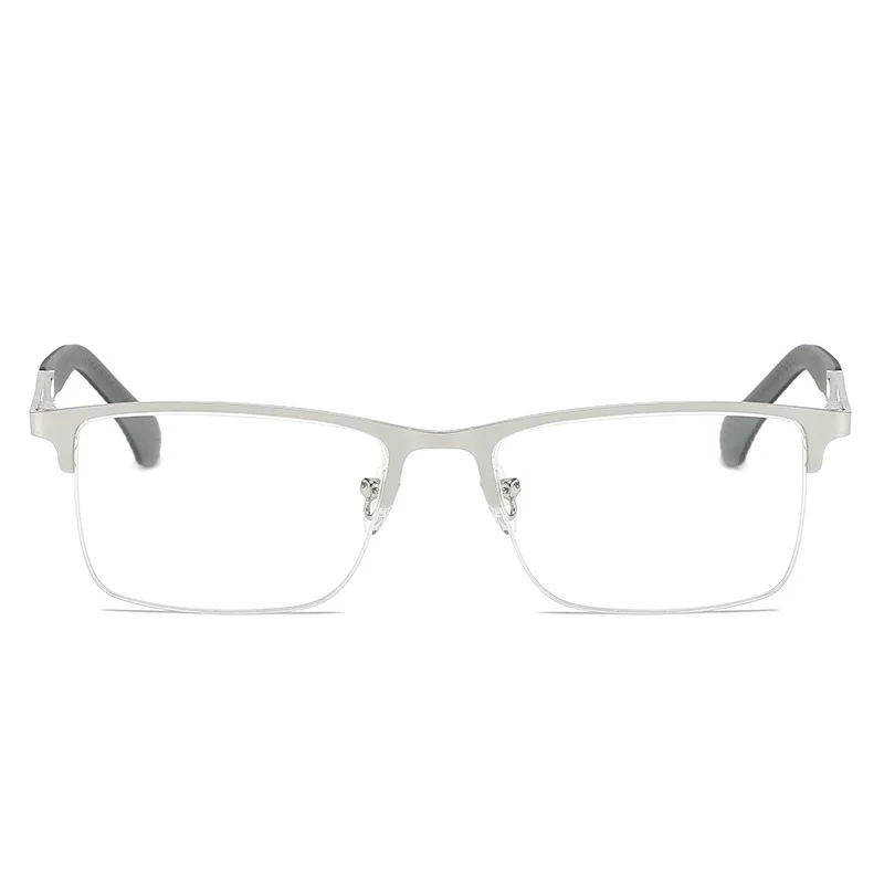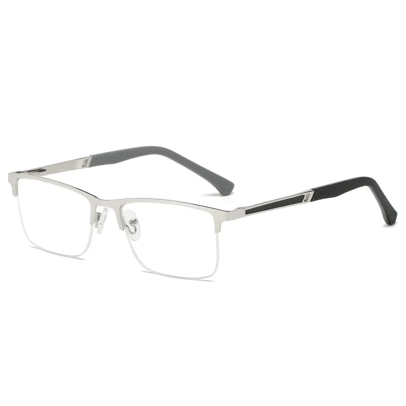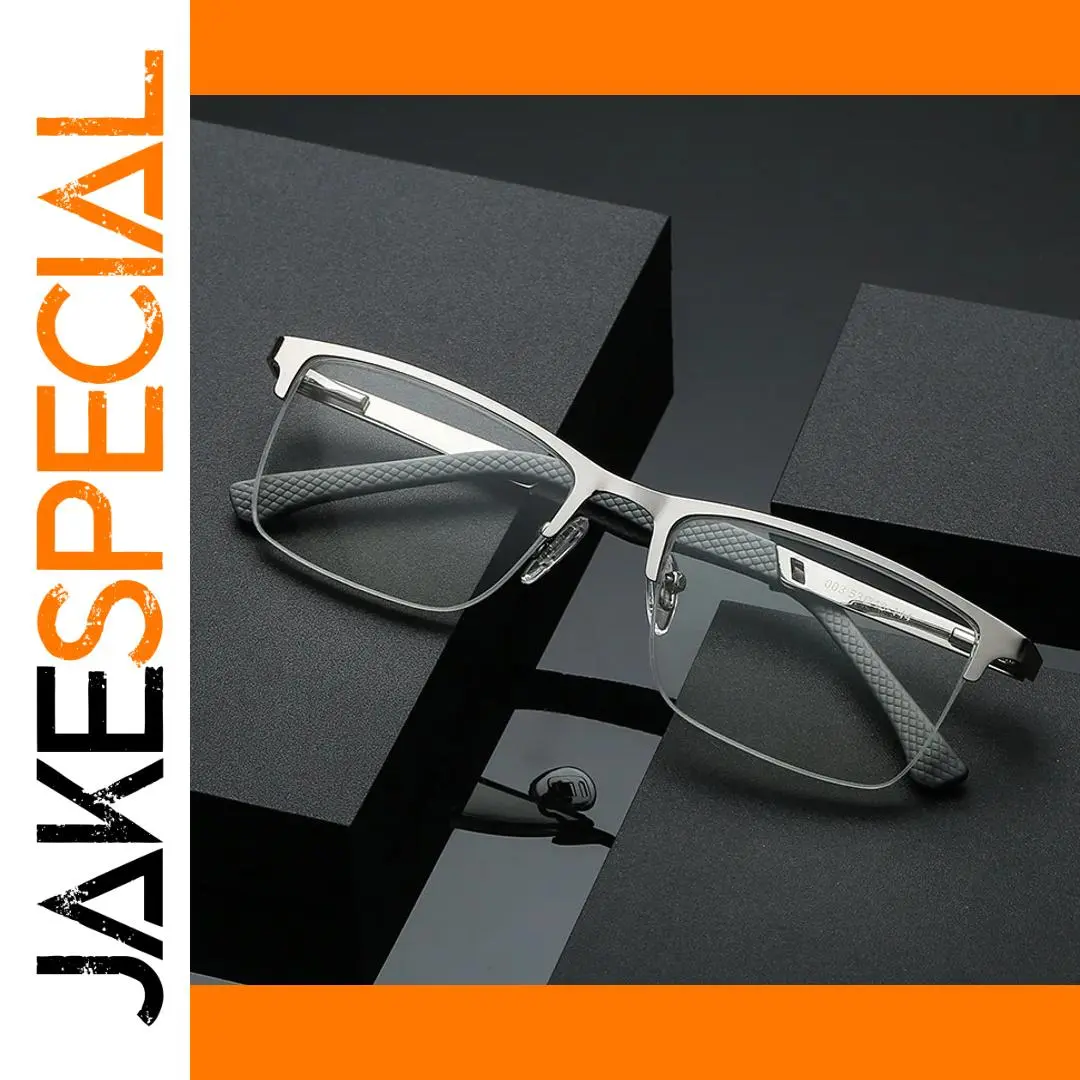 Experience modern elegance with these men’s reading glasses featuring a sleek stainless steel semi-rimless frame in a polished silver finish. Designed with rectangular lenses and softly rounded edges, they combine contemporary style with functionality. The slim, straight temples showcase a textured fish silk pattern for a fashionable touch, while the slightly curved temple tips made of rubberized material ensure a comfortable fit. Available in magnifications ranging from 100 to 400 diopters, these glasses offer effective anti-blue light protection, making them perfect for business use and screen viewing. Certified with CE, they blend eye protection, style, and sophistication for the modern professional.