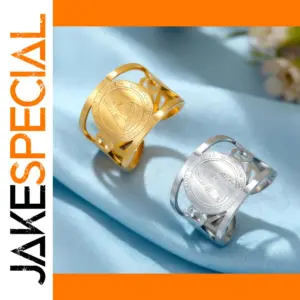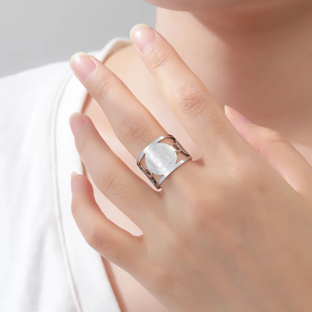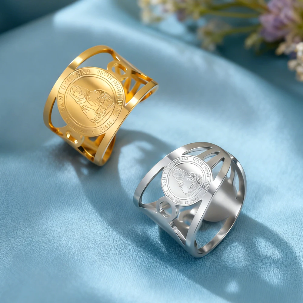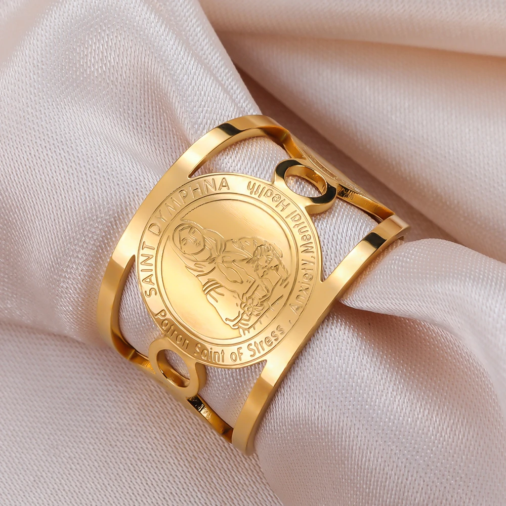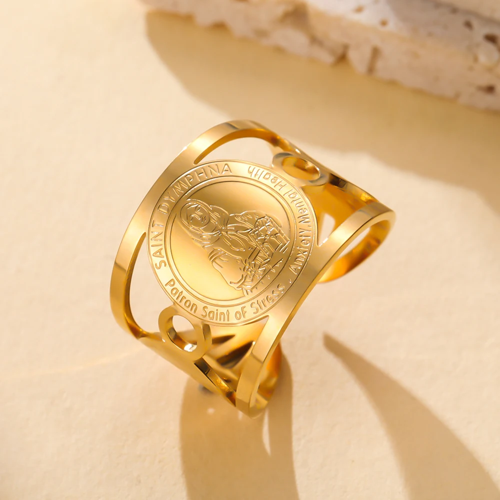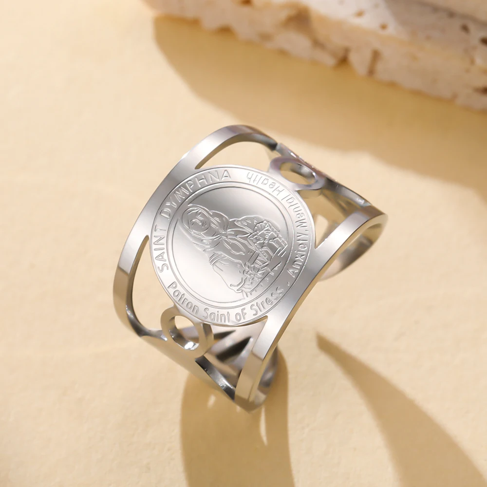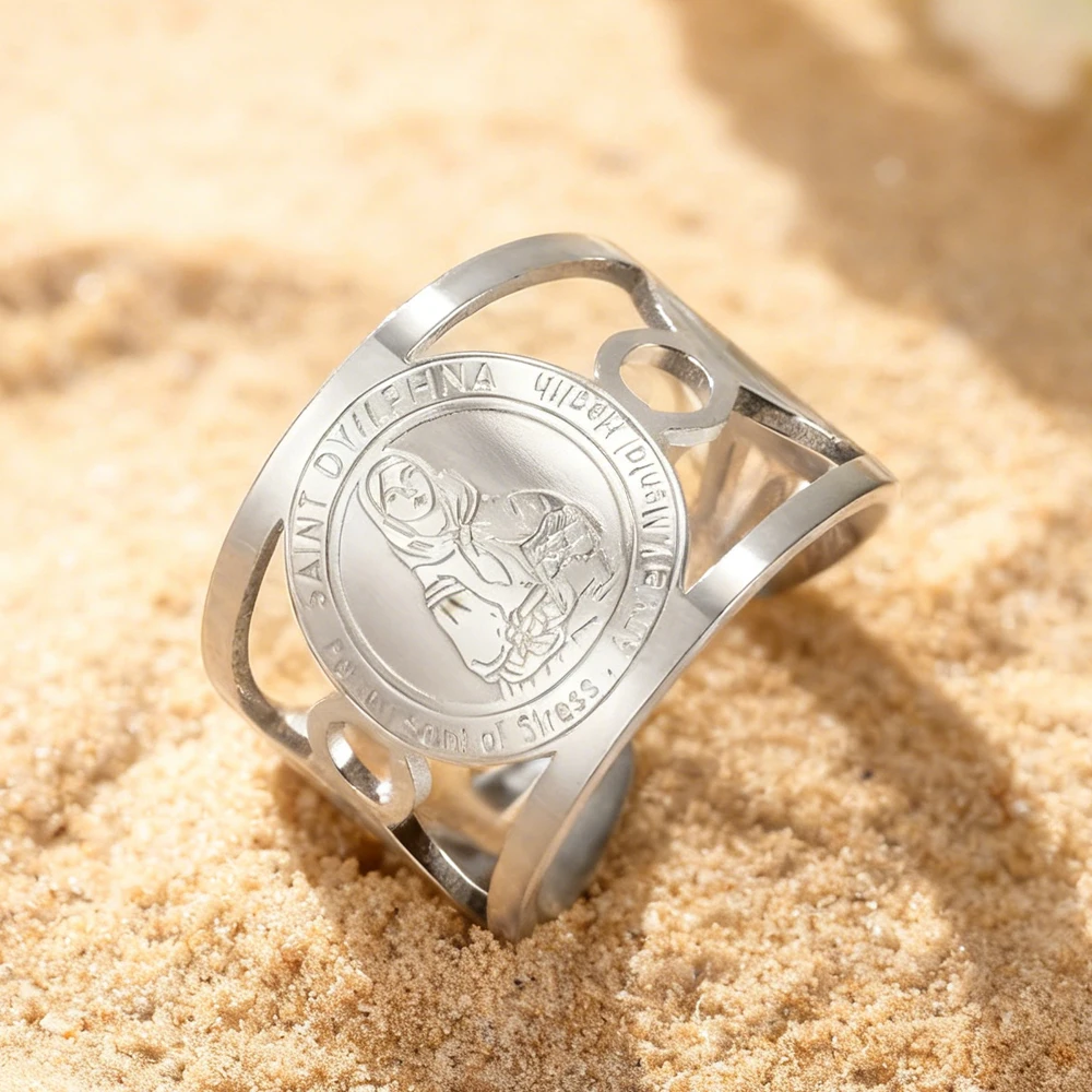 This adjustable stainless steel ring features a 16mm wide surface with a geometric design, available in steel and gold colors. Designed as a unisex religious protector and prayer blessing accessory, it showcases an intricate engraving of Saint Dymphna seated with a halo, surrounded by an inscribed circular border. The ring’s smooth, polished finish enhances its reflective appearance, making it suitable for men, women, and couples on occasions like Christmas or birthdays. Crafted without inlay or setting materials, it offers versatile compatibility and high-quality craftsmanship, embodying spiritual protection and stylish elegance in a timeless jewelry piece.