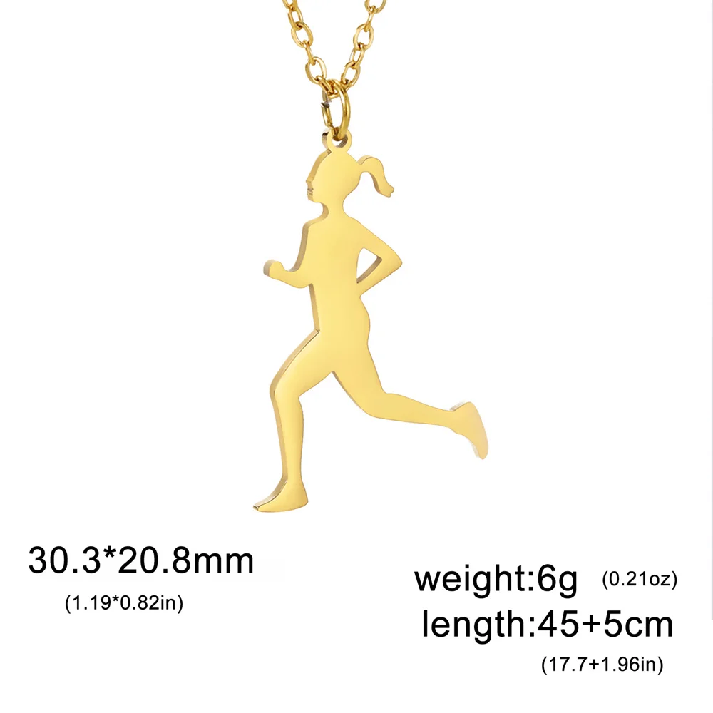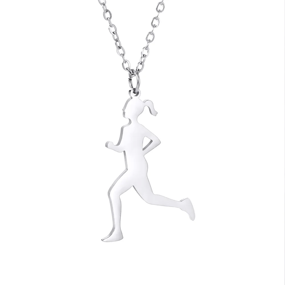 - This unisex necklace features a 30.3 x 20.8 mm pendant with a stylized running girl in a sporty pose, emphasizing movement and youthful energy. The smooth, polished surface adds a touch of shine.