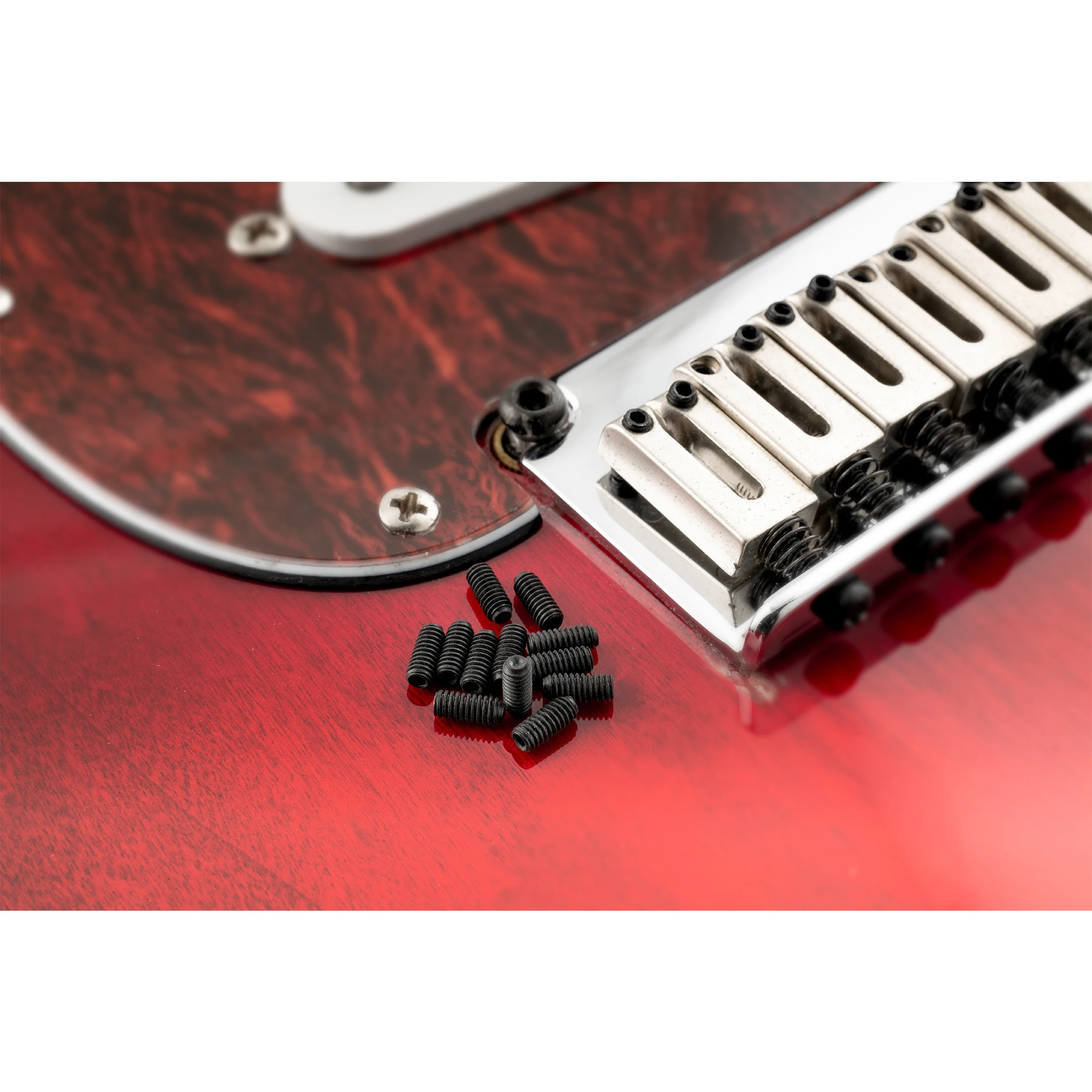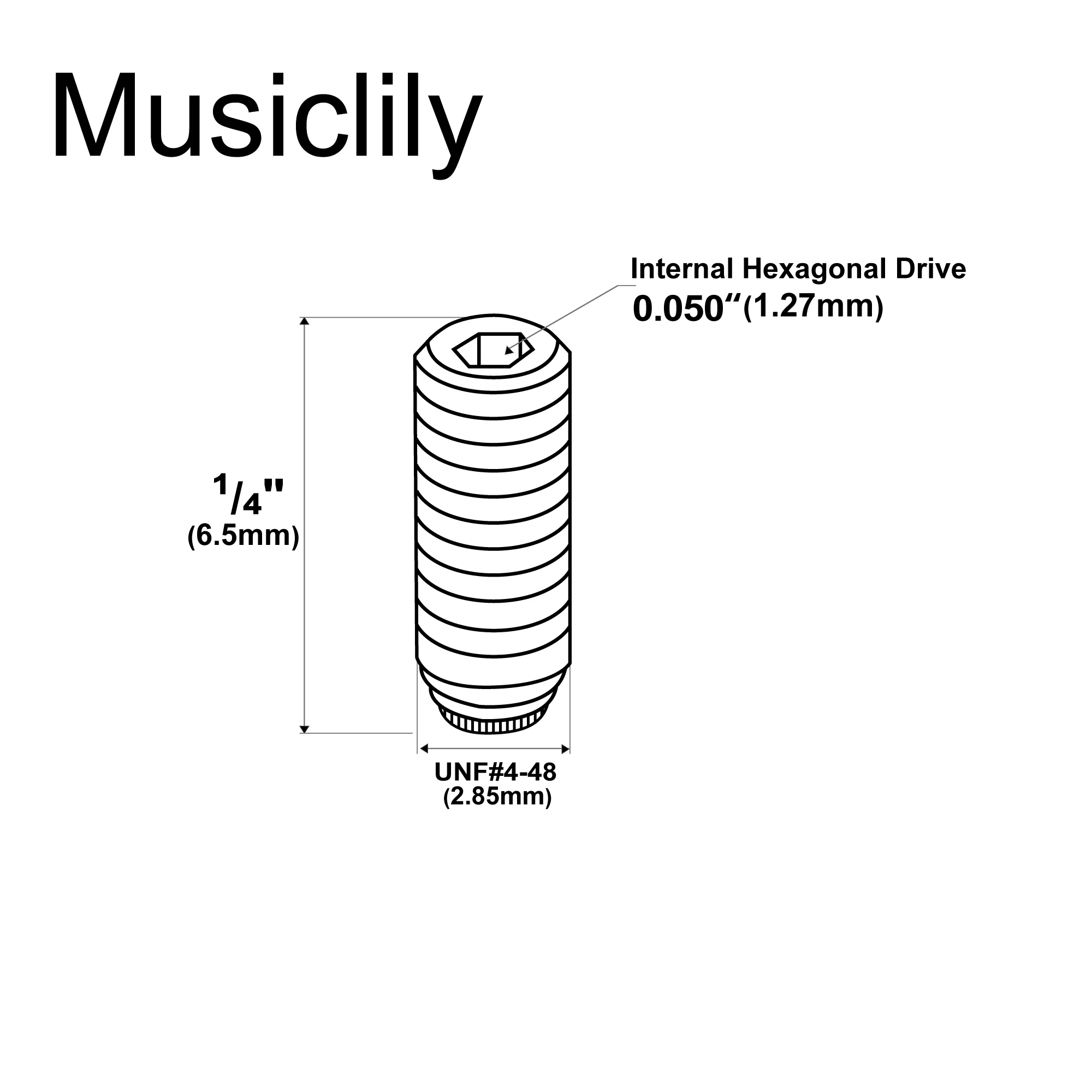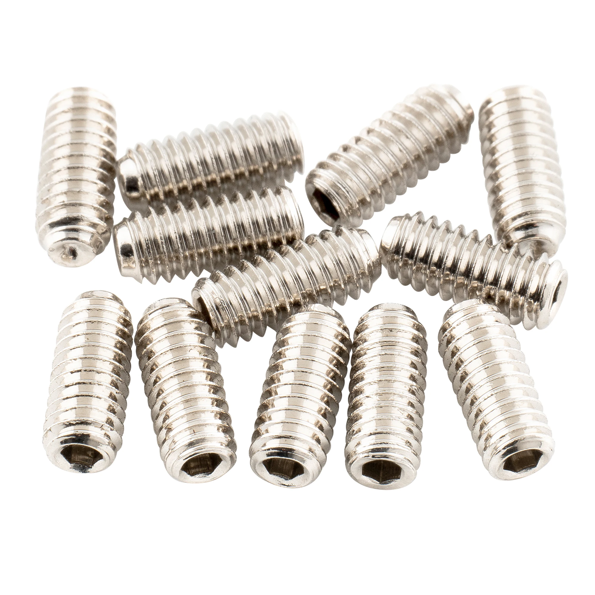 Enhance your USA-made electric guitar with this set of 12 stainless steel saddle height screws, crafted for precision and durability. Each screw measures 1/4 inch (6.5mm) in length with a thread diameter of 2.85mm (7/64 inch), featuring a UNF#4-48×1/4 inch thread. The hollow hexagon socket head fits a 1.27mm (0.050 inch) Allen wrench for flush, low-profile adjustments. Made from corrosion-resistant stainless steel, these screws ensure long-lasting performance, improved tuning stability, and enhanced sustain. Available in sleek black or polished nickel finishes, they’re the perfect upgrade for maintaining optimal guitar action and tone.