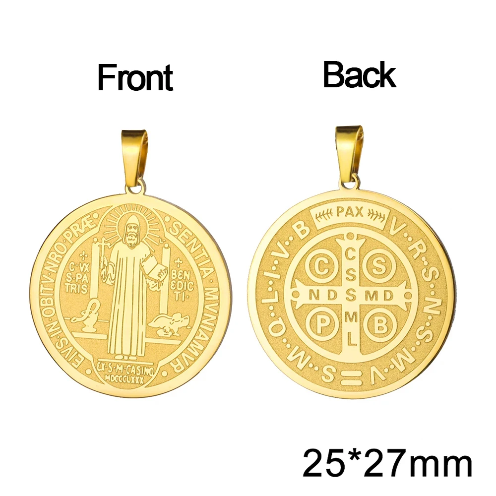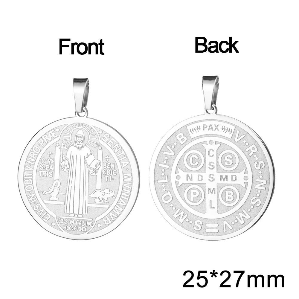 Imagine wearing a piece that not only enhances your style but also carries profound spiritual significance. Crafted from durable stainless steel, this Saint Benedict Medal pendant showcases intricate engraving with a vintage charm. The shiny, reflective surface highlights detailed line work, portraying Jesus Christ with a halo, flanked by saints or angels holding crosses or staffs. Radiant lines behind Jesus symbolize divine light, framed by Latin inscriptions and symbolic motifs that evoke timeless religious devotion. The double-sided design adds depth and grace. Whether worn daily or on special occasions, this pendant offers protection and spiritual strength, blending classic craftsmanship with modern durability. It’s the perfect accessory for expressing faith and style with confidence.