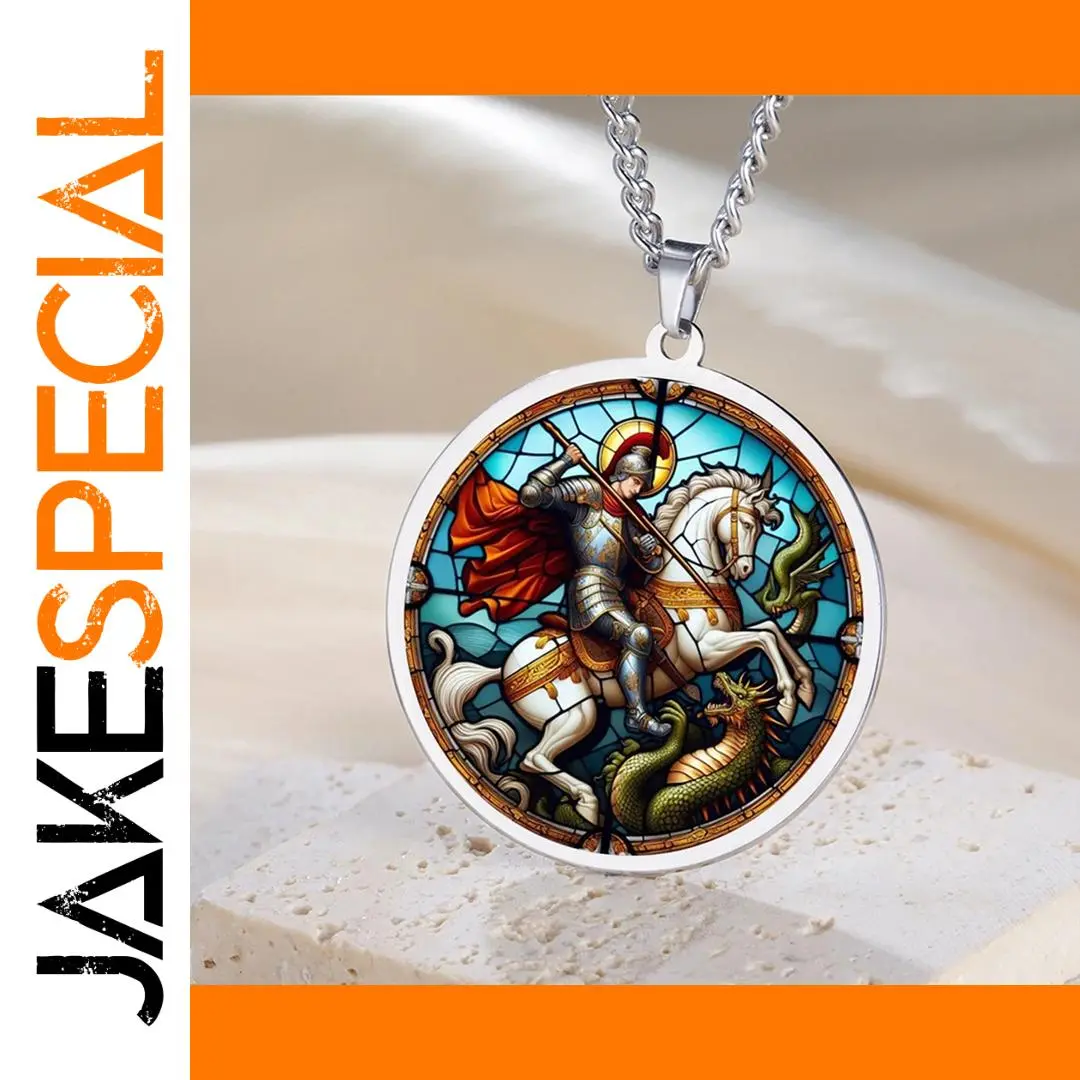 Experience the timeless appeal of this stainless steel pendant necklace featuring the iconic image of Saint George slaying the dragon. The detailed round design measures 35mm in width and 38mm in height, with a polished silver-tone or gold-colored edge that frames a vibrant, single-sided scene. The artwork depicts Saint George in armor, a halo behind his head, mounted on a rearing white horse, wielding a spear at a fierce, green-scaled dragon. The background features shades of blue reminiscent of stained glass, with intricate line work highlighting every detail. This stylish yet meaningful piece is perfect for both men and women, making it an ideal gift for anniversaries or spiritual occasions. Crafted with craftsmanship and care, it merges religious symbolism with fashionable appeal seamlessly.