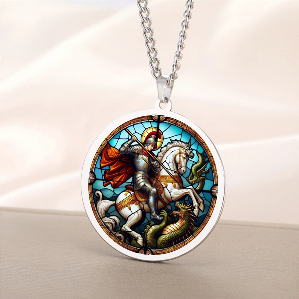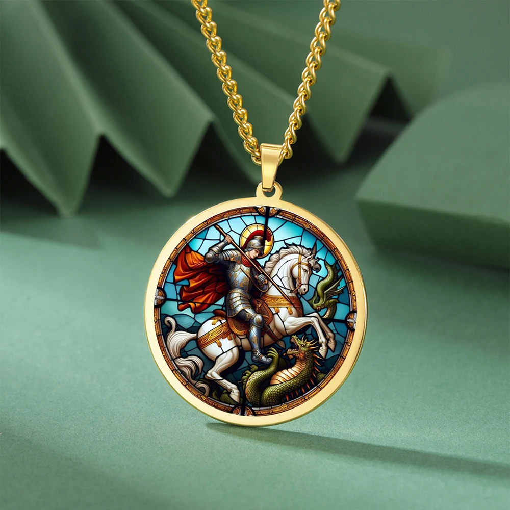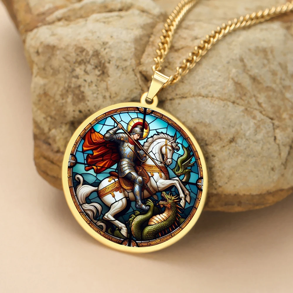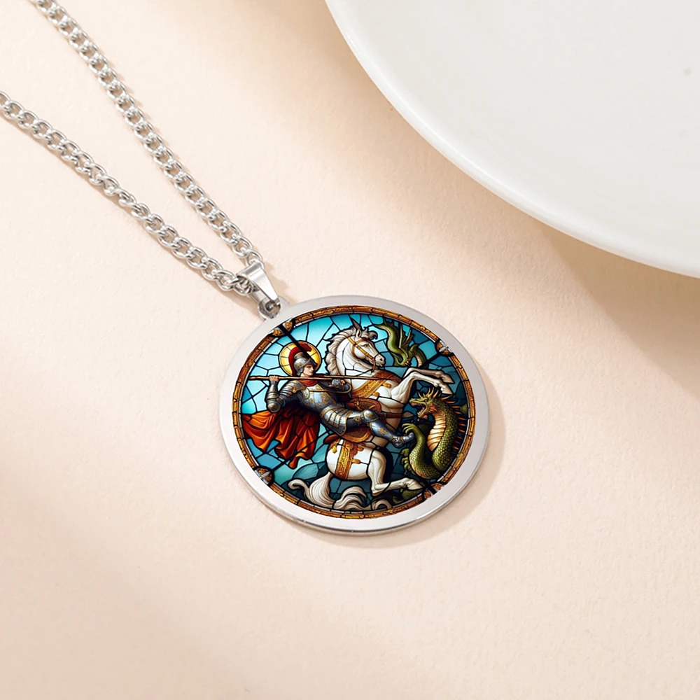 - The 35x38mm round pendant features a UV-engraved, vibrant scene of Saint George slaying the dragon, with multicolor artwork contrasting beautifully against the metallic frame.