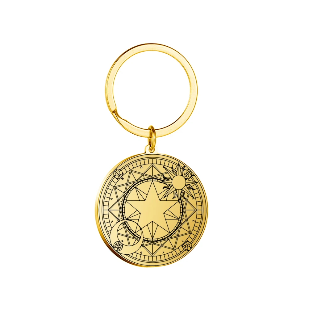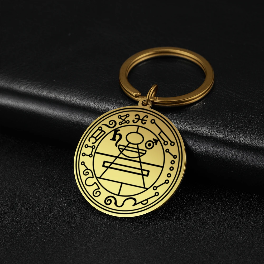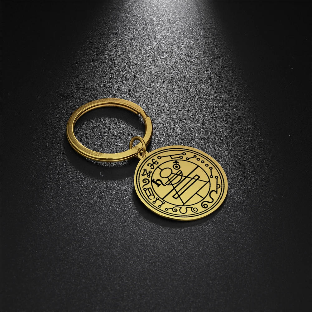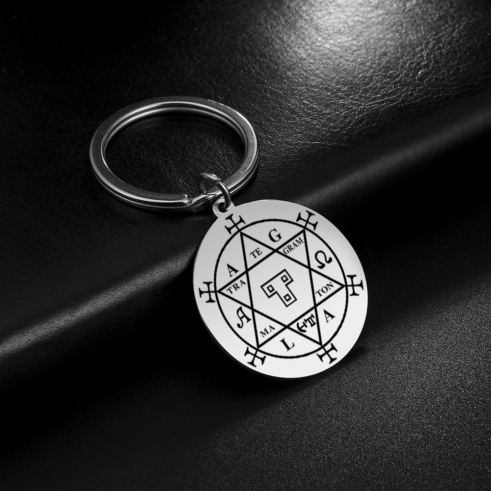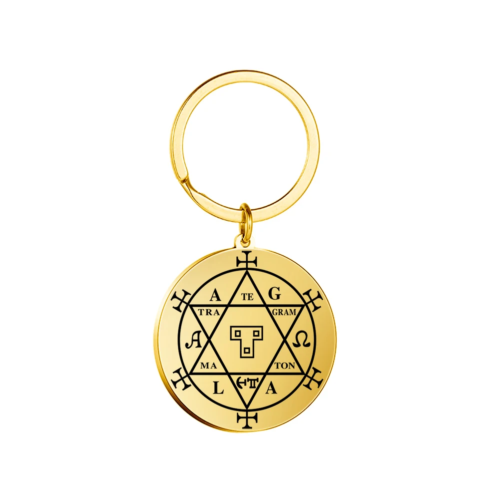 Enhance your collection with this vintage-style stainless steel keychain featuring a 35 x 38 mm round pendant. Laser-engraved with a detailed Hexagram pattern of the Solomon Seal, symbolizing wealth and fortune, it combines mystical symbolism with elegant design. Available in steel and gold tones, each keychain weighs just 15 grams and is fitted with a durable O-shaped buckle compatible with any keyring size. Crafted for unisex wear, this fashionable accessory embodies secrecy and mysticism, making it a perfect talisman or gift. Ships within three working days via FedEx or DHL with free shipping, adding a touch of magic to your everyday essentials.