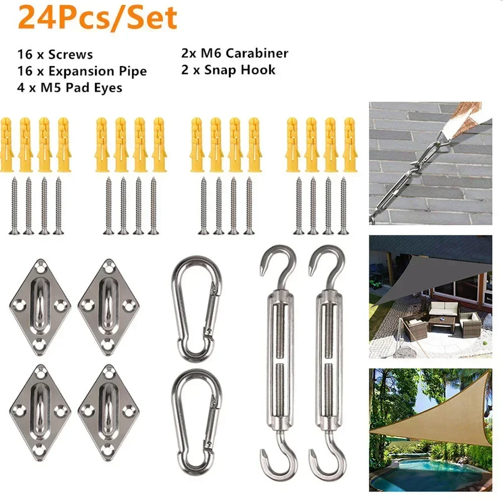 Imagine effortlessly creating a secure, stylish shade setup for your outdoor space with this premium stainless steel hardware kit. Designed for durability, it ensures long-lasting performance under sun and rain. Whether you're installing a shade sail, hanging a canopy, or securing tensioned fabrics indoors or outdoors, this set simplifies your project. The polished, bright metallic finish adds a contemporary touch, while the precise engineering guarantees strength and reliability. With a complete range of fittings, including adjustable turnbuckles, carabiners, pad eyes, and high-quality screws, you'll enjoy a seamless installation process. Visualize yourself relaxing under your new shade, protected and confident in the sturdy, professional-looking setup you've achieved using this comprehensive hardware set.