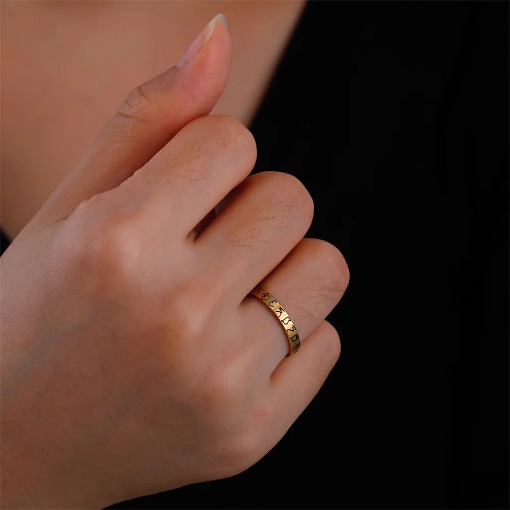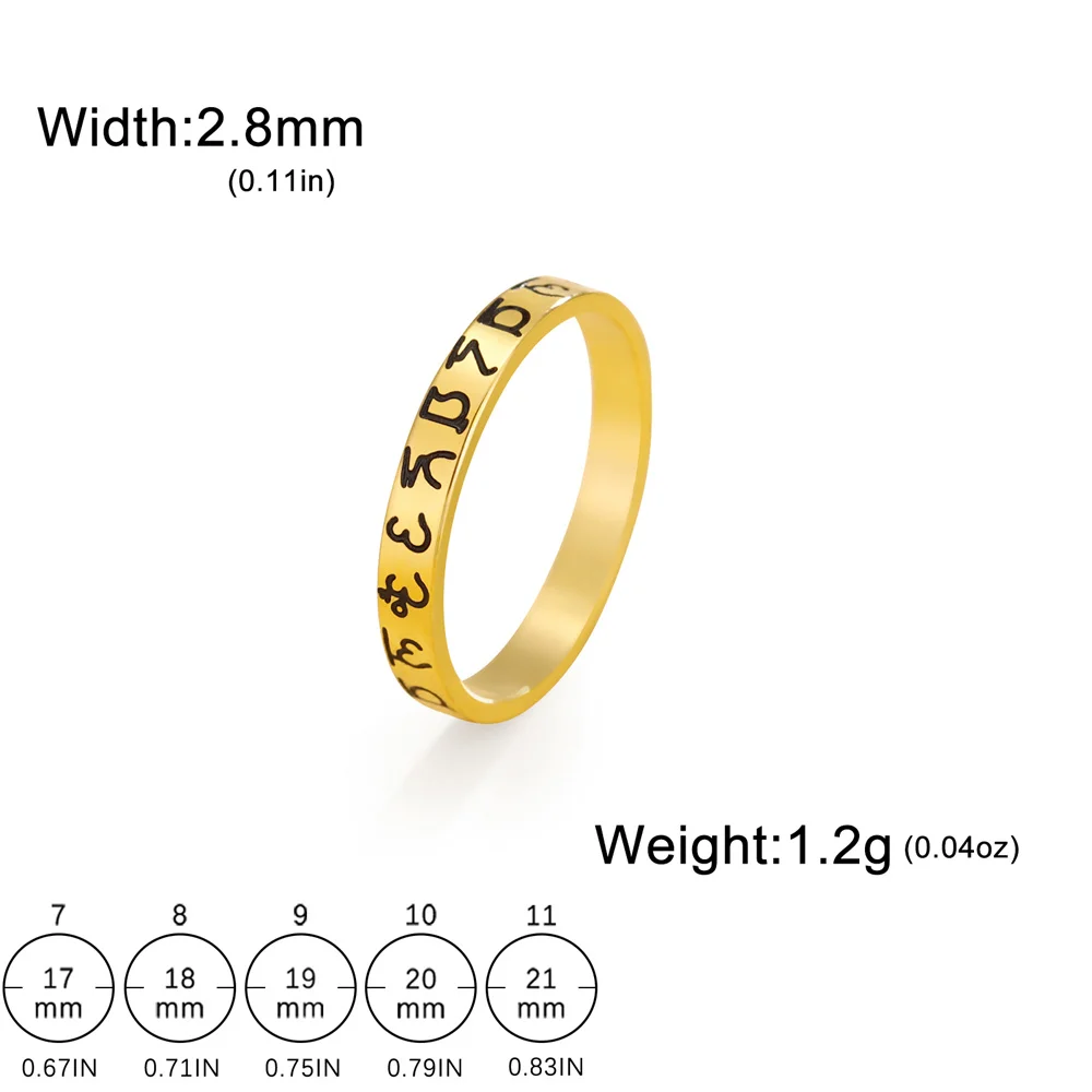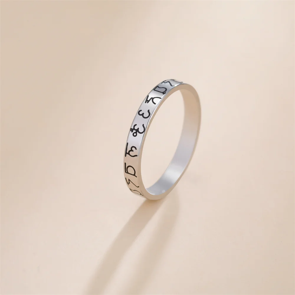 Experience a beautiful blend of elegance and spirituality with this stainless steel Shakyamuni Mantra ring. Crafted for durability, it features a sleek 3mm wide band with a polished, shiny surface that gracefully reflects light. Available in stunning silver and gold tones, this unisex ring offers a minimalist yet meaningful design, perfect for daily wear or special occasions like weddings, anniversaries, or parties. The black-ink engraved characters encircle the band, creating a bold contrast that symbolizes spiritual protection and devotion. Its geometric pattern adds a contemporary touch to the vintage-inspired style, making it versatile for all outfits and styles. Feel the comfort of a durable, rust-resistant, and hypoallergenic piece that carries profound symbolic importance.