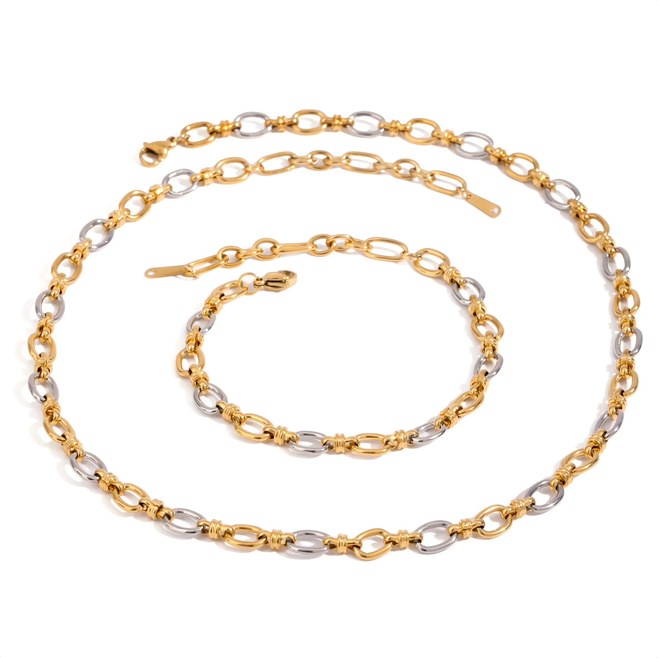 Elevate your style with this stainless steel jewelry set featuring a modern, minimalist skeleton chain-link design. The set includes a 45 cm necklace and a 20 cm bracelet, both showcasing alternating elongated silver oval links and smaller circular gold-tone links arranged in a stylish rhythmic pattern. Crafted for durability and resistance to corrosion, these lightweight pieces have a polished, shiny finish and are secured with a lobster clasp for easy adjustment. Perfect for daily wear or special occasions, they are safe for sensitive skin and designed to add a sleek, contemporary touch to casual, sporty, or party outfits.