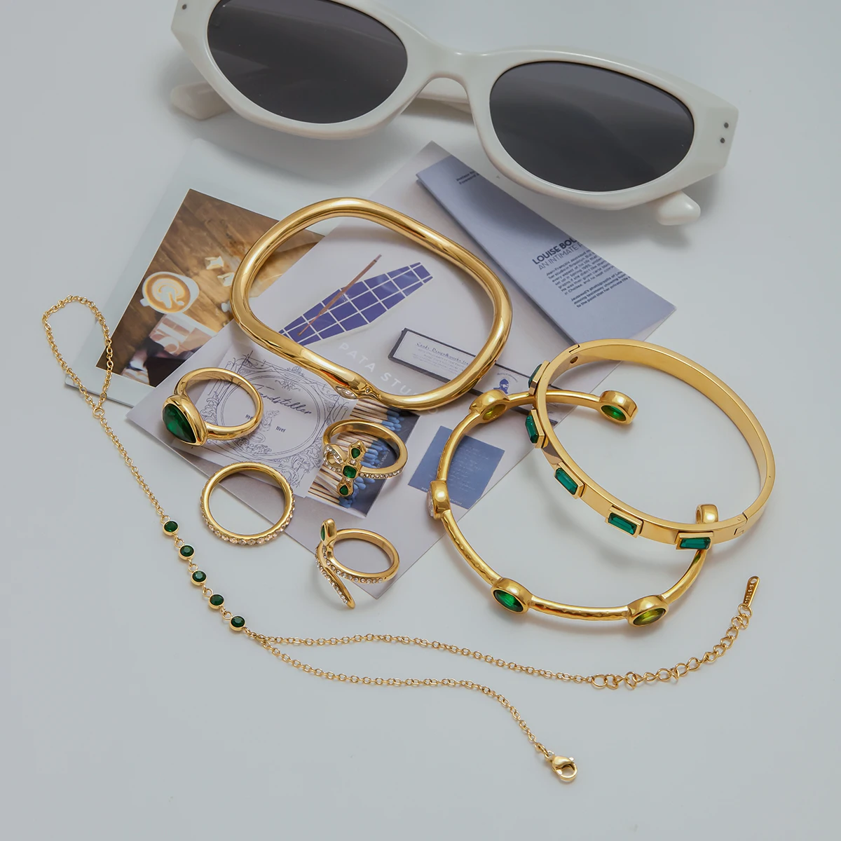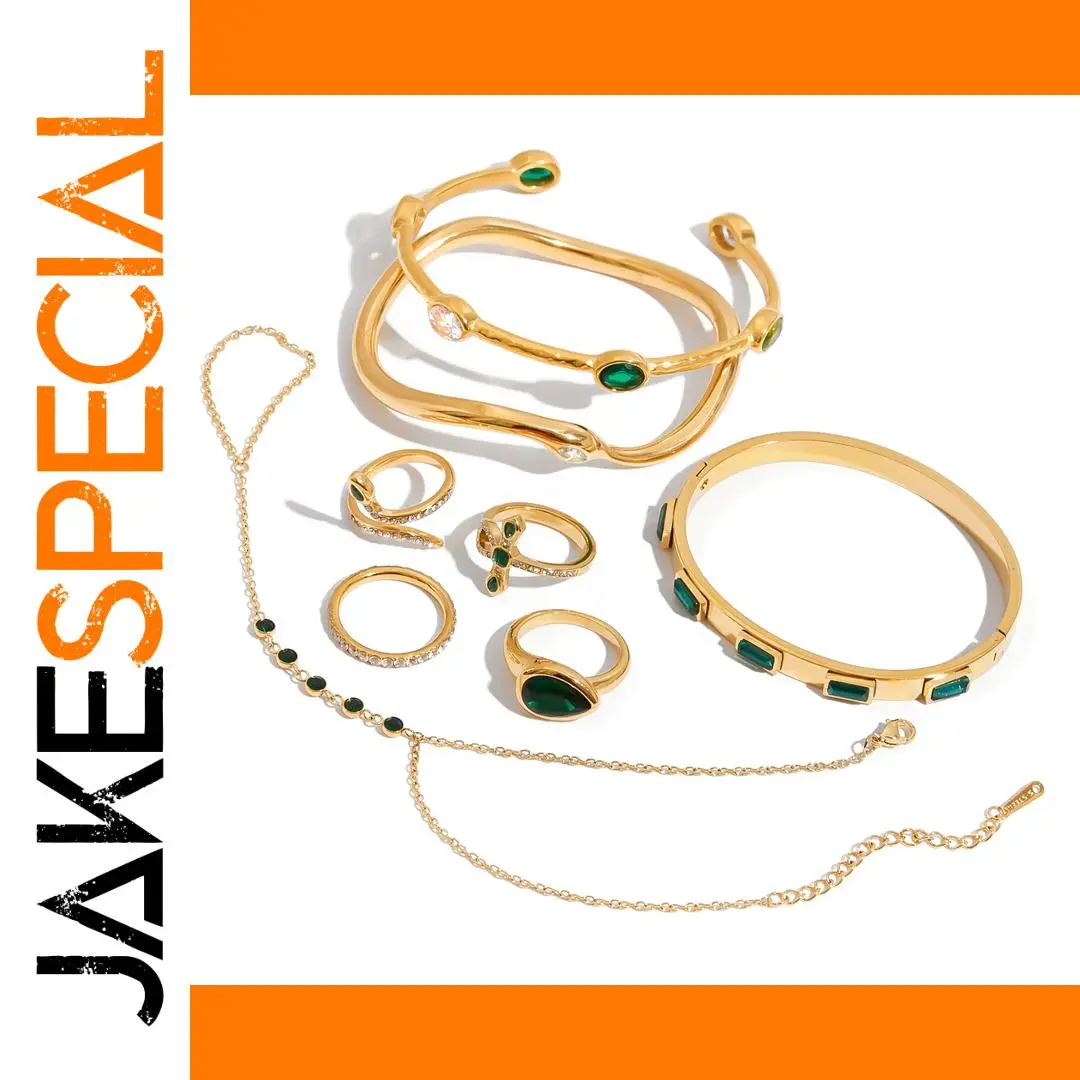 Experience the allure of this stunning snake-themed jewelry set, crafted from durable stainless steel with a luxurious gold-tone finish. The collection features intricate animal motifs, including a sleek snake motif necklace adorned with embedded oval-shaped green zirconia stones. The flexible snake-shaped ring wraps comfortably around your finger, showcasing a larger green zirconia stone at its head. The wide cuff bracelet elegantly encircles your wrist with a row of sparkling green stones, adding a bold statement. Complementary rings with snake and animal motifs, accented with smaller green zirconia stones, complete this set. Designed with sleek, polished surfaces and detailed craftsmanship, these accessories effortlessly blend sophistication with playful animal-inspired elements, perfect for enhancing any outfit.