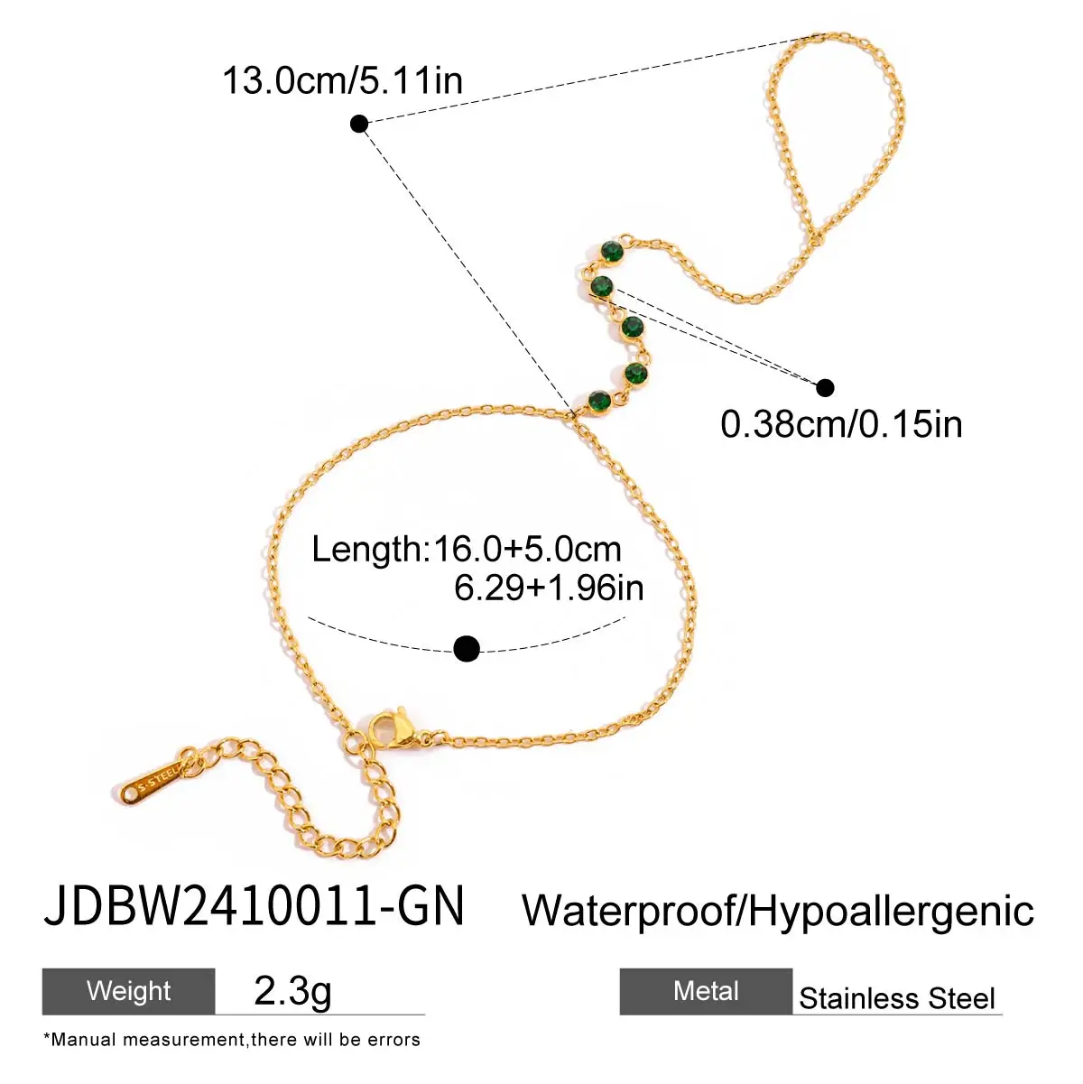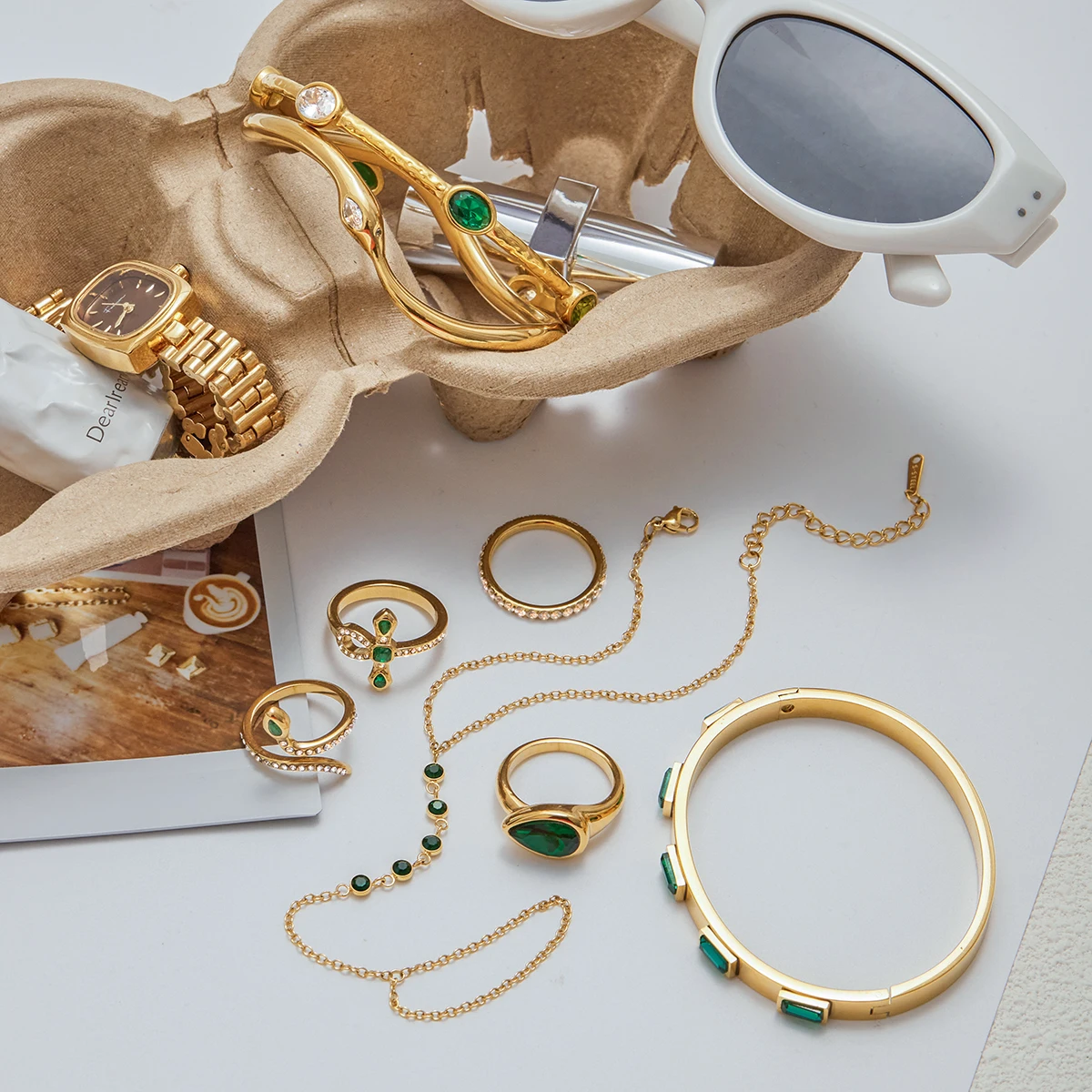 - Clear technical specifications include durable stainless steel base, gold-tone coating, embedded oval-shaped green zirconia stones, and animal-inspired motifs, perfect for both casual and formal settings.