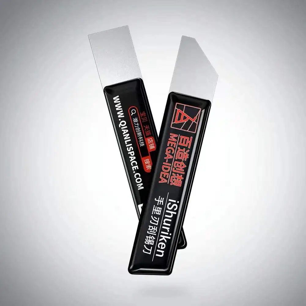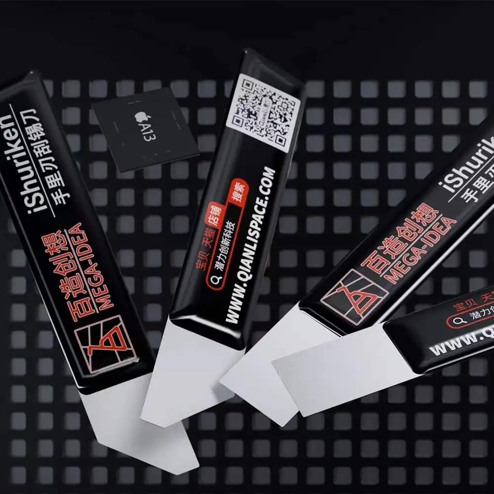 Enhance your iPhone repair toolkit with this precision metal solder paste scraping tool, featuring a 0.2mm thick blade crafted for delicate cleaning and tin net removal. This set includes two versatile blades—one with an oblique mouth and another with a flat mouth—designed to provide optimal control during solder paste removal and cleaning tasks. The sleek, professional design boasts a durable handle with detailed branding and technical markings, ensuring comfort and accuracy in your repair work. Perfect for technicians aiming for meticulous, efficient repairs, this tool combines durability, precision, and ergonomic handling to elevate your electronic repair process.