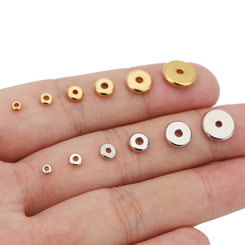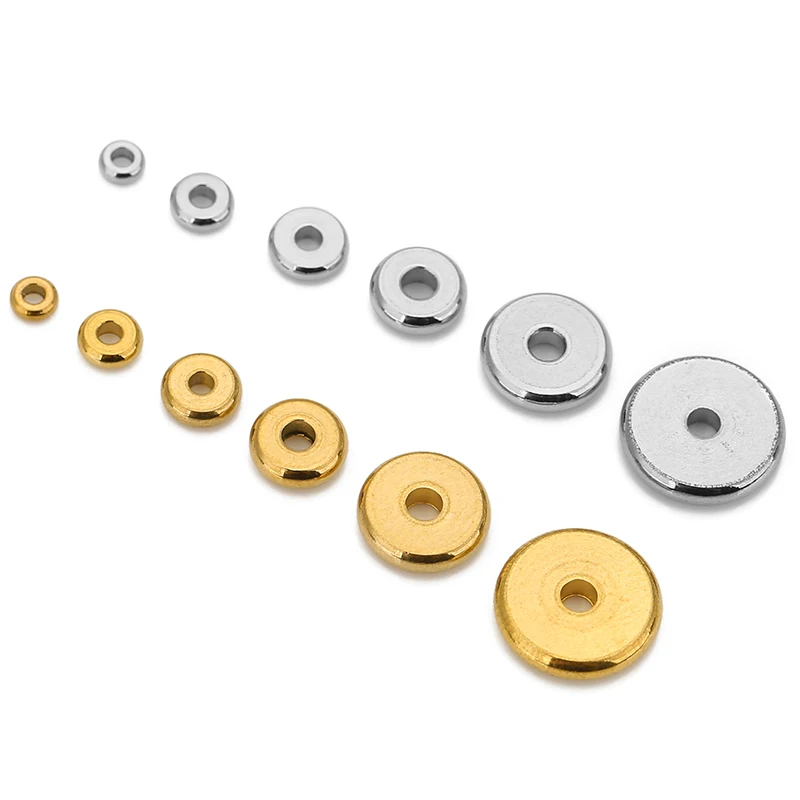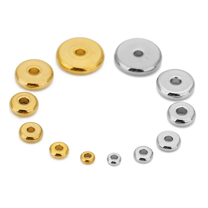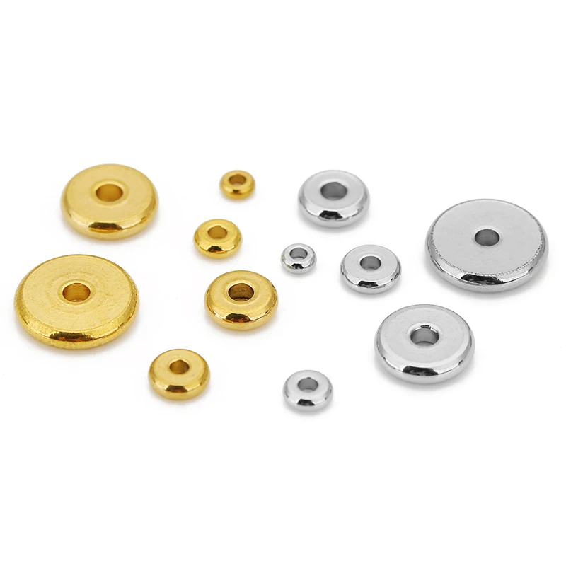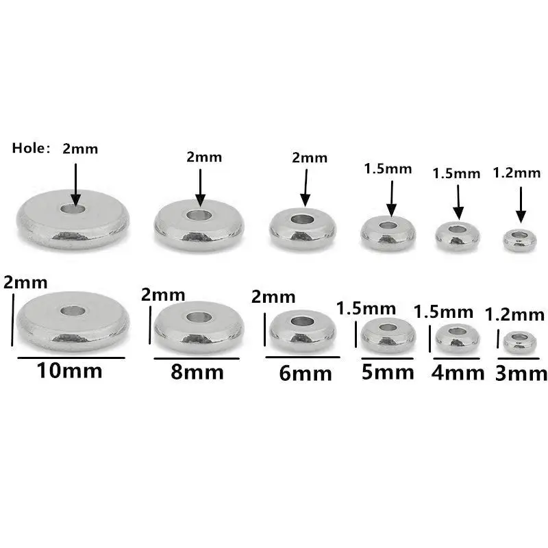 Enhance your jewelry creations with this set of 50 high-quality stainless steel flat round spacer beads available in sizes 3mm, 4mm, 5mm, 6mm, 8mm, and 10mm, featuring hole diameters of 1.2mm, 1.5mm, and 2mm. These durable beads have a sleek, polished finish in steel or gold, with a flat, slightly domed profile measuring approximately 0.2mm in height and 0.6mm in width. Perfect for adding a sophisticated touch to bracelets and necklaces, each bead provides a uniform appearance, combining style with reliability for your DIY jewelry projects.