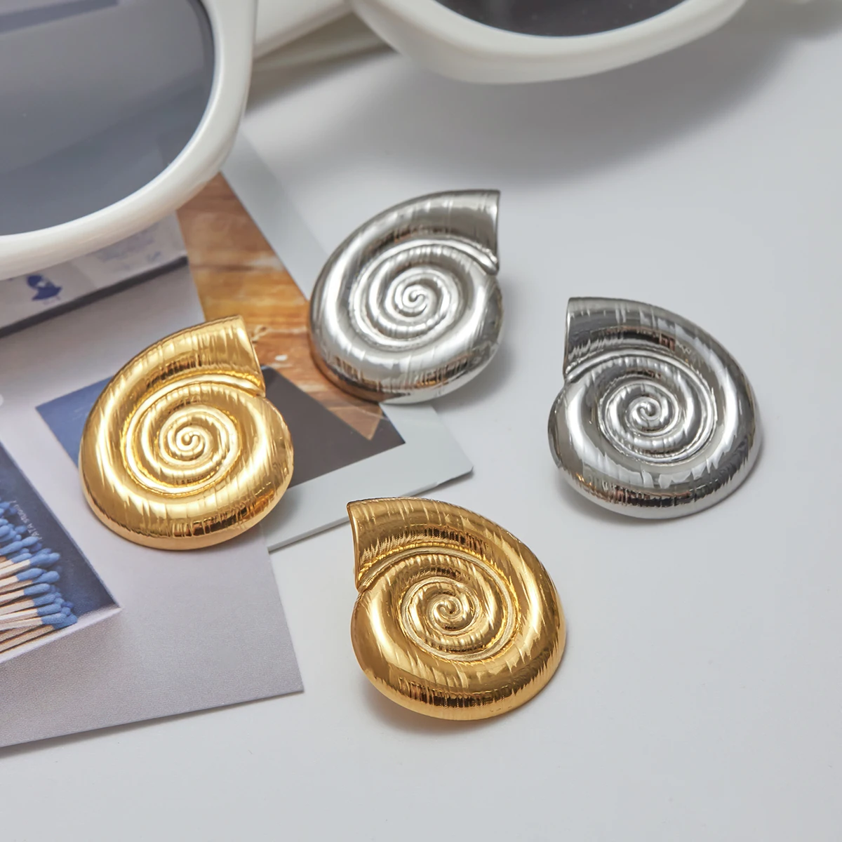 Experience timeless elegance with these stunning stainless steel spiral earrings, designed to elevate your everyday style. Crafted from durable, high-quality stainless steel with a shiny gold-colored finish, these earrings feature a shell-inspired, rounded teardrop shape with intricate spiral patterns. Their smooth, glossy surface highlights the delicate details, adding a sophisticated touch to any outfit. The slightly convex, three-dimensional design creates depth and visual interest, making them perfect for both casual and formal occasions. Comfortable to wear all day, these hypoallergenic earrings are fitted with secure push-back fastenings. They resist tarnishing and maintain their radiant shine over time. Whether for yourself or as a thoughtful gift, these earrings combine organic inspiration with modern minimalism beautifully.