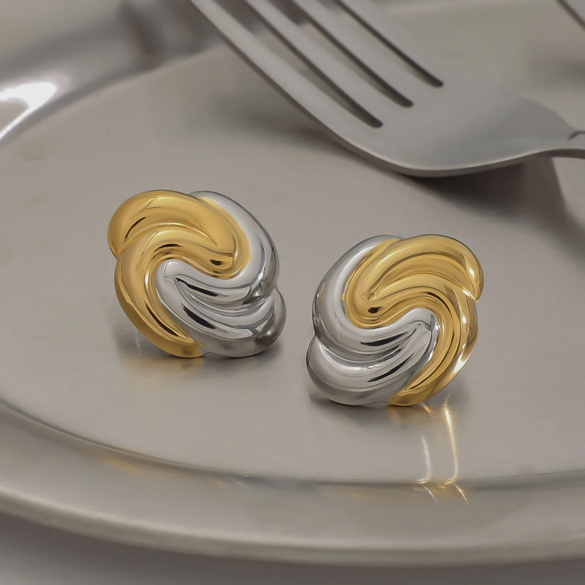 Elevate your style with these stainless steel stud earrings featuring a sleek geometric spiral design. Crafted for durability and shine with platinum, they showcase a striking double-color scheme with shiny gold accents on the upper sections of the swirling pattern. The highly polished surface creates a reflective, glamorous look, perfectly suited for party occasions or as a stylish gift. Designed as screw-back earrings, they provide a secure and comfortable fit for women. These trendy, modern accessories combine fashion and quality, making them an essential addition to any accessory collection.