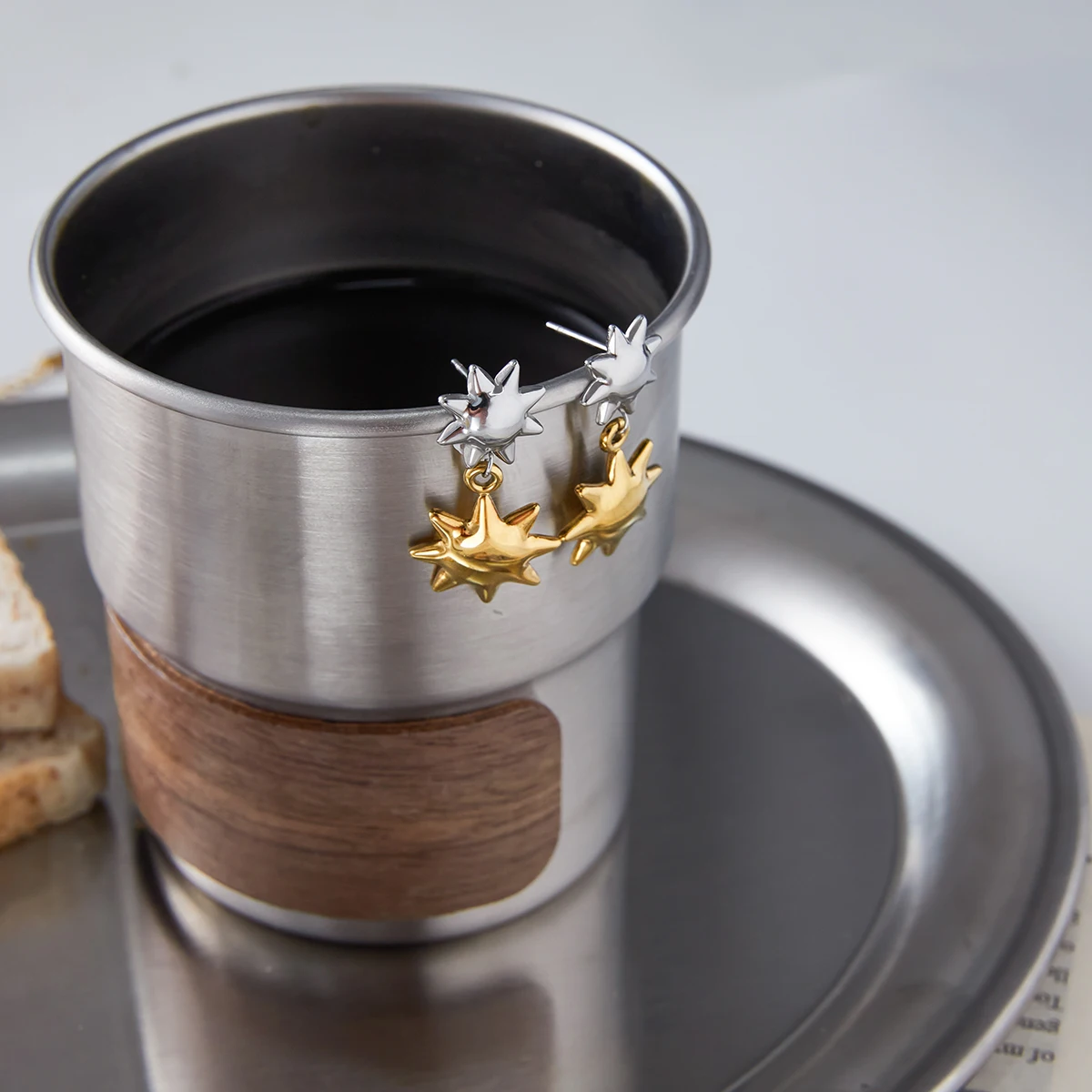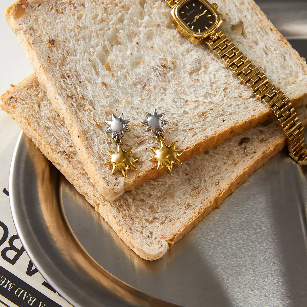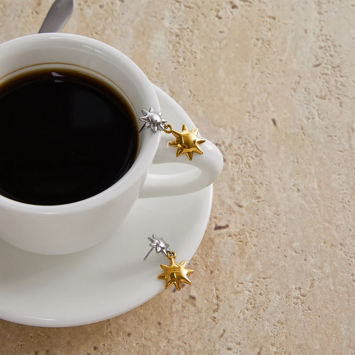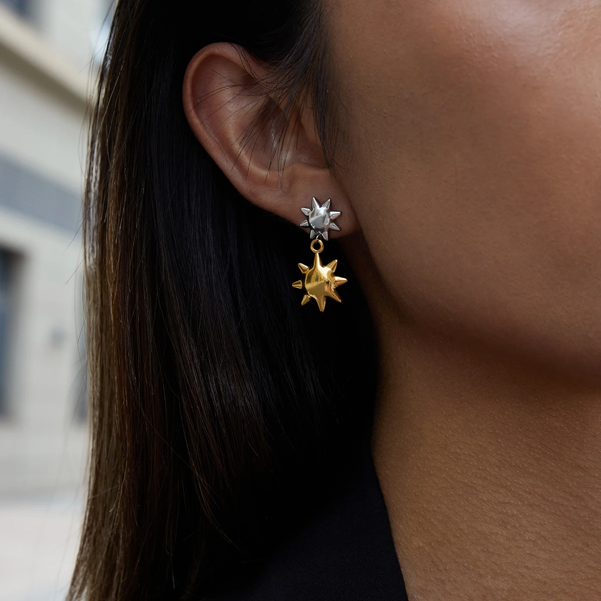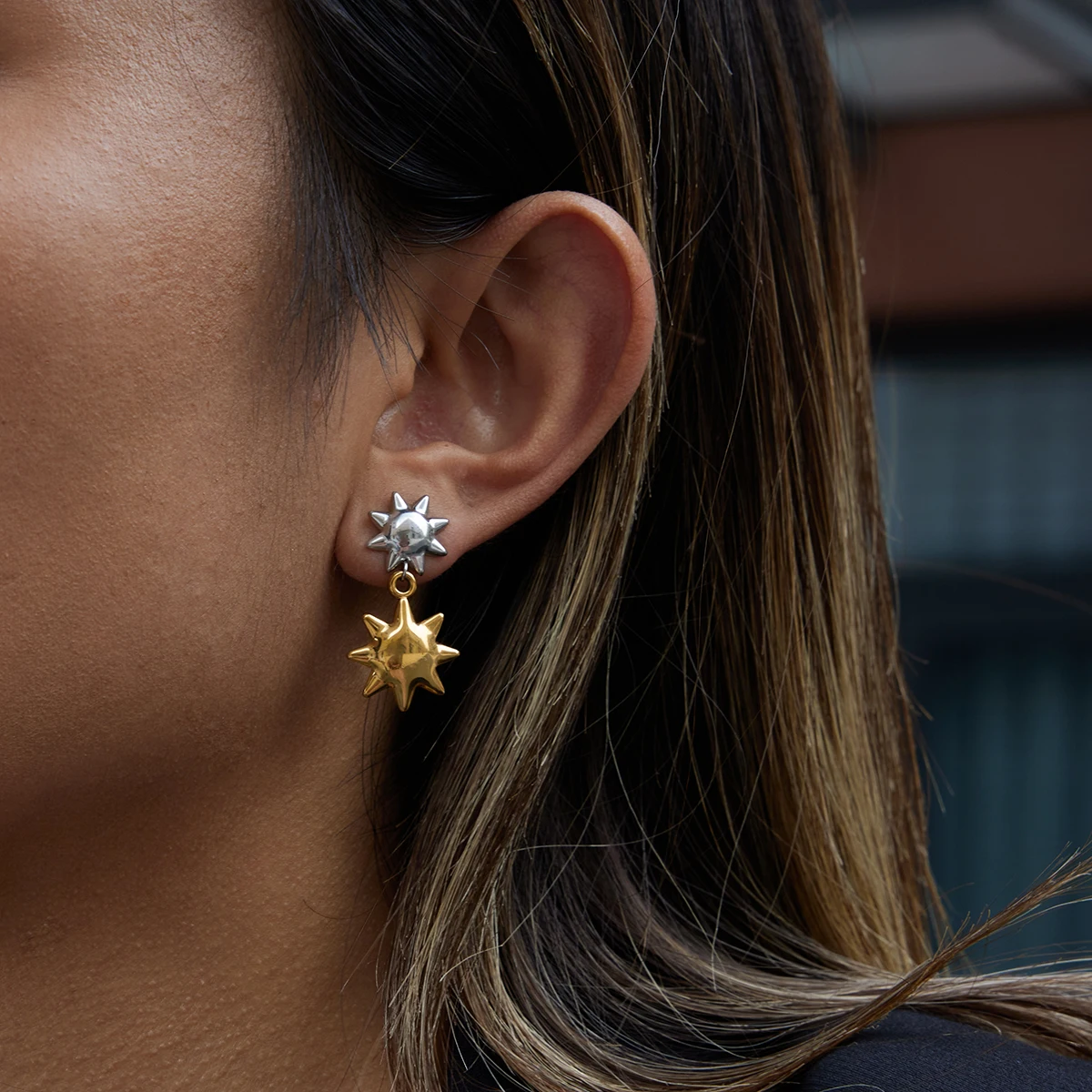 - Fashionable two-tone sun motif with a sleek silver star upper part and an elaborate gold-tone dangling star for a striking celestial look.