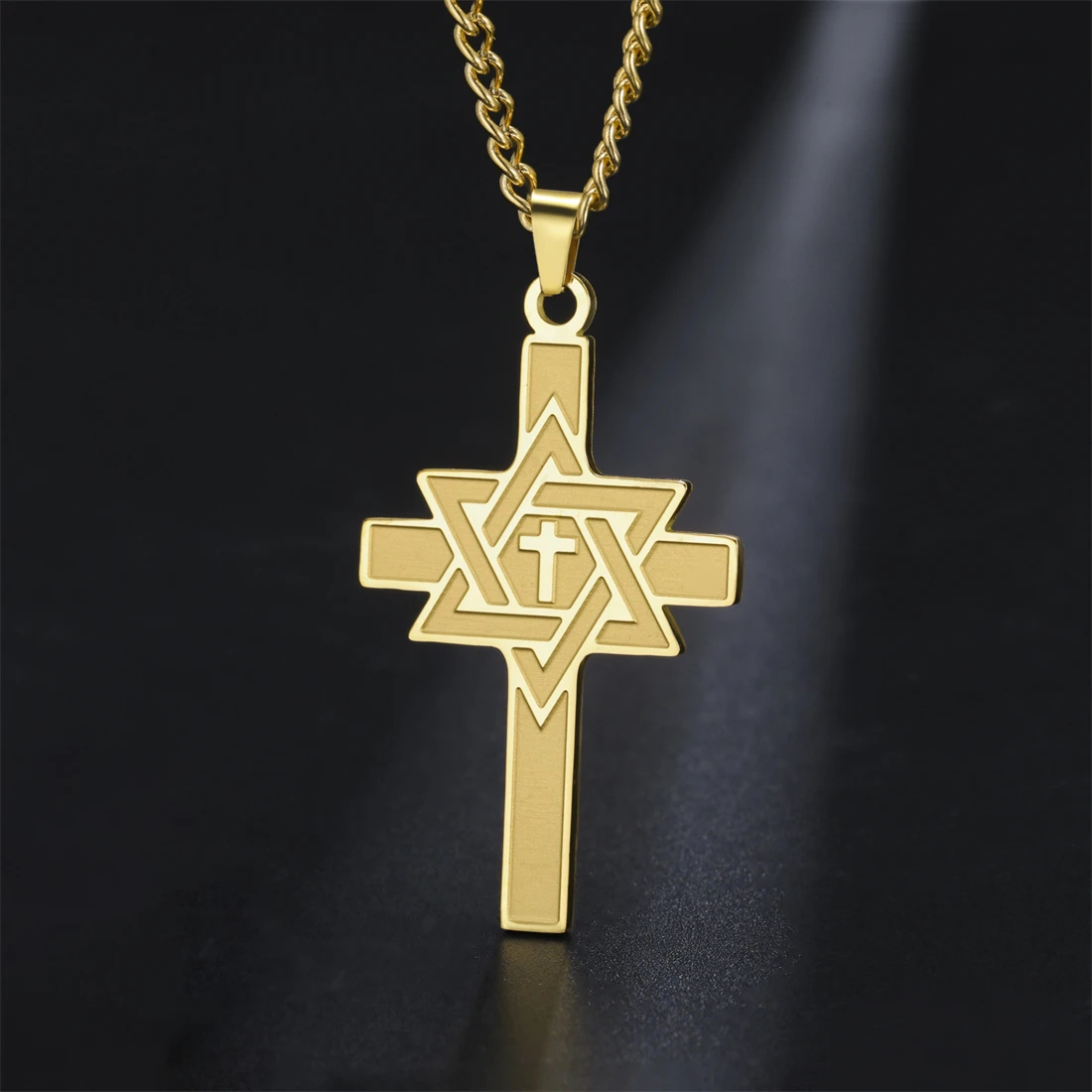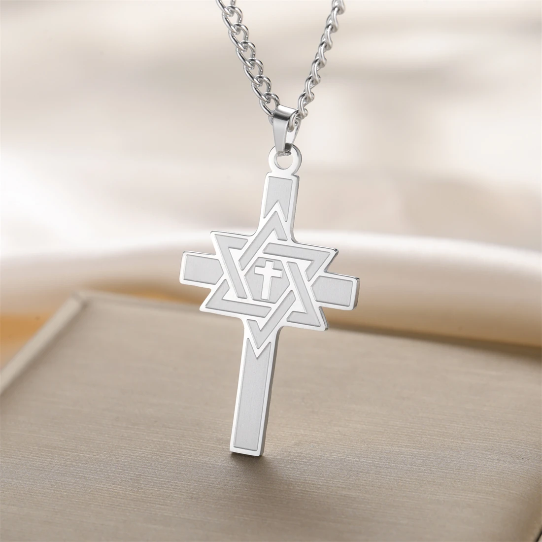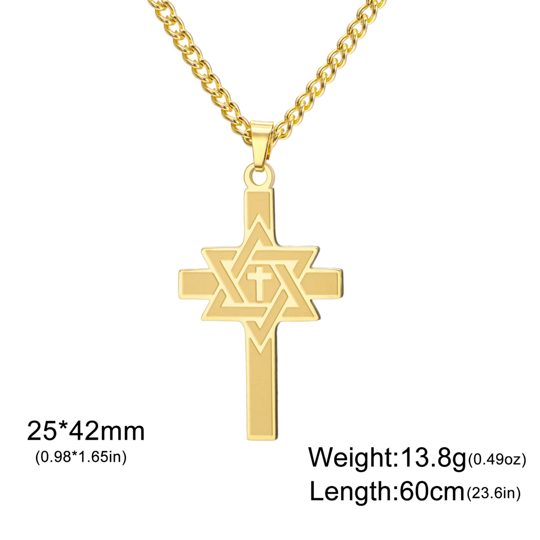 Experience elegance and meaning with this exquisite unisex pendant necklace featuring a stunning Star of David cross design. Measuring 25mm by 42mm, the pendant combines modern minimalism with vintage charm. Crafted from durable stainless steel, it offers a polished, shiny finish in your choice of silver or gold color. The 60cm link chain complements the pendant beautifully, providing a comfortable and fashionable fit for any occasion. Whether you're celebrating a special moment or looking for a meaningful gift, this necklace's high-quality material ensures long-lasting wear, resistance to rust and corrosion, and hypoallergenic comfort. Its versatile style makes it perfect for parties, anniversaries, birthdays, weddings, and travel, adding a touch of contemporary symbolism to your look.
