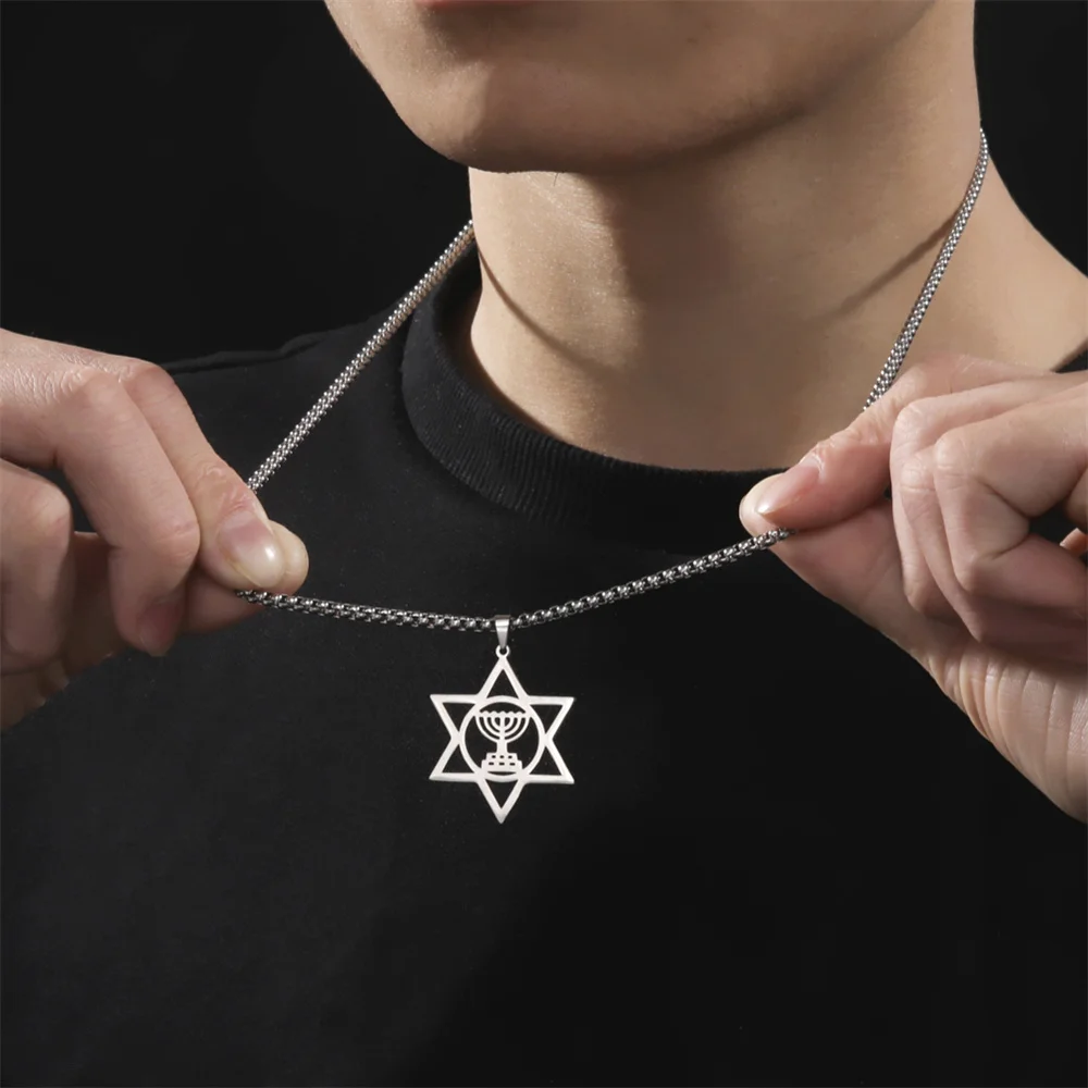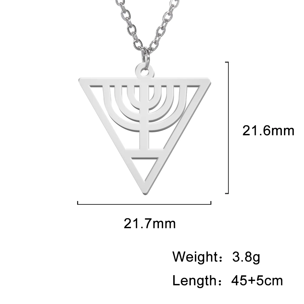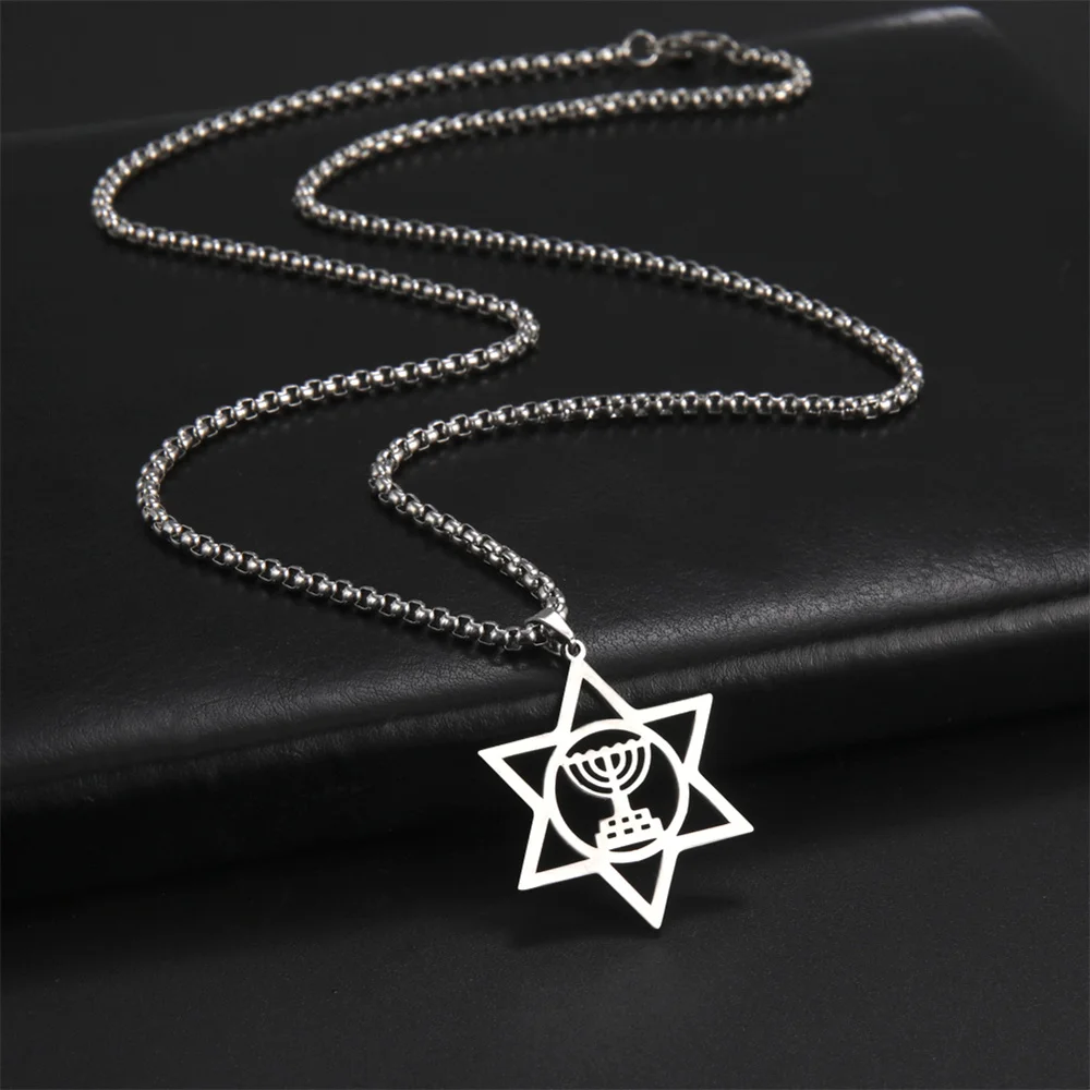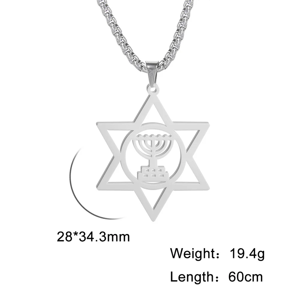 Imagine yourself wearing this stunning jewelry piece that seamlessly blends cultural symbolism with modern elegance. Crafted from durable stainless steel, this pendant features a sleek Star of David with a stylized Menorah at its center, symbolizing faith and tradition. The polished, reflective surface enhances its minimalist design, making it suitable for everyday wear or special occasions like parties, weddings, or religious celebrations. Available in four beautiful colors—silver, gold, rose gold, and black—it complements any attire and adds a subtle touch of spirituality and style. Its size of 28mm by 34.3mm makes it a focal point without overwhelming, offering both elegance and meaningful symbolism in a sophisticated package.
