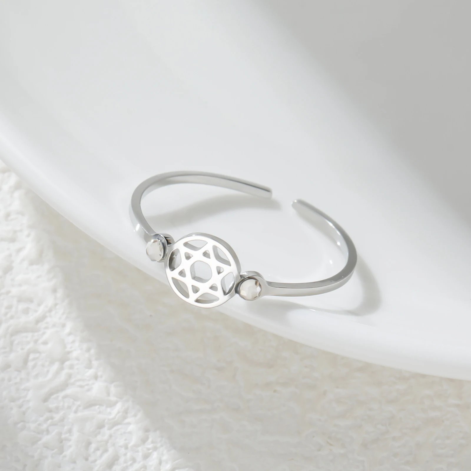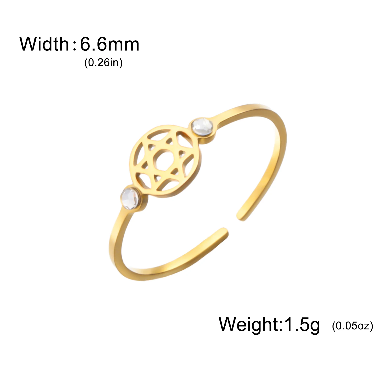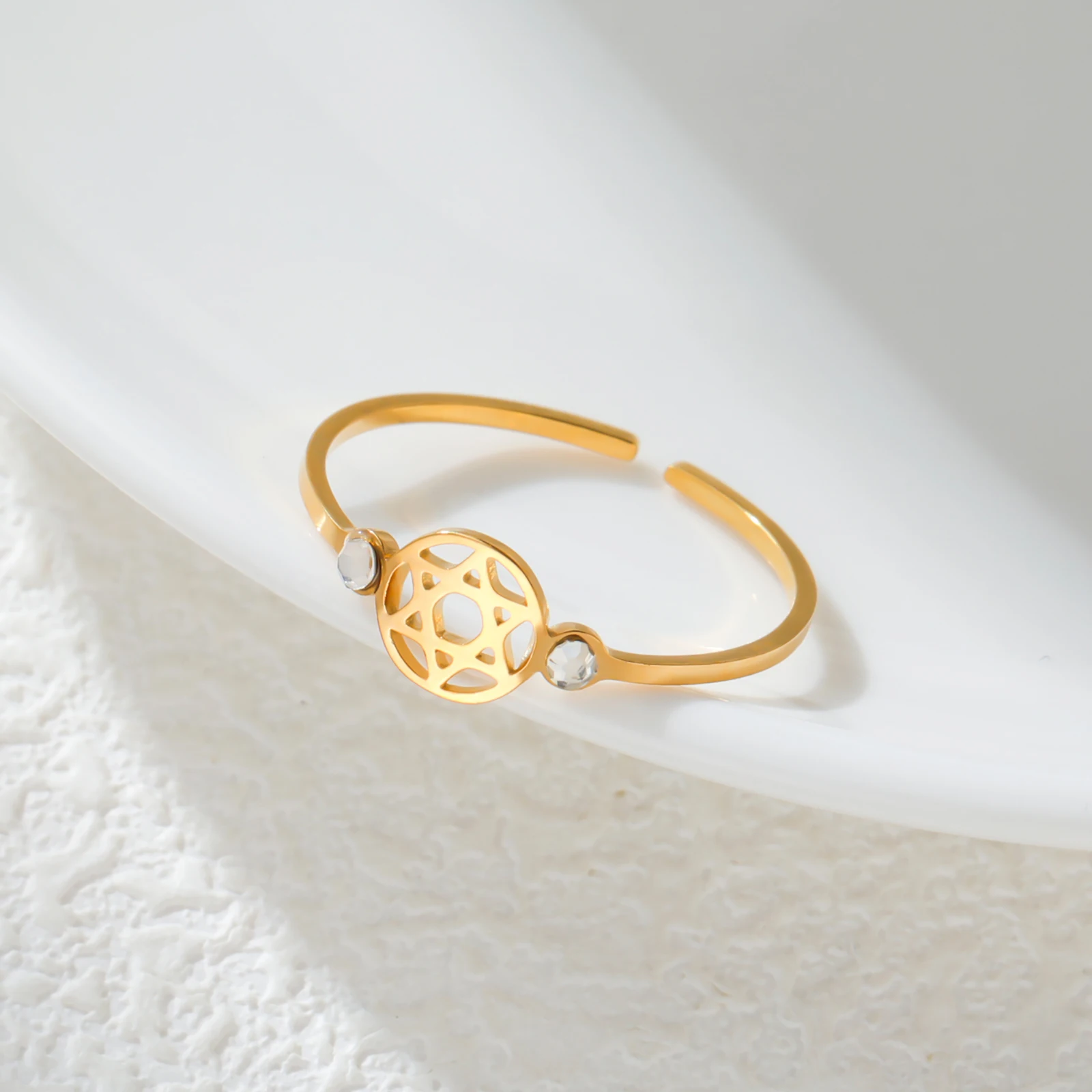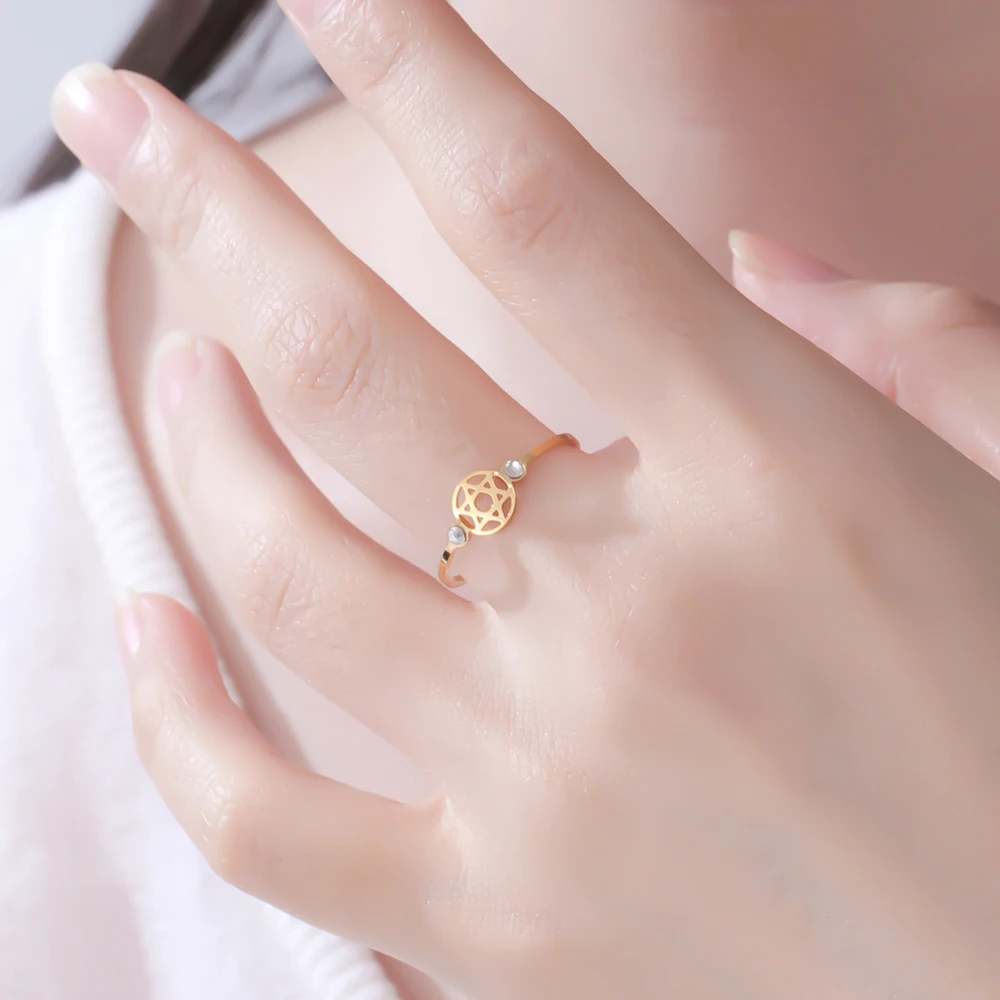 Imagine yourself adorned with this elegant stainless steel ring, featuring a stunning Star of David design. The polished surface reflects light beautifully, highlighting its sophisticated craftsmanship. Available in gold or rose gold plated finishes, this ring embodies modern style with a touch of meaningful symbolism. Its resizable band ensures a perfect fit, making it comfortable for everyday wear or special occasions. The delicately cut-out star centerpiece, accented with a sparkling zircon, adds just the right amount of subtle glamour. Whether you're celebrating a special moment or simply expressing your unique style, this versatile piece is designed to complement both casual and formal outfits effortlessly. Feel confident and stylish with this meaningful jewelry addition.