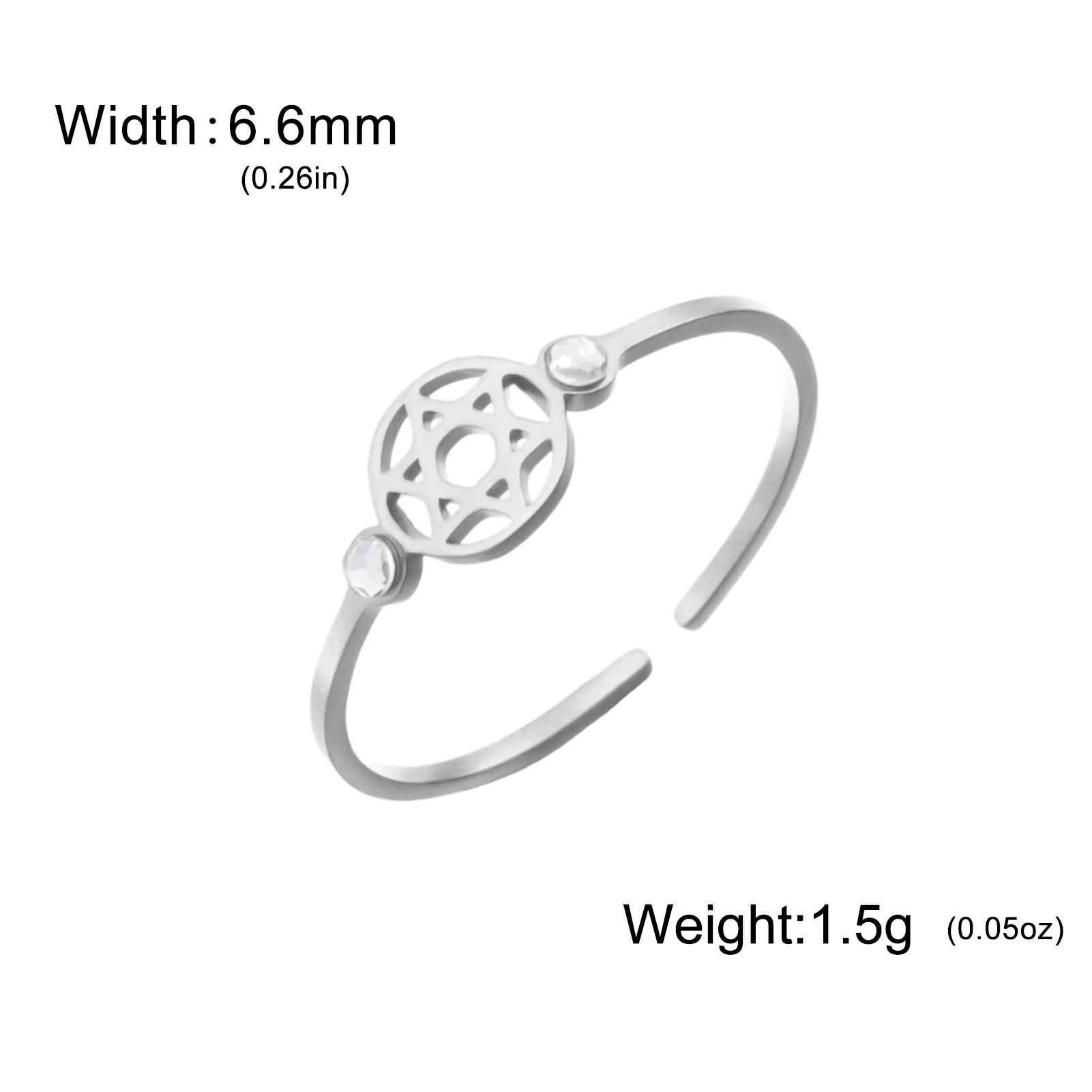 - Technical specifications include: stainless steel base, 18k gold or rose gold plating, zircon stone, resizable design, and high resistance to environmental damage.