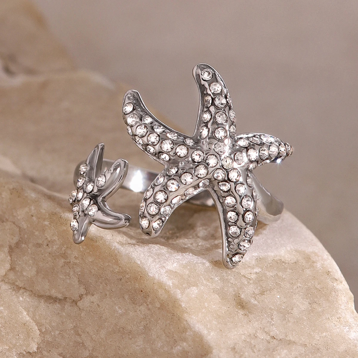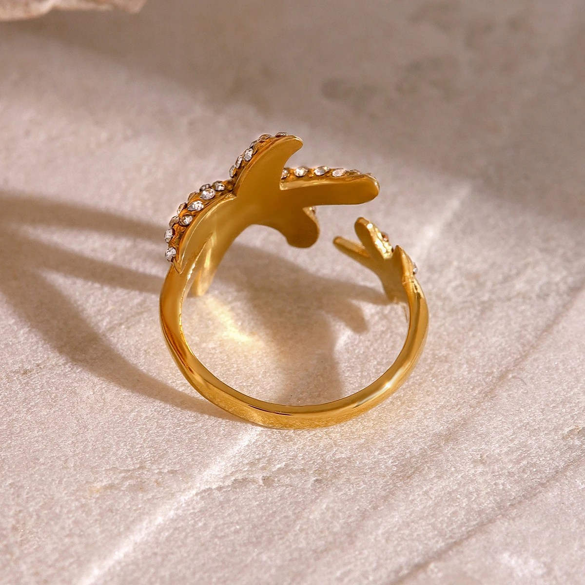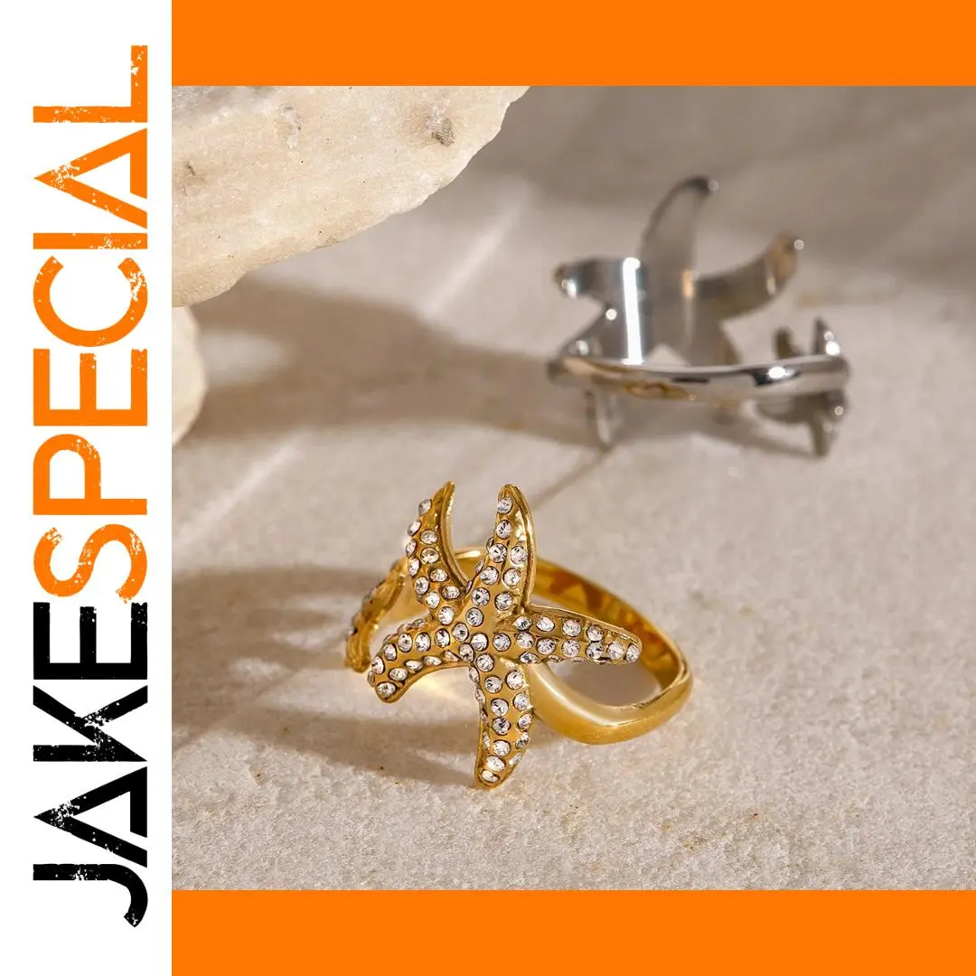 This women’s stainless steel ring features a PVD gold finish, weighing 15 grams for a lightweight feel. Its bold, geometric starfish design is embellished with sparkling zirconia accents, creating a luxurious and eye-catching look. The smooth, rounded band ensures comfortable wear, while the waterproof, nickel-, lead-, and cadmium-free construction guarantees durability and long-lasting color that resists fading and scratches. Perfect for daily fashion or special occasions, this versatile ring also includes a mood tracker function. Its sleek, contemporary style makes it an ideal accessory for expressing your unique personality and elevating any outfit with timeless elegance.