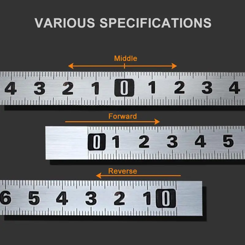 This stainless steel sticky ruler features a 13mm width with available lengths of 1m, 2m, 3m, 4m, 5m, 6m, and 10m, constructed from durable high carbon steel with a corrosion-resistant, electroplated surface. It offers measurement orientations in forward, reverse, and midpoint (1-5m), with clear, wear-resistant black markings for precise reading. The strong adhesive backing allows secure attachment to metal, wood, plastic, and glass surfaces, and the flat, straight design can be cut to custom lengths. Its sleek metallic appearance, smooth finish, and robust utility make it ideal for woodworking, construction, and DIY projects.