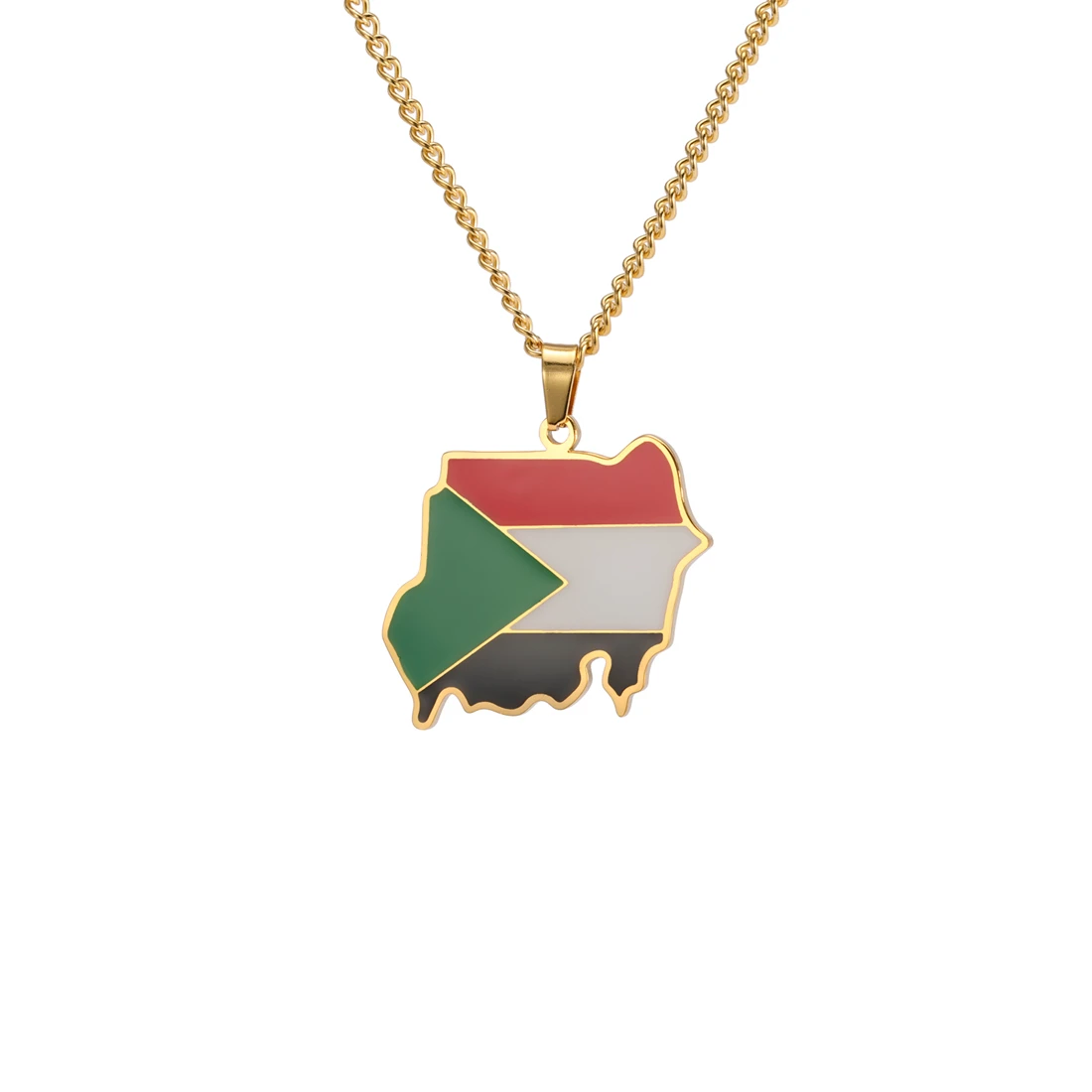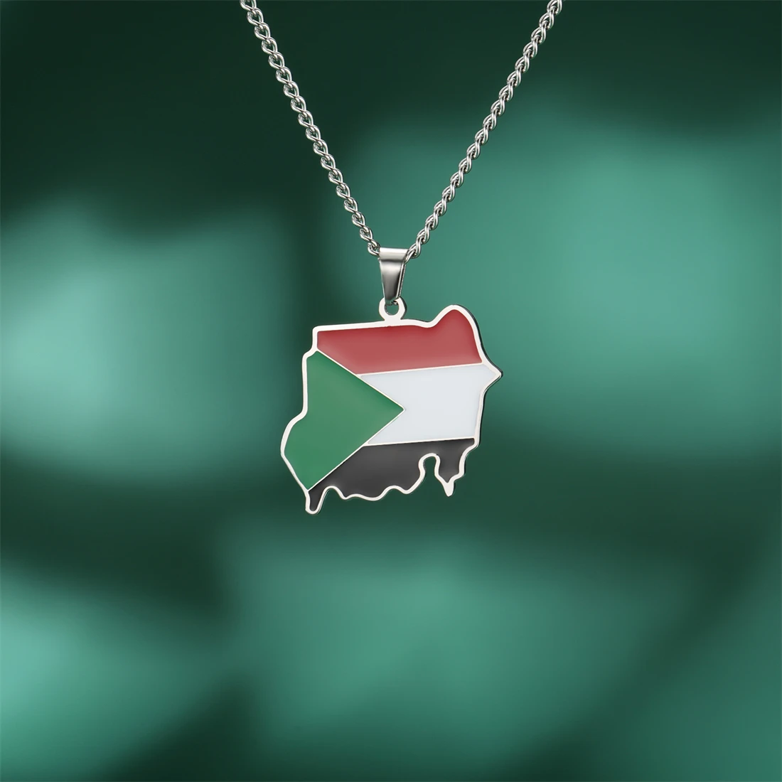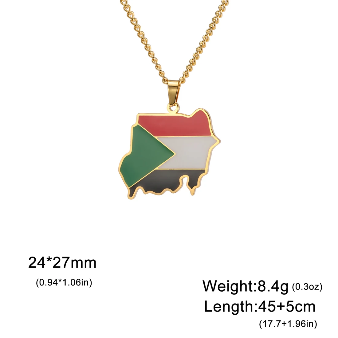 - The pendant is a geometric, map-shaped replica of Sudan with a size of 24mm x 27mm, vividly illustrating the national flag's colors including red, white, black, and green.