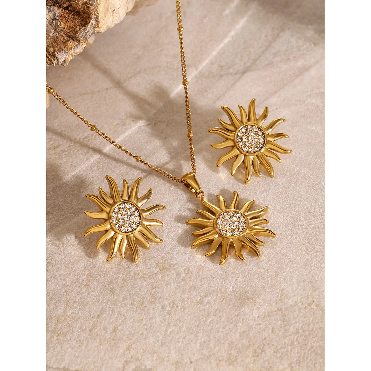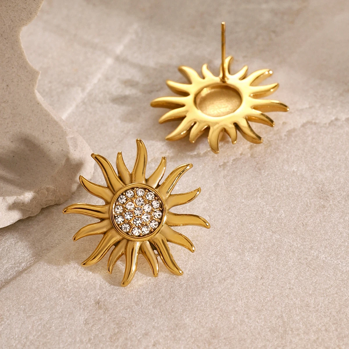 Step into the spotlight with these this stunning set of stainless steel stud earrings. Designed with a radiant sunburst motif, they feature a polished gold-tone finish that exudes warmth and elegance. The circular center is encrusted with sparkling cubic zirconia stones, creating a dazzling effect that catches the light beautifully. Perfect for daily wear or special occasions, these earrings enhance any outfit with their trendy yet refined look. Crafted from durable, waterproof stainless steel with PVD gold coating, they promise long-lasting color and resistance against scratches or fading. Comfortable and stylish, they are ideal for women seeking versatile jewelry that combines beauty with practicality.