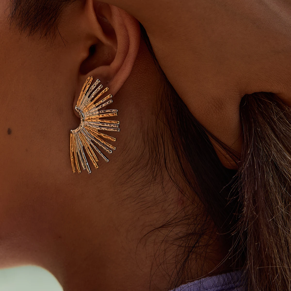 Experience the striking appeal of this contemporary jewelry piece, perfect for adding a unique touch to your style. These earrings feature a modern, sunburst-inspired design, resembling a semi-circular fan with radiating, elongated bars. Crafted from durable stainless steel, they boast a dual-tone finish with shiny gold and silver hues, creating a stunning layered effect. The polished, metallic surfaces reflect light beautifully, highlighting their geometric and trendy shape. Designed as stud earrings with a secure screw-back fastening, they are ideal for women seeking fashionable accessories that stand out. Their round shape and sunflower motif make them perfect for casual or sophisticated outfits, elevating your everyday look effortlessly.