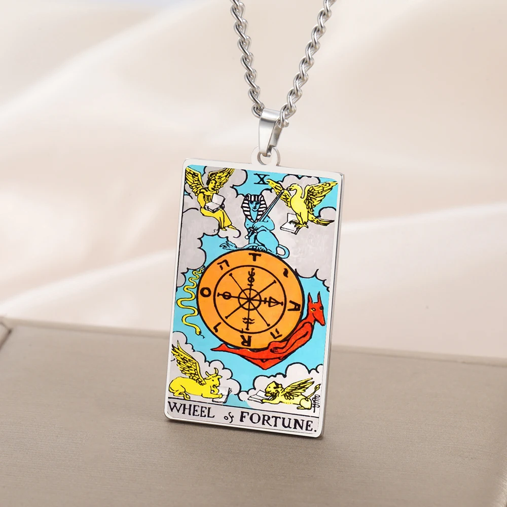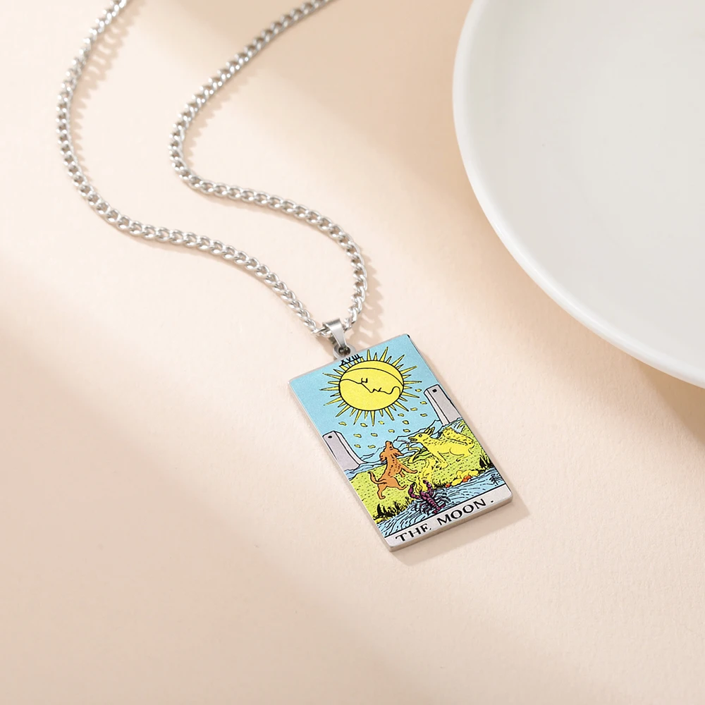 Embrace mystical elegance with this stainless steel pendant necklace featuring a vibrant, full-color UV-printed tarot card design measuring 24×40 mm. Available in sleek steel or gold-tone options, the pendant showcases intricate illustrations of iconic tarot motifs such as The Moon, The Sun, The Magician, and more, with laser-engraved details that resist fading, tarnishing, and wear. Paired with a 60 cm link chain, this unisex accessory is perfect for special occasions or everyday spirituality. Its modern, polished finish highlights the colorful imagery and mystical symbolism, making it a durable, captivating piece for any collector or enthusiast seeking to express their unique style.