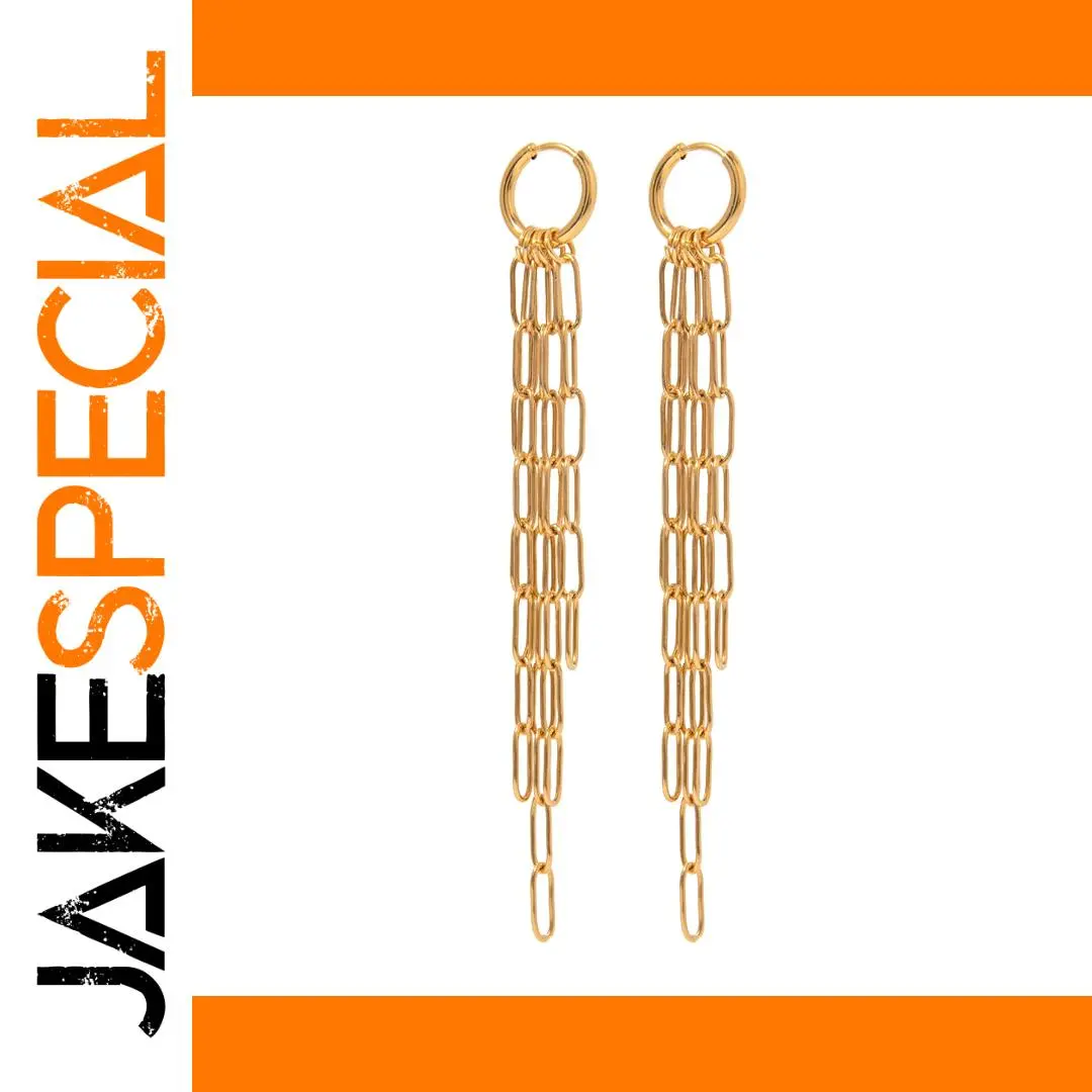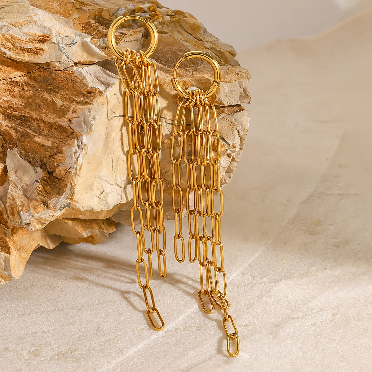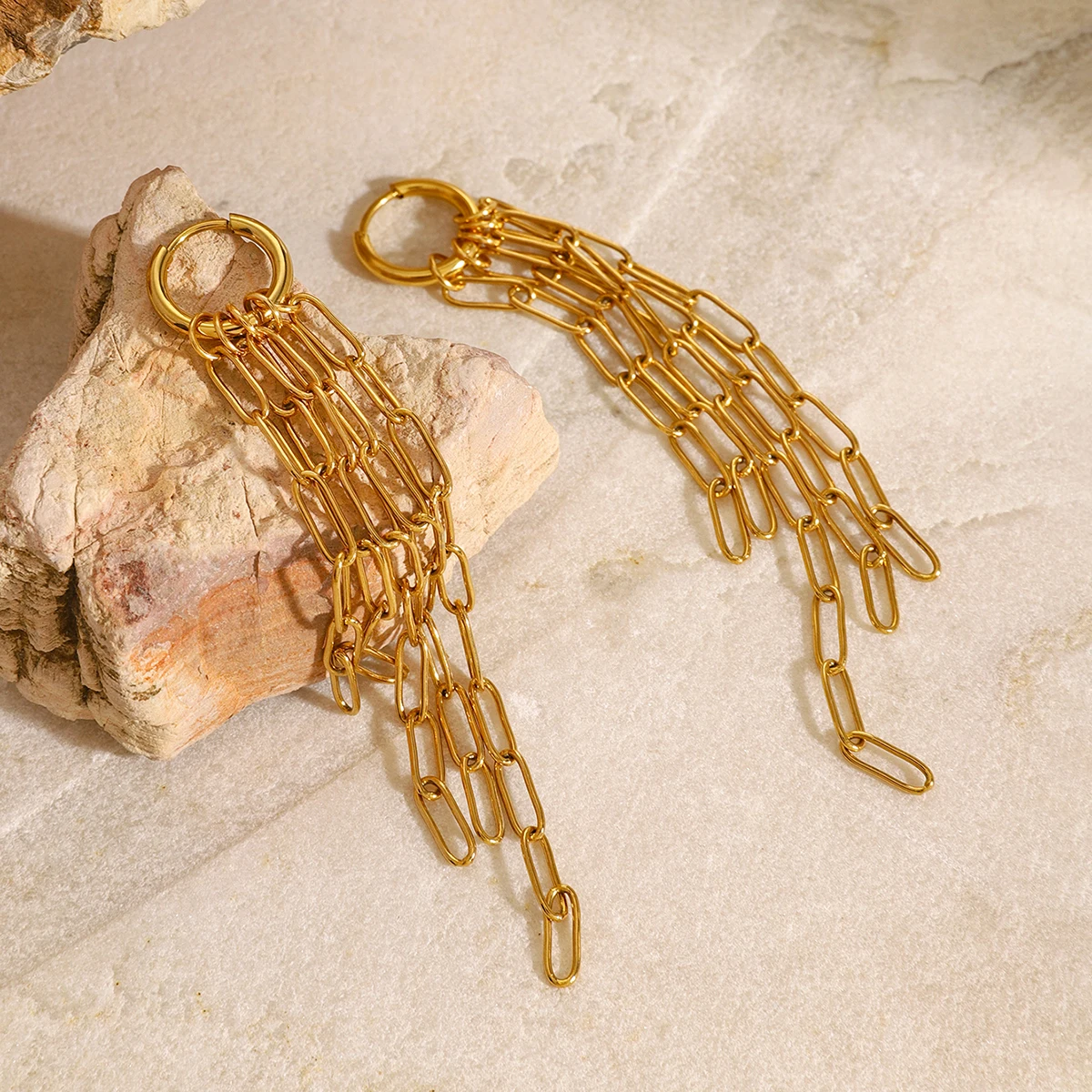 Step into modern sophistication with these beautiful stainless steel tassel earrings. Crafted with a stunning gold-tone finish, they feature a small circular hoop for easy pierced attachment. From the hoop, a series of smooth, polished elongated oval links hang in a straight, tassel-like pattern, creating a dynamic, flowing effect. The interconnected links form an irregular, yet balanced pattern that adds intrigue and movement, perfect for elevating any outfit. Designed for daily wear or special occasions, these earrings combine durability, elegance, and comfort. Waterproof and hypoallergenic, they are safe for sensitive skin and resistant to tarnishing. These earrings offer a chic, resilient accessory that makes a stylish statement effortlessly.
