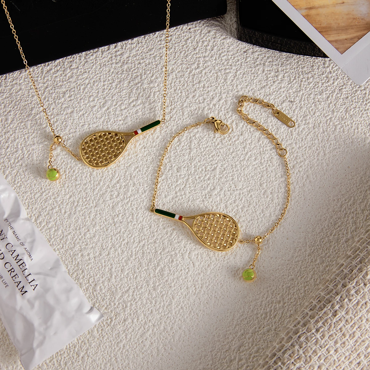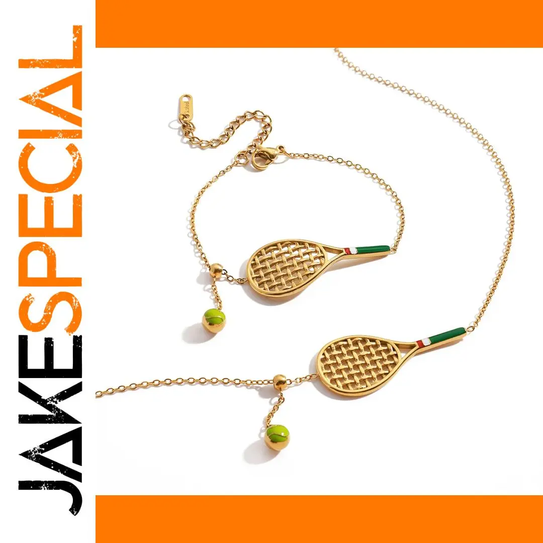 Imagine elevating your style with this exquisite jewelry set that balances sporty charm and luxurious appeal. Crafted from durable stainless steel with a shiny gold-tone finish, this set features a delicate, adjustable necklace and bracelet. Both pieces showcase miniature tennis rackets with intricate lattice net patterns, highlighted by vibrant green and red handle accents. Bright green spherical charms add a playful yet sophisticated touch, perfect for casual outings, sporty events, or fashionable parties. The fine, slender chains provide a refined look, while the lobster clasp closures ensure a secure, comfortable fit. This set promises to make you stand out effortlessly, blending energetic sport motifs with timeless elegance for all occasions.