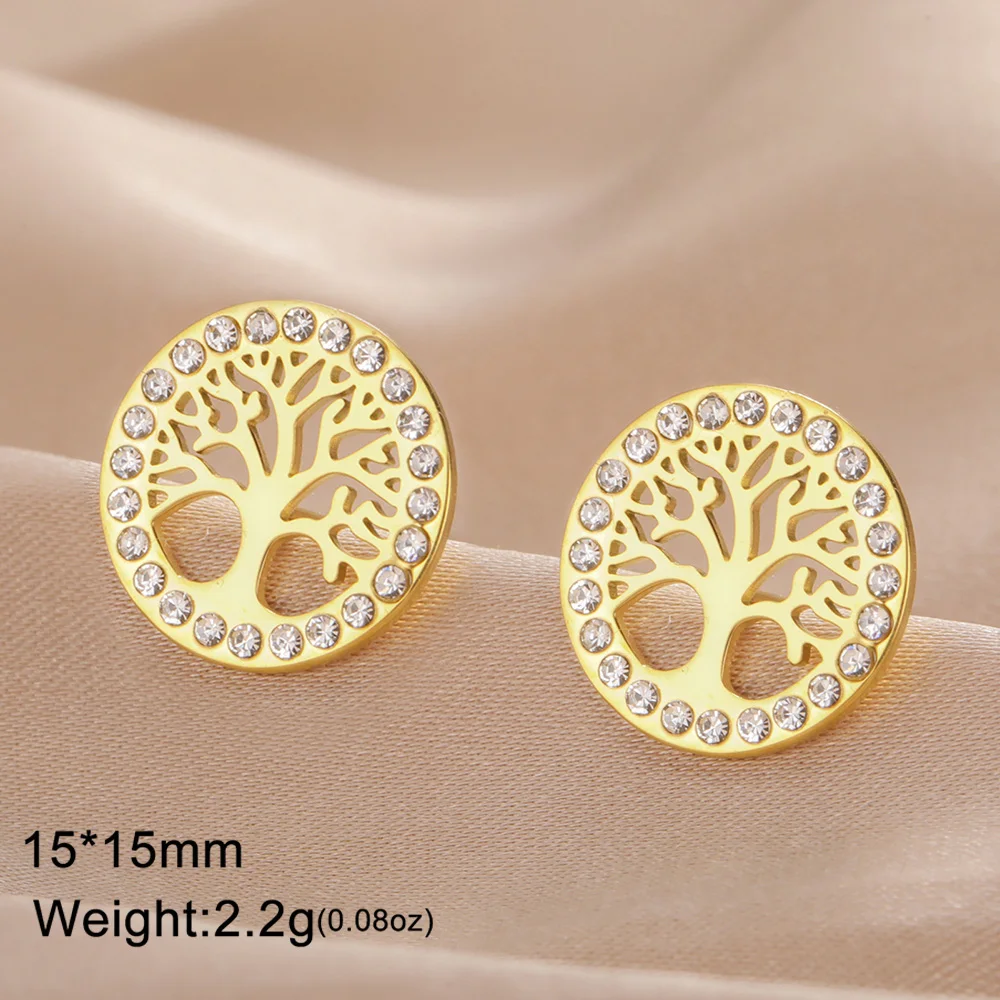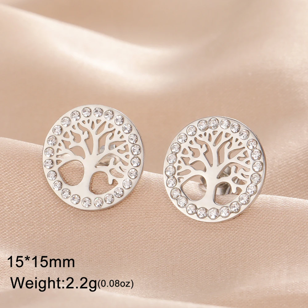 - Round stud earrings measure either 12×12 mm or 15×15 mm, featuring a detailed Tree of Life Celtic design with zirconia accents.