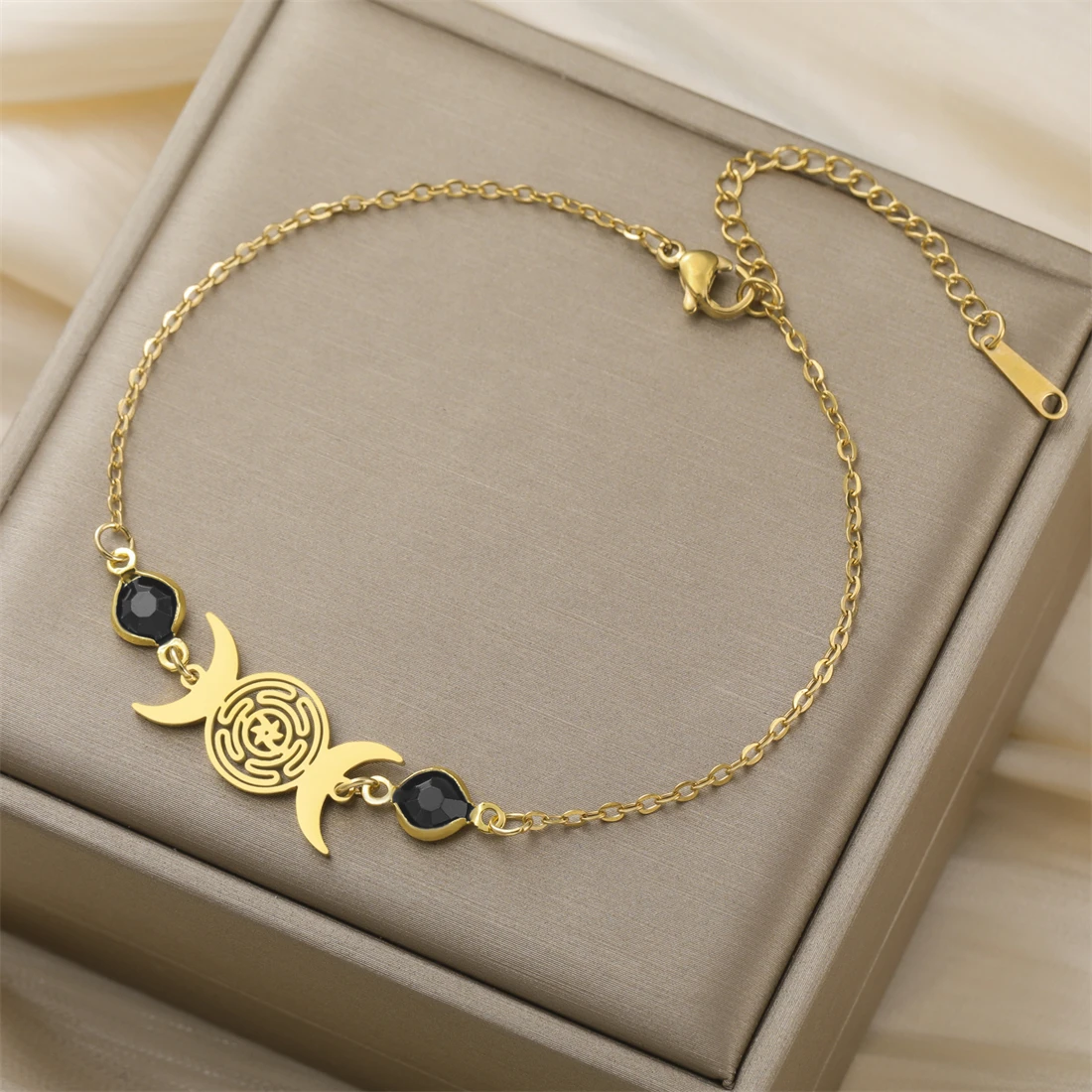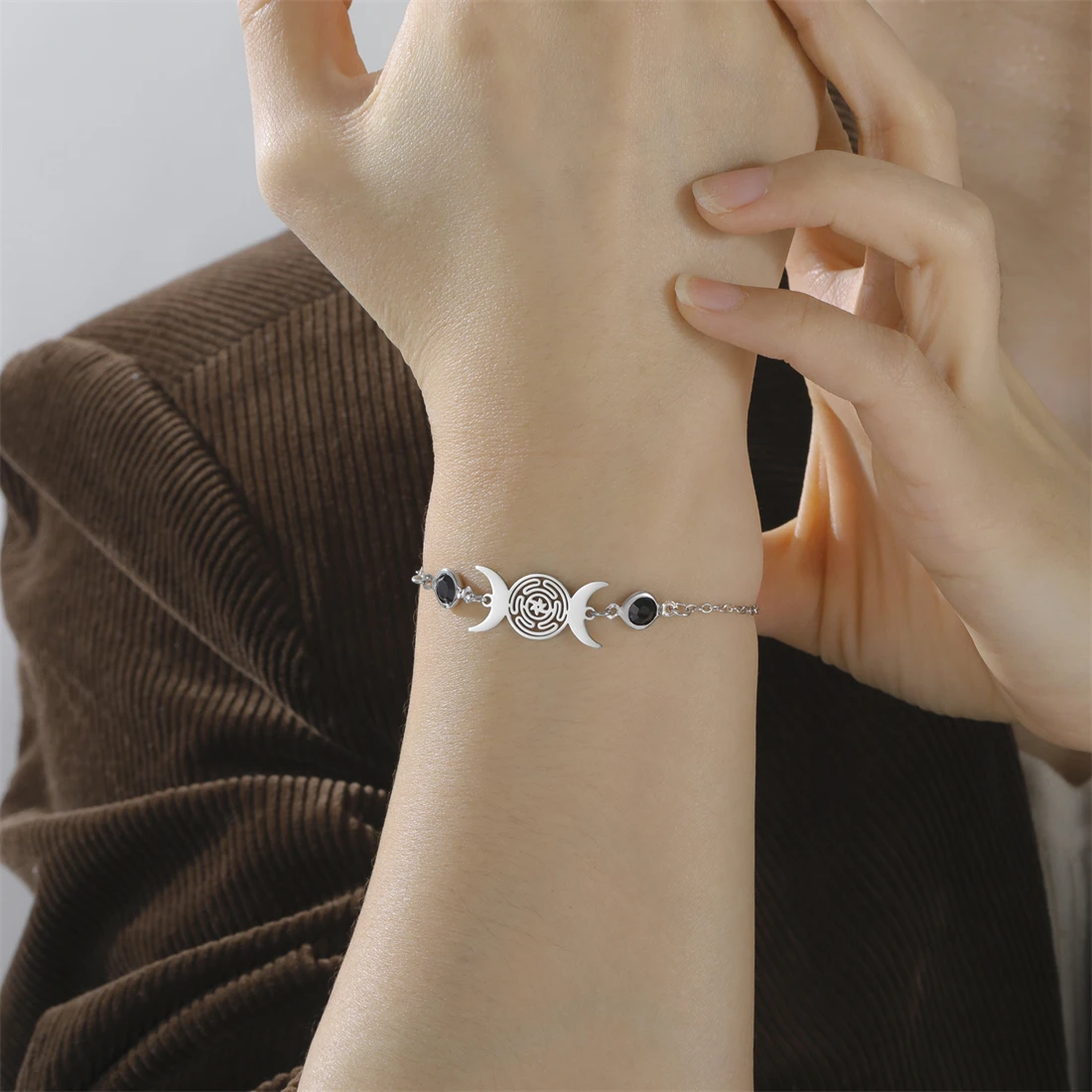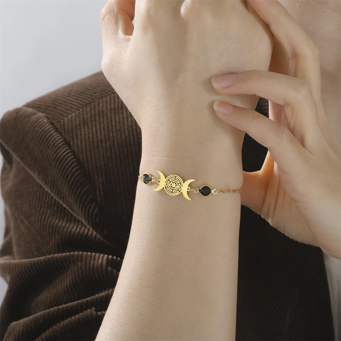 Experience the timeless beauty of this vintage-inspired stainless steel bracelet, perfect for those who cherish symbols of femininity and mysticism. Crafted with a delicate, link chain in your choice of silver or gold, it offers a polished, elegant finish suitable for everyday wear or special occasions. The centerpiece is a beautifully detailed pendant, measuring approximately 23mm by 11mm, featuring a maze pattern flanked by two crescent moons that symbolize the Triple Moon Goddess. Its versatile, minimalist design adds a touch of bohemian charm and spiritual significance to any outfit. Lightweight yet durable, this bracelet combines fashion with function, making it a meaningful gift or personal staple in your jewelry collection.