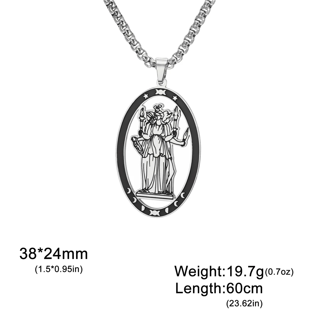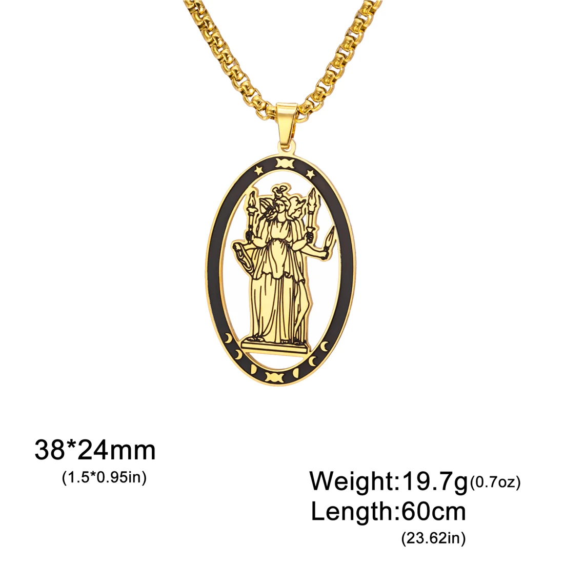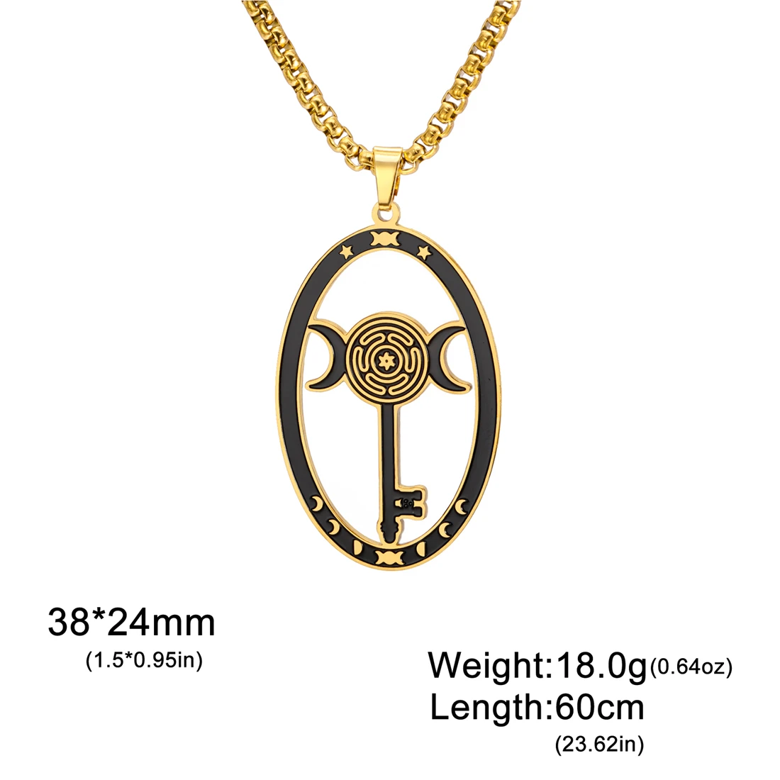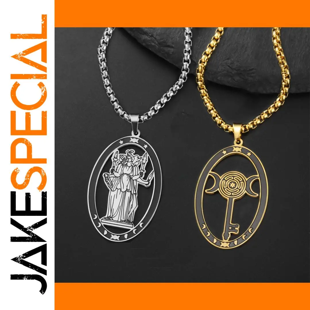 Discover the elegance and mystical charm of this stainless steel triple moon goddess necklace. Crafted with polished precision, it features an elongated oval pendant measuring 38x24mm, available in stunning silver and gold finishes. The durable 60cm box chain perfectly complements the pendant’s vintage-inspired yet minimalist design, making it suitable for various occasions like parties, birthdays, anniversaries, or weddings. With intricate symbolic motifs, the pendant showcases a mythological figure or a labyrinth pattern with mystical motifs, adding a touch of spirituality to your look. Hypoallergenic and resistant to rust, acids, and fading, this necklace is designed to last while highlighting your unique style and personality. Elevate your jewelry collection today with this versatile piece that balances elegance and symbolism effortlessly.