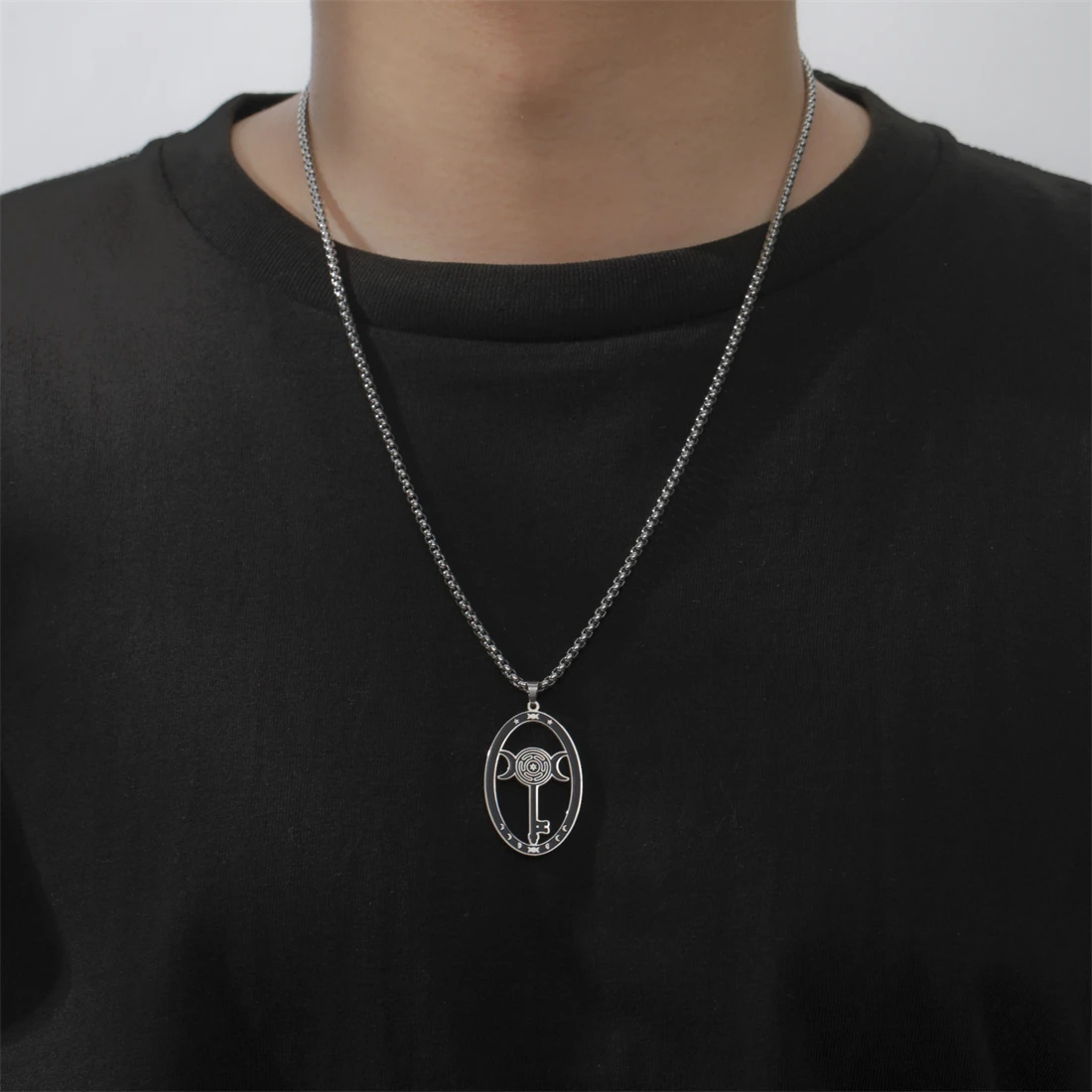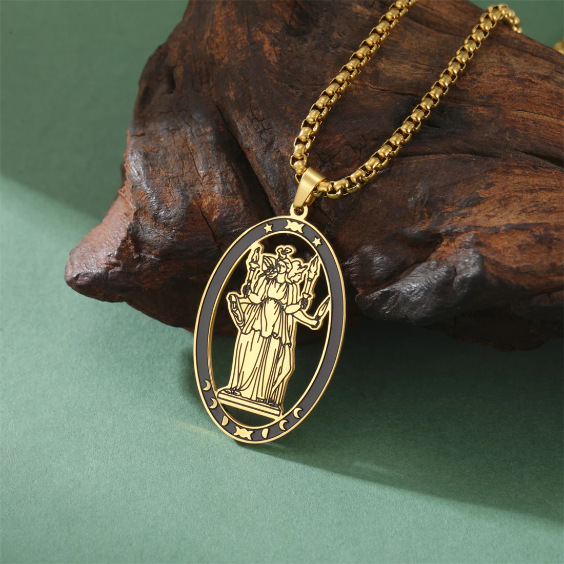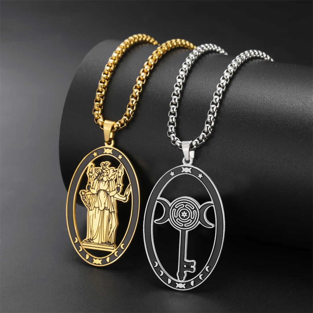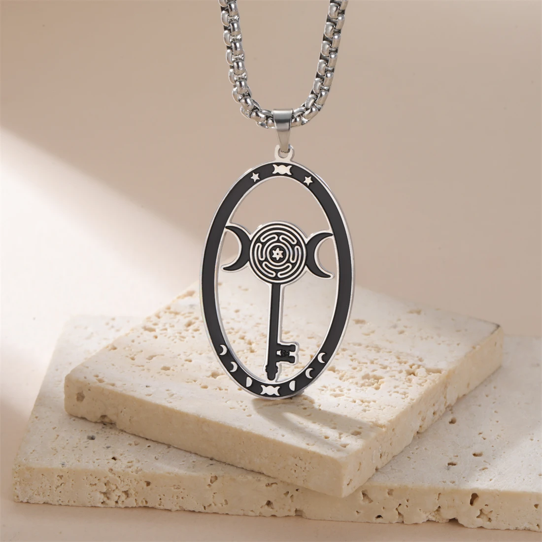 Discover the elegance and mystical charm of this stainless steel triple moon goddess necklace. Crafted with polished precision, it features an elongated oval pendant measuring 38x24mm, available in stunning silver and gold finishes. The durable 60cm box chain perfectly complements the pendant’s vintage-inspired yet minimalist design, making it suitable for various occasions like parties, birthdays, anniversaries, or weddings. With intricate symbolic motifs, the pendant showcases a mythological figure or a labyrinth pattern with mystical motifs, adding a touch of spirituality to your look. Hypoallergenic and resistant to rust, acids, and fading, this necklace is designed to last while highlighting your unique style and personality. Elevate your jewelry collection today with this versatile piece that balances elegance and symbolism effortlessly.