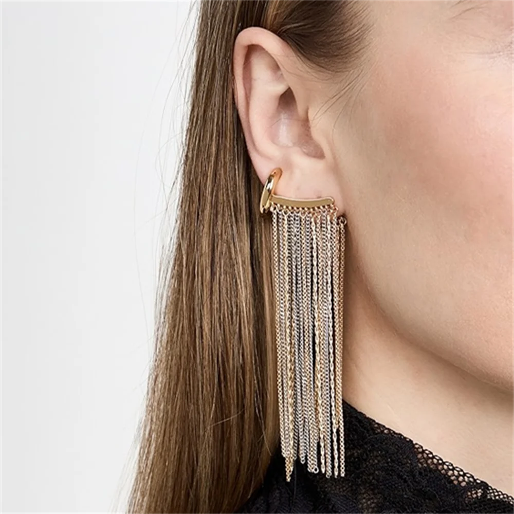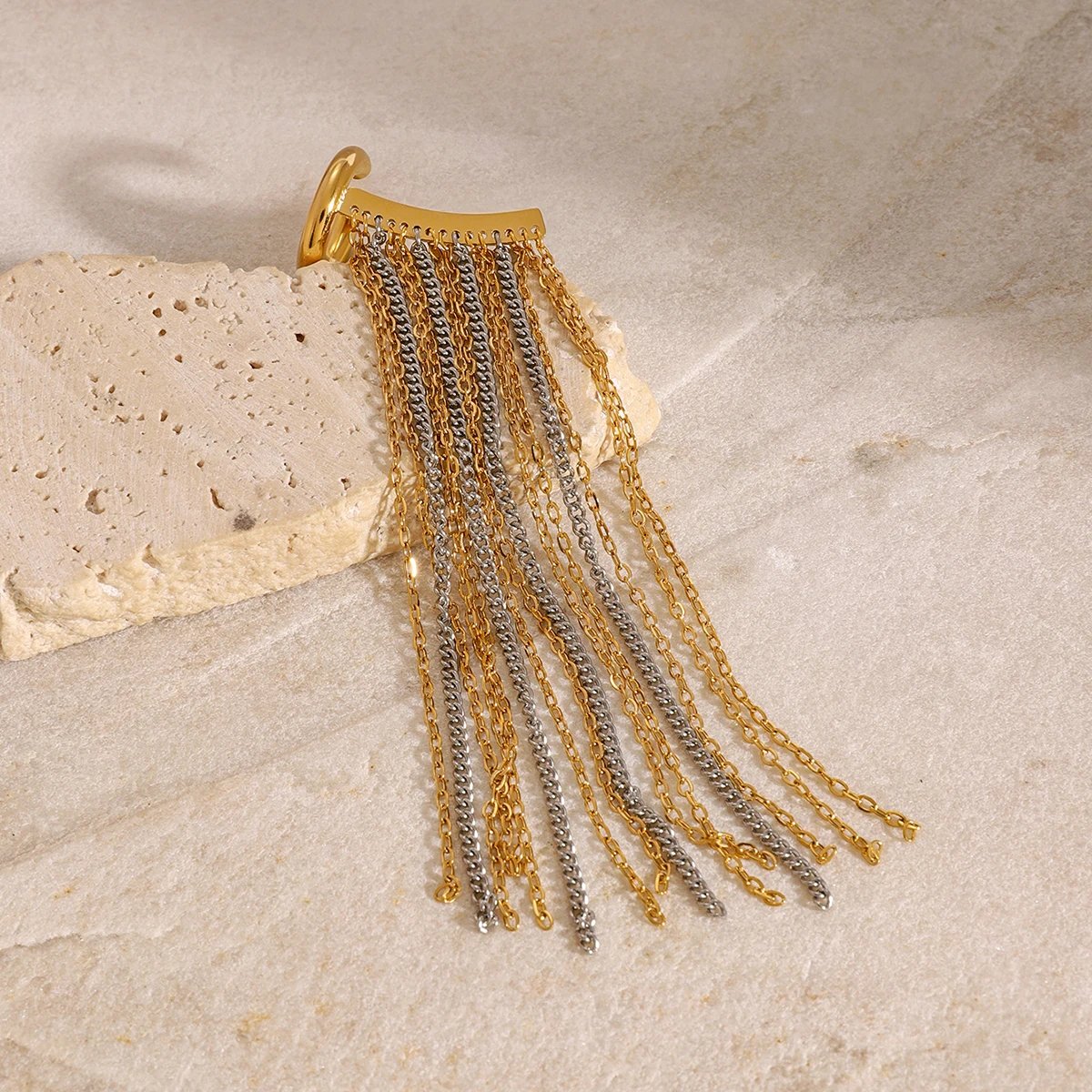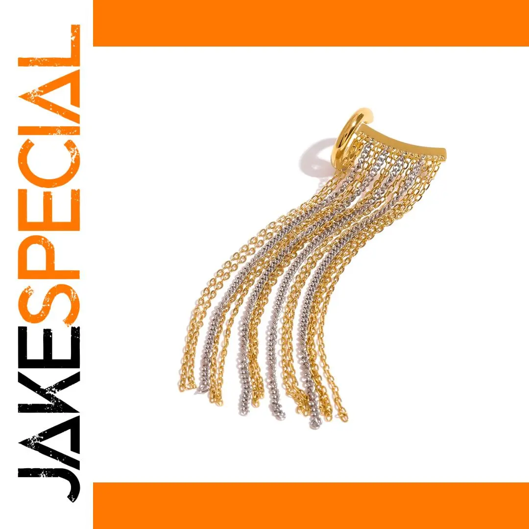 Elevate your jewelry collection with these elegant two-tone chain tassel earrings, designed to amplify your style effortlessly. Crafted from durable stainless steel, they showcase a polished gold and silver finish that exudes sophistication. The earrings feature delicate cascading chains of textured surfaces, varying in length, which create a flowing, asymmetrical tassel effect. Their irregular, elongated shape adds modern flair while ensuring a lightweight, comfortable fit. Waterproof and anti-allergic, these earrings are perfect for sensitive skin and daily wear. Whether for casual outings or special events, they bring a refined yet contemporary touch to any outfit. Embrace timeless elegance combined with practical craftsmanship with these exquisite accessories.