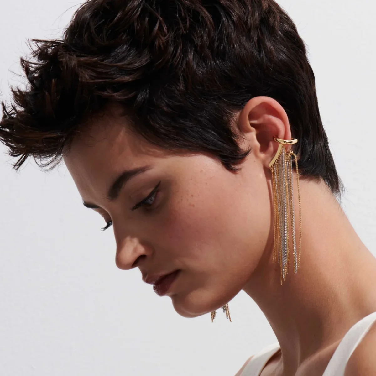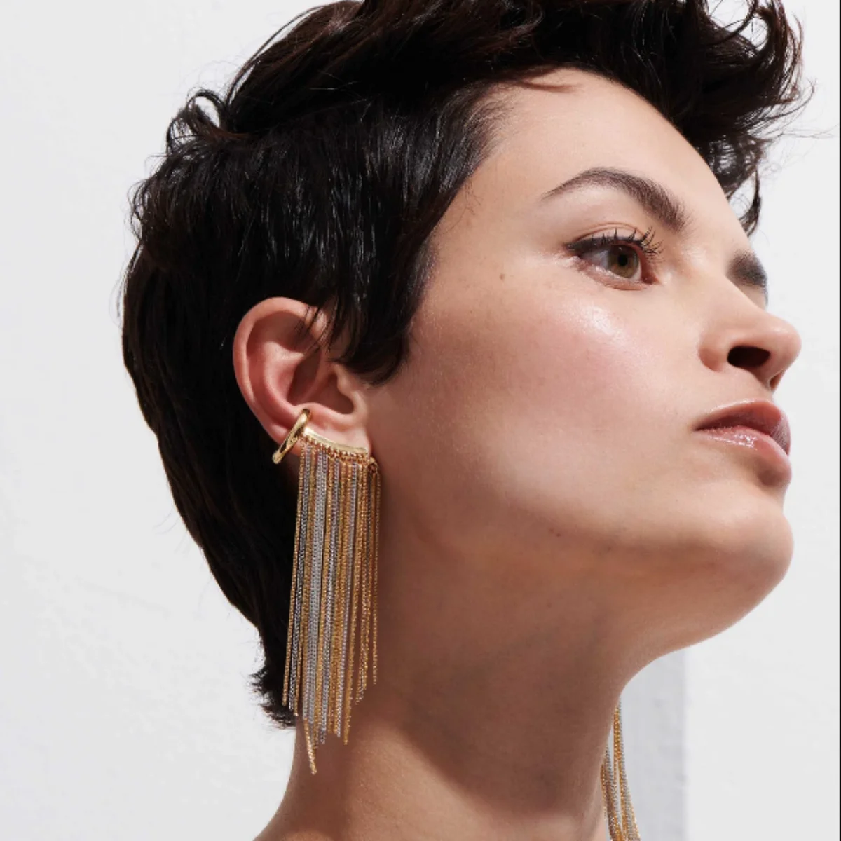 - Designed with an irregular elongated shape and cascading textured chains, providing a dynamic tassel effect that adds movement and fashion-forward appeal.
