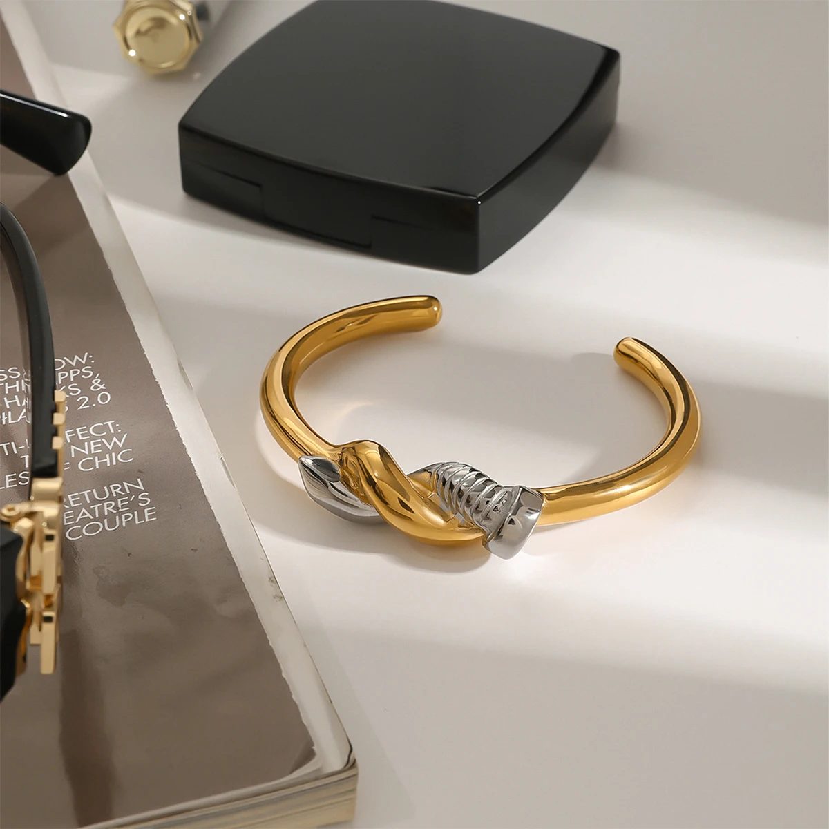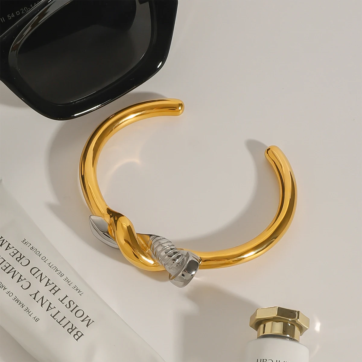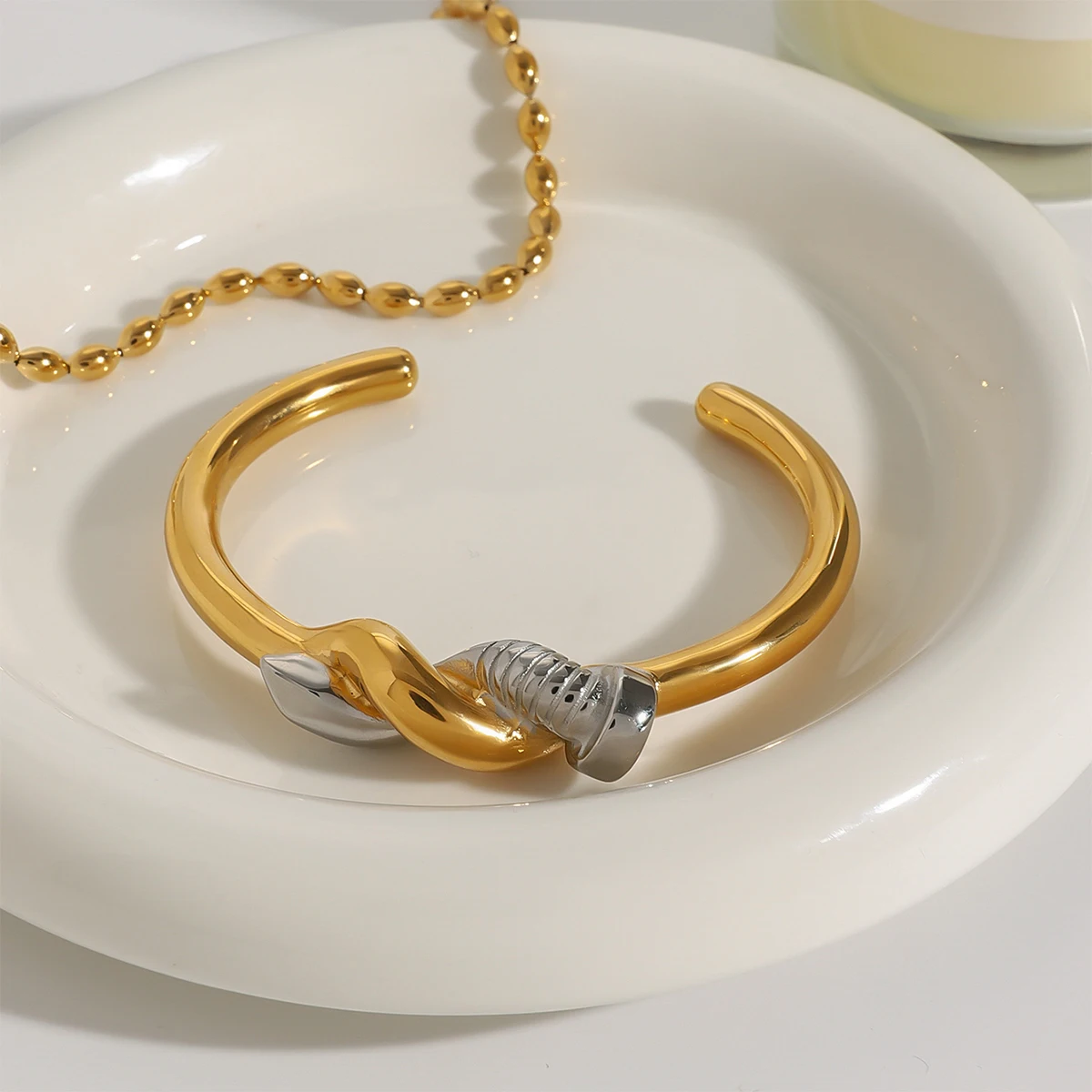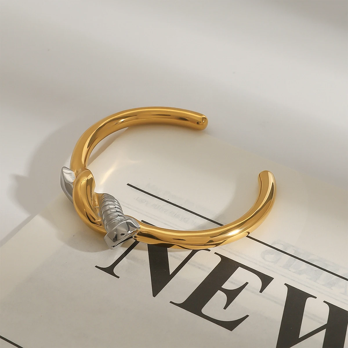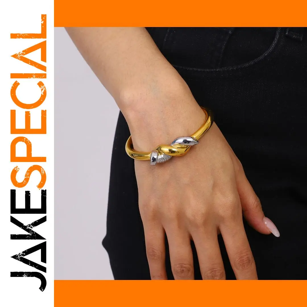 Experience the sophisticated allure of this minimalist two-tone nail bracelet, designed to elevate your style effortlessly. Crafted from durable stainless steel with a stunning PVD gold finish, it guarantees long-lasting color and resistance to scratches, ensuring your jewelry remains pristine for years. The sleek cuff style with its round intertwined pattern offers a modern yet timeless look, perfect for pairing with casual or semi-formal outfits. Weighing only 15 grams, it provides a lightweight feel that comfortably wraps around your wrist. The striking silver accent element creates a captivating contrast against the rich gold tone, adding an extra touch of elegance. Feel confident wearing this waterproof, nickel-free accessory that combines style with durability, making it an essential piece for your jewelry collection.