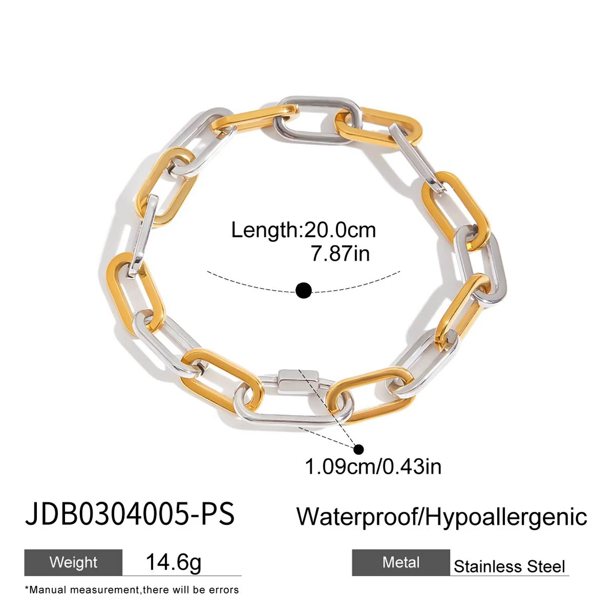 Experience modern elegance with this minimalist stainless steel two-tone necklace, model number JDN0304003-PS, featuring large elongated oval links in a geometric, stackable design. The striking contrast of gold and silver tones, combined with a polished finish, creates a sleek, reflective surface that complements any party ensemble. Crafted from high-quality stainless steel, this fashion jewelry piece is free from chemical concerns, making it both stylish and durable. Its clean, geometric aesthetic is perfect for fashion-forward women seeking a versatile accessory that adds a contemporary touch to their look, effortlessly elevating your style for any celebration or special occasion.